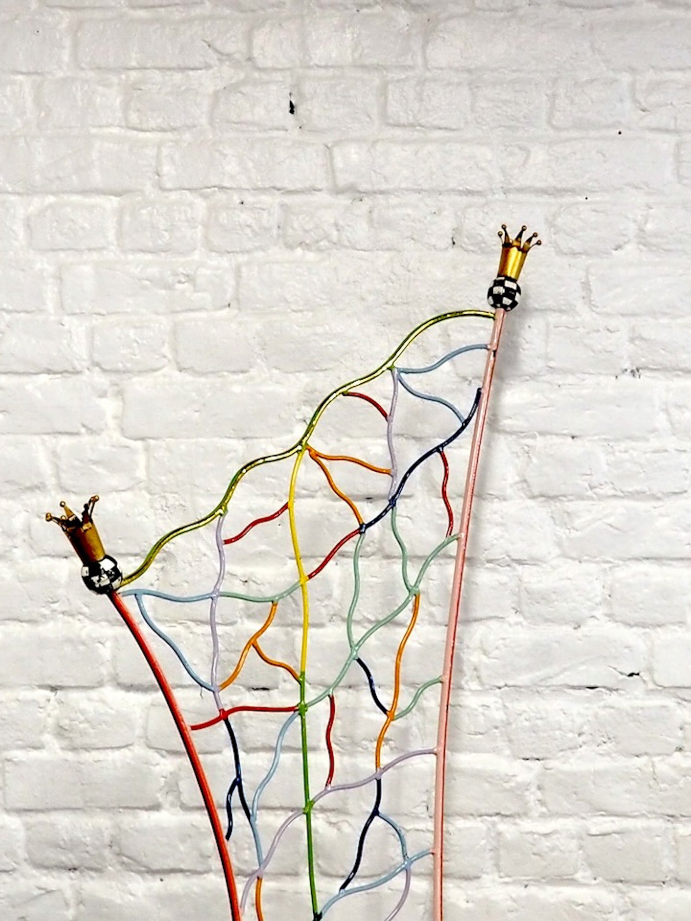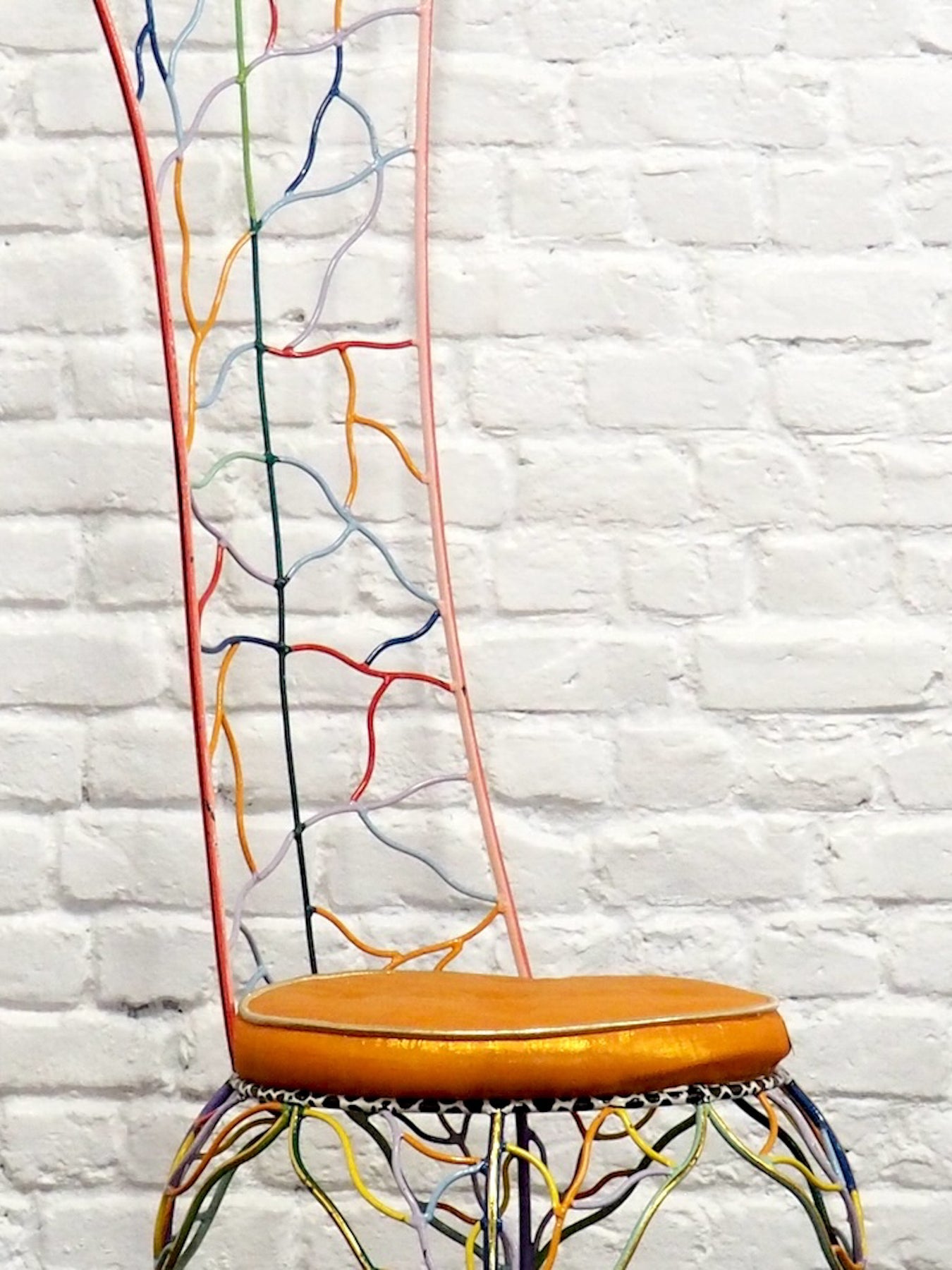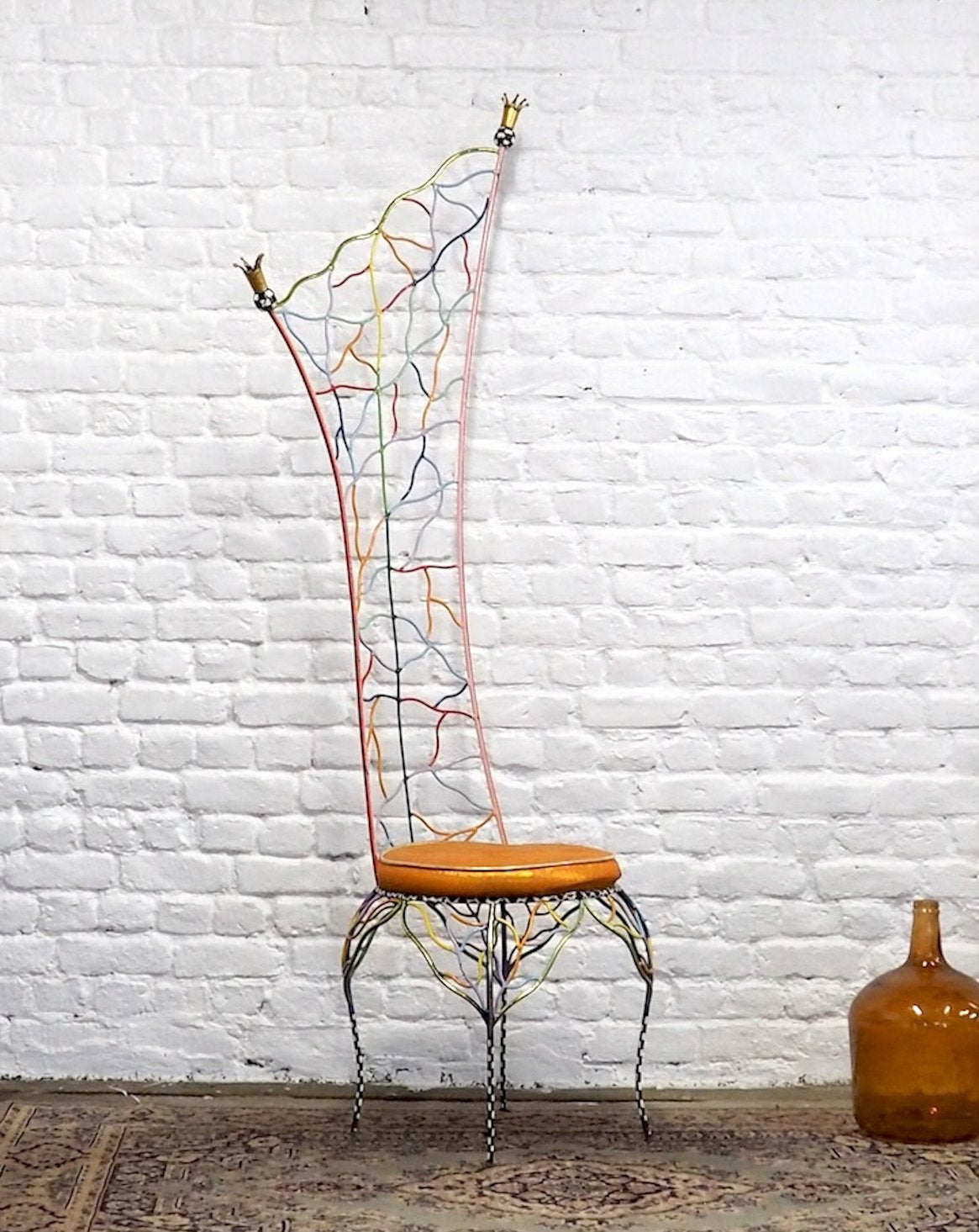Adoptez cette chaise Couronne signée Tom's Drag, modèle à double couronne qui impose sa silhouette haute et sculpturale, fidèle à l'esprit créatif des années 80. Son assise en très bon état, équipée des plaquettes Tom's Drag, combine confort et caractère, tandis que sa palette multicolore apporte une touche vive et ludique à un intérieur contemporain. Idéale comme pièce d'accent dans un salon, un bureau ou une entrée, elle invite à créer une atmosphère originale et inspirante. Quelques aspérités sur les parties métalliques.
