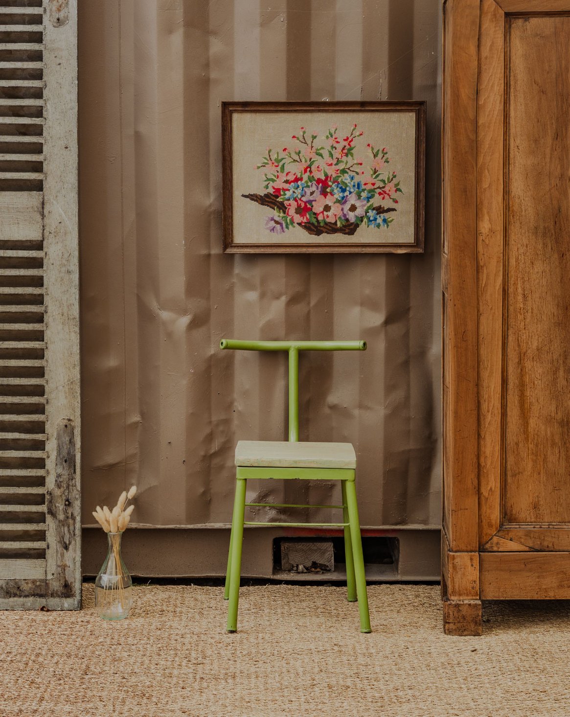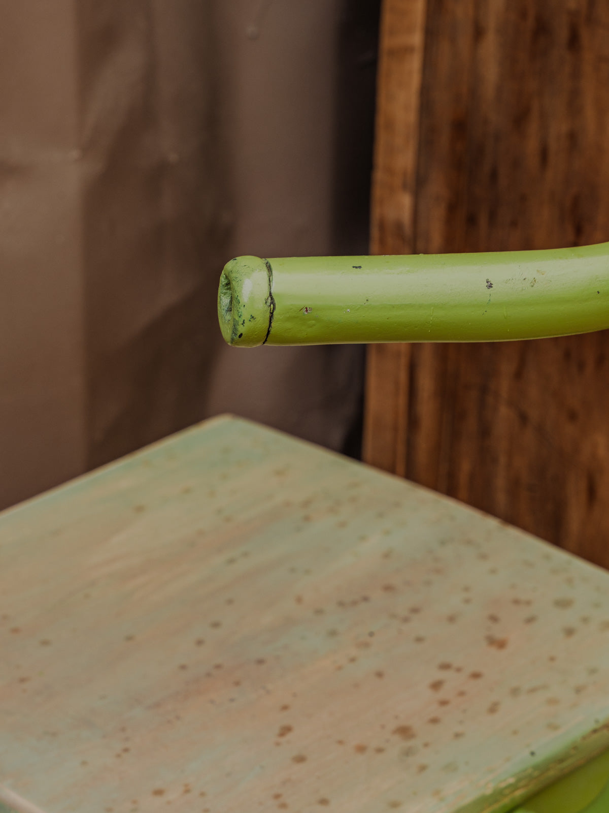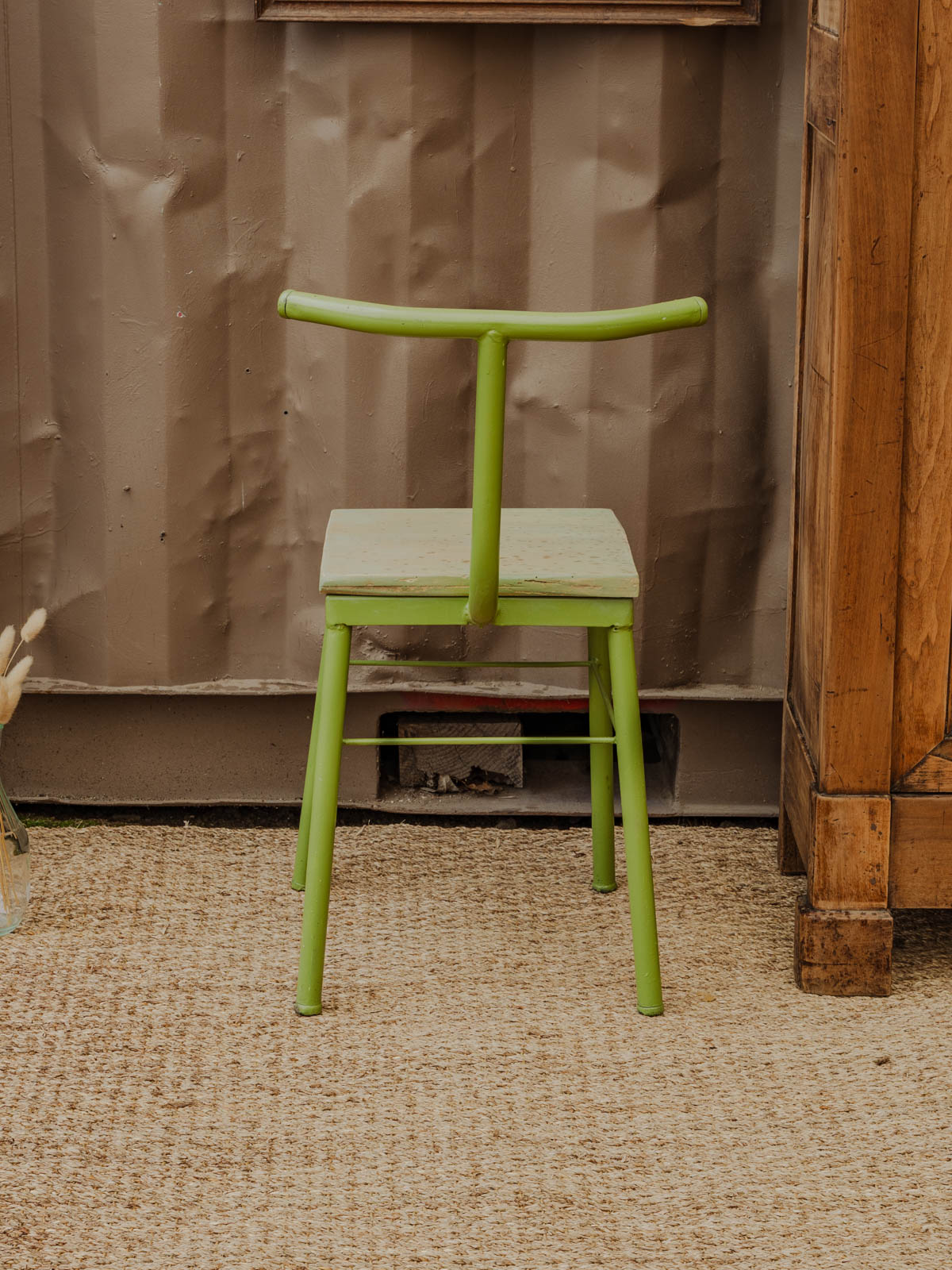 Adoptez cette chaise au charme industriel, à la structure en métal peint en vert et au plateau d'assise en bois poncé teinté de la même teinte, qui apporte une touche graphique à une salle à manger ou un coin bistrot. Sa silhouette et ses proportions s'intègrent facilement à une table ou dans un espace urbain, tandis que le mélange métal et bois mêle robustesse et chaleur. Quelques traces du temps présentes.