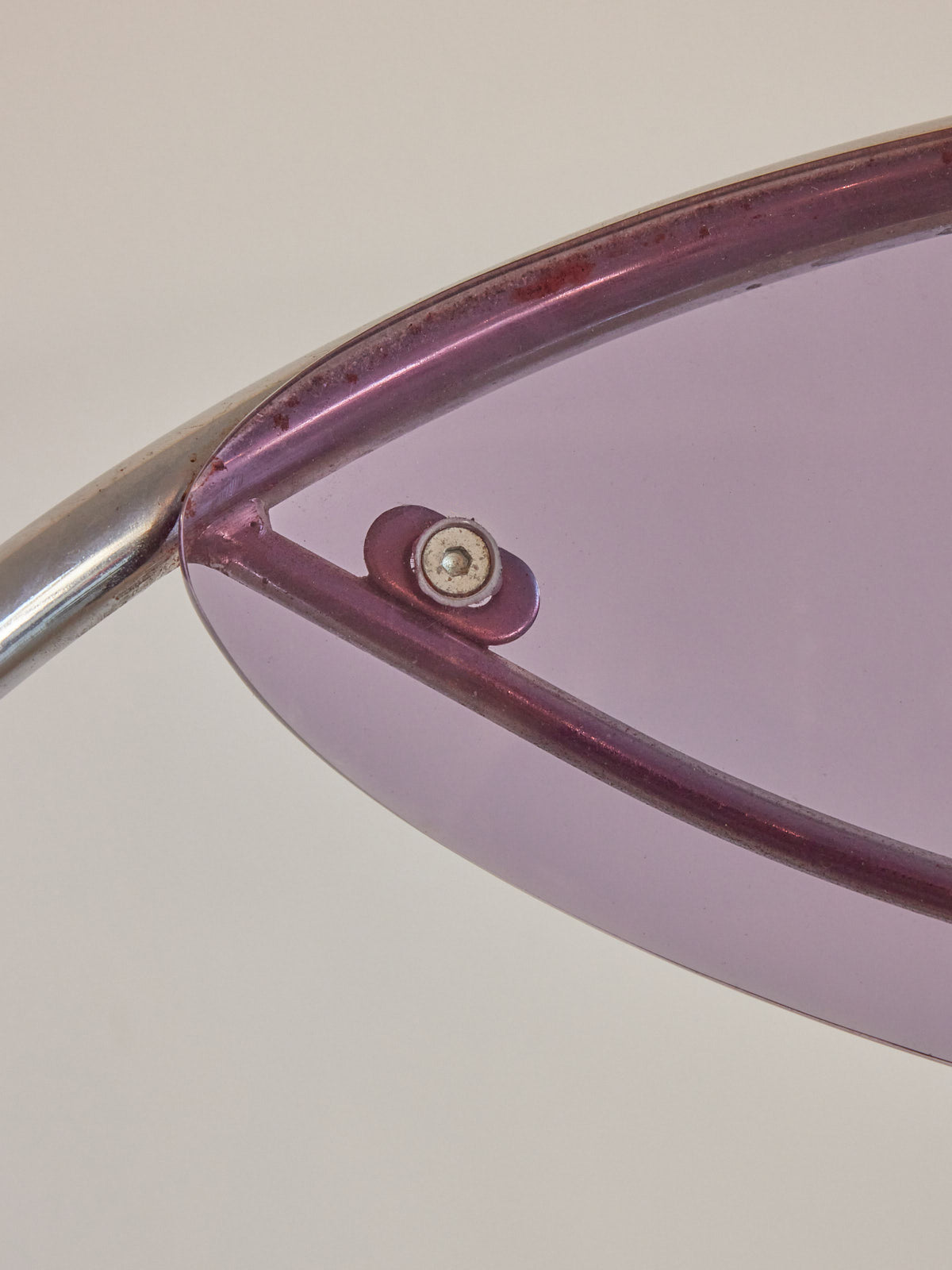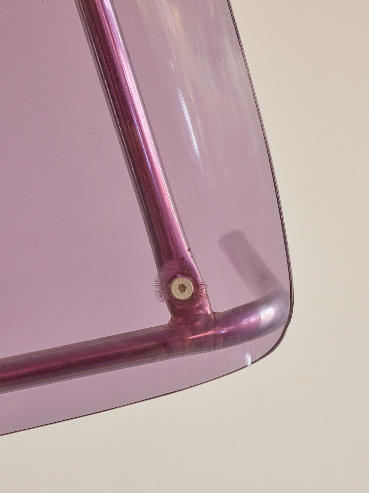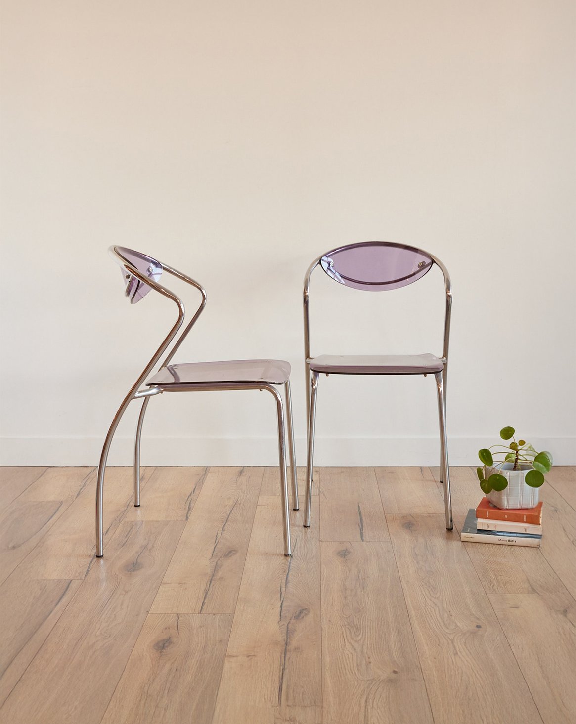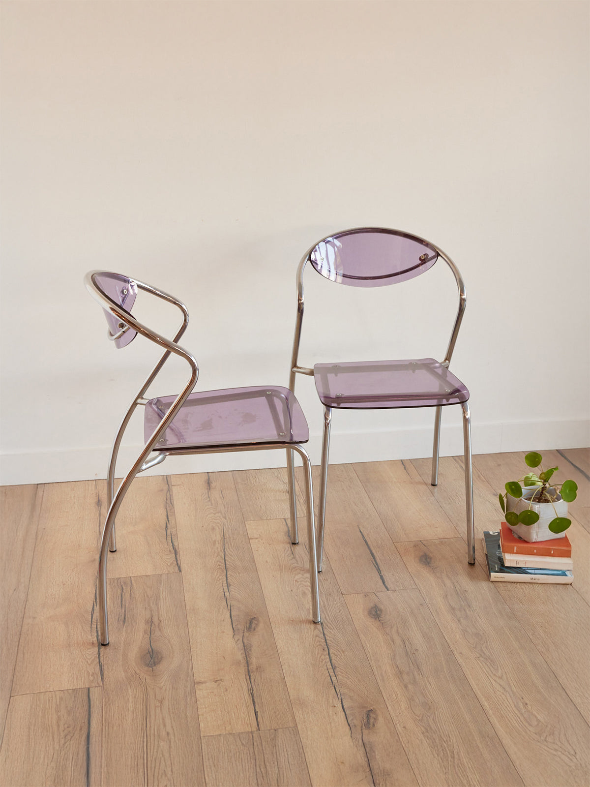 Adoptez cette paire de chaises italiennes en plastique fumé violet sur armature métal chromé, incarnation d'un design rétro à la fois graphique et élégant. Leur silhouette légère et le jeu de transparence apportent une touche colorée sophistiquée, idéale pour dynamiser une salle à manger, un bureau ou un coin lounge sans alourdir l'espace. Le contraste entre le plastique teinté et le métal poli crée une ambiance raffinée et contemporaine. Marques d'usage sur le plastique fumé d'une des chaises preuve du passage du temps.