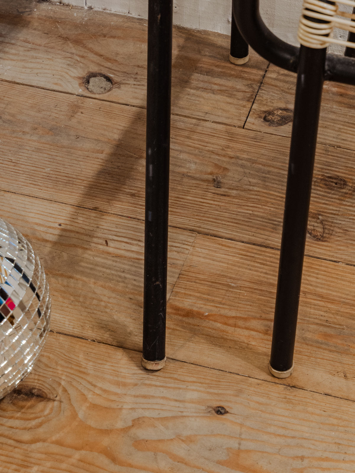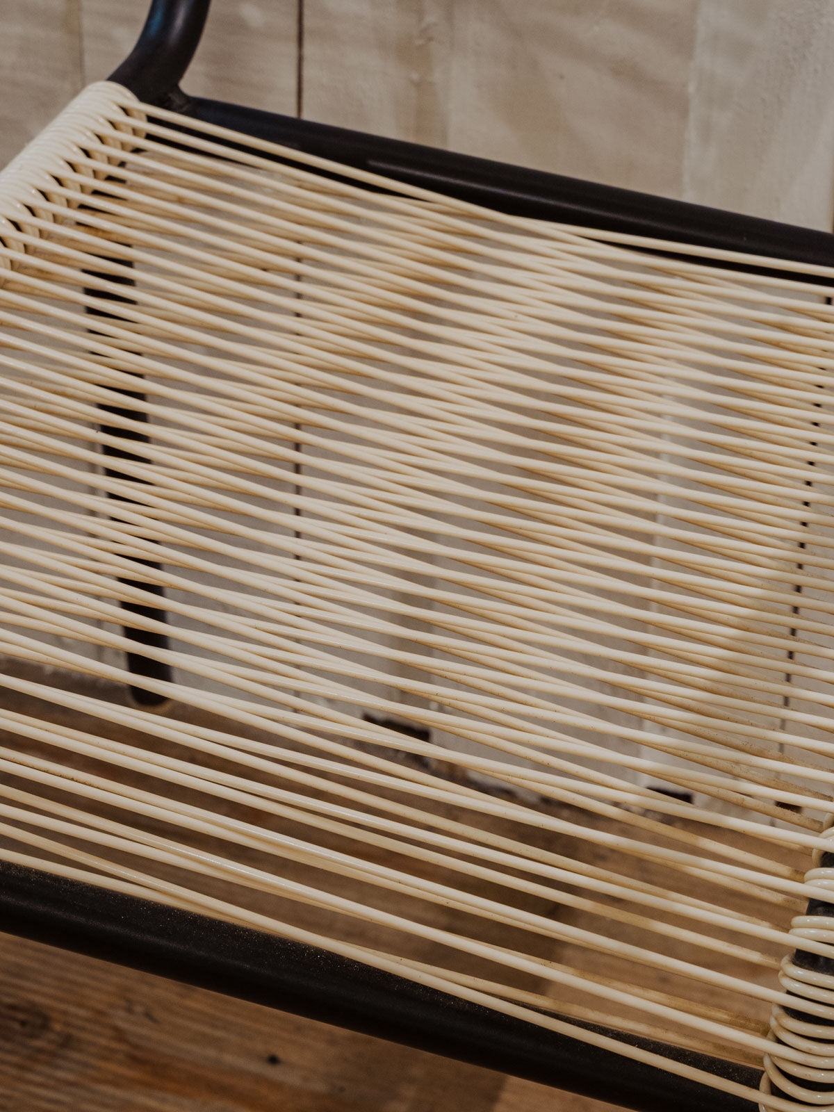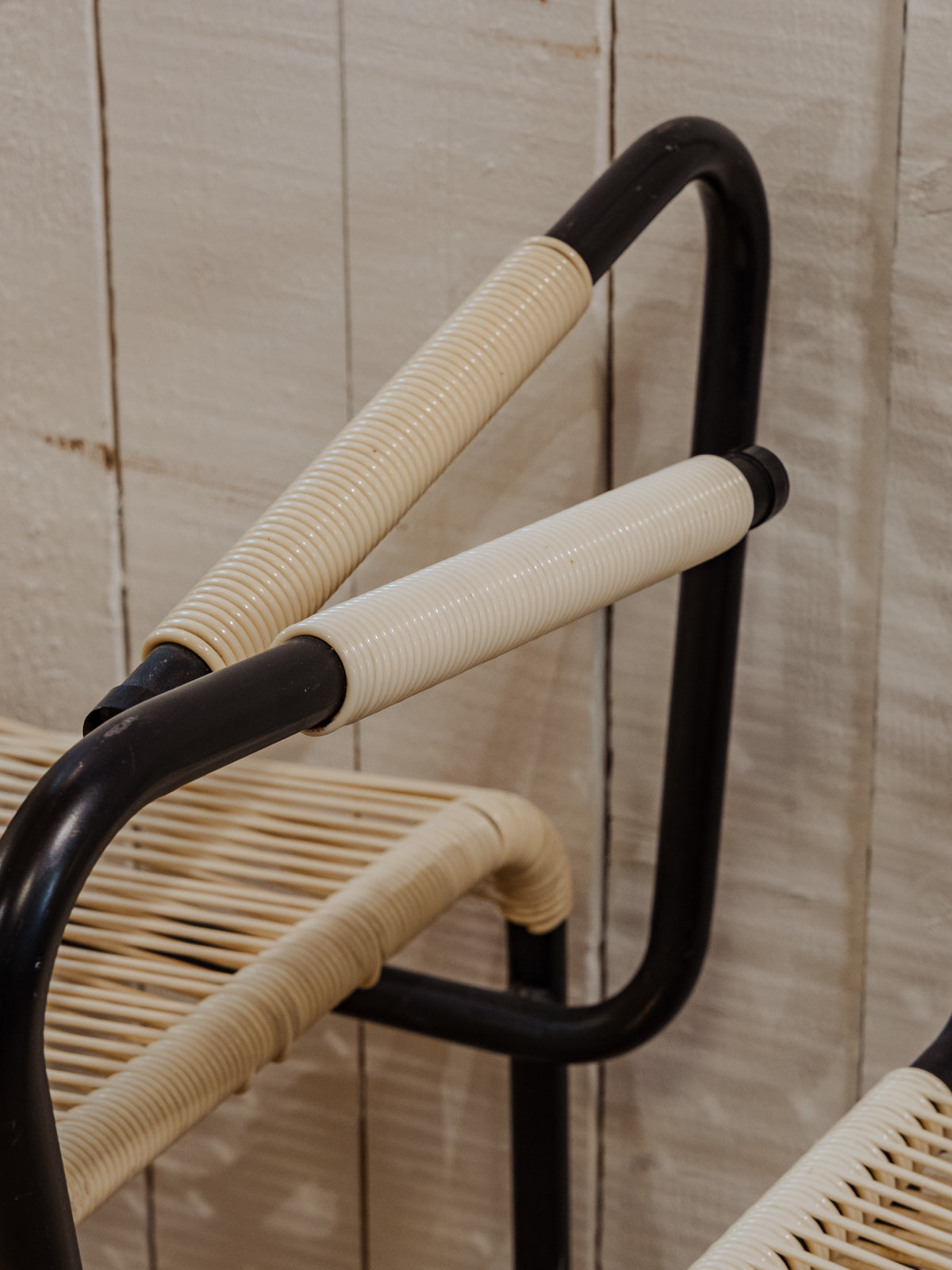 Adoptez cette paire de chaises des années 50 au charme graphique : assise et dossier en scoubidou blanc tressé reposant sur une structure métallique noire. Le contraste des matières apporte une signature rétro, tandis que leur profil et leur assise à hauteur standard assurent un confort adapté à la table de salle à manger ou à un coin repas compact. Idéales en duo pour une cuisine ou un espace bistro, elles diffusent une ambiance chaleureuse.