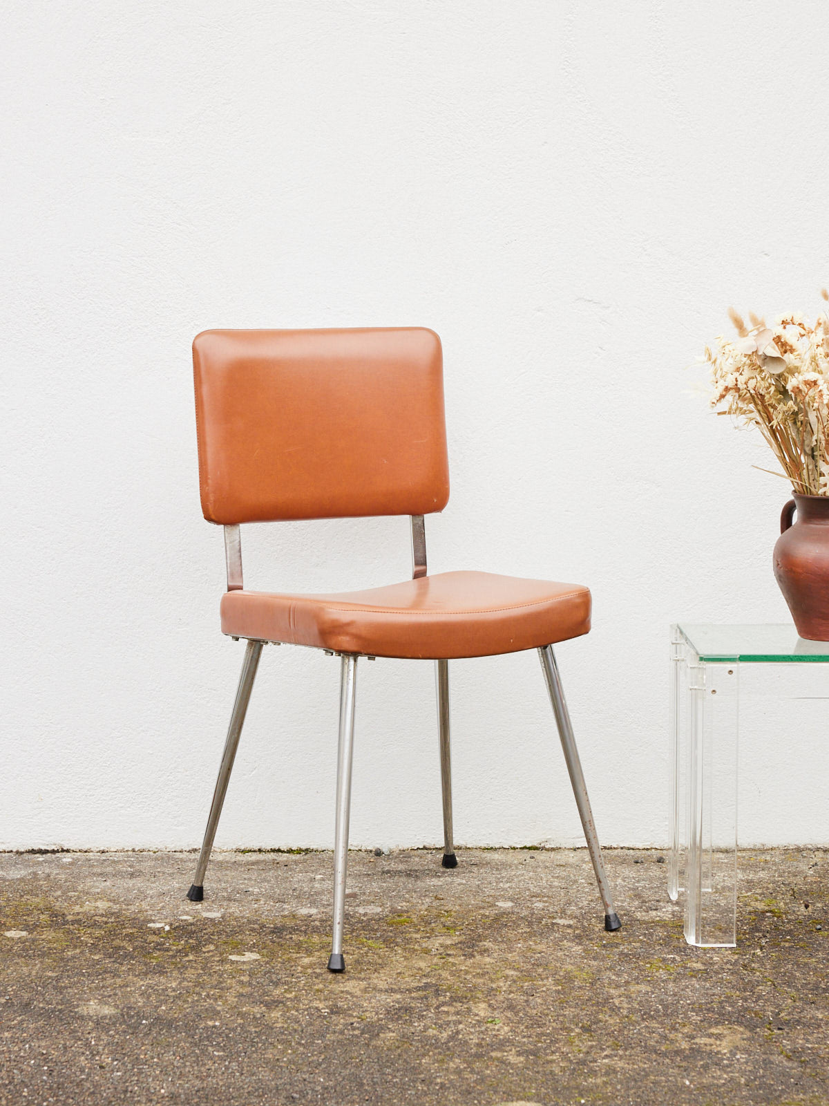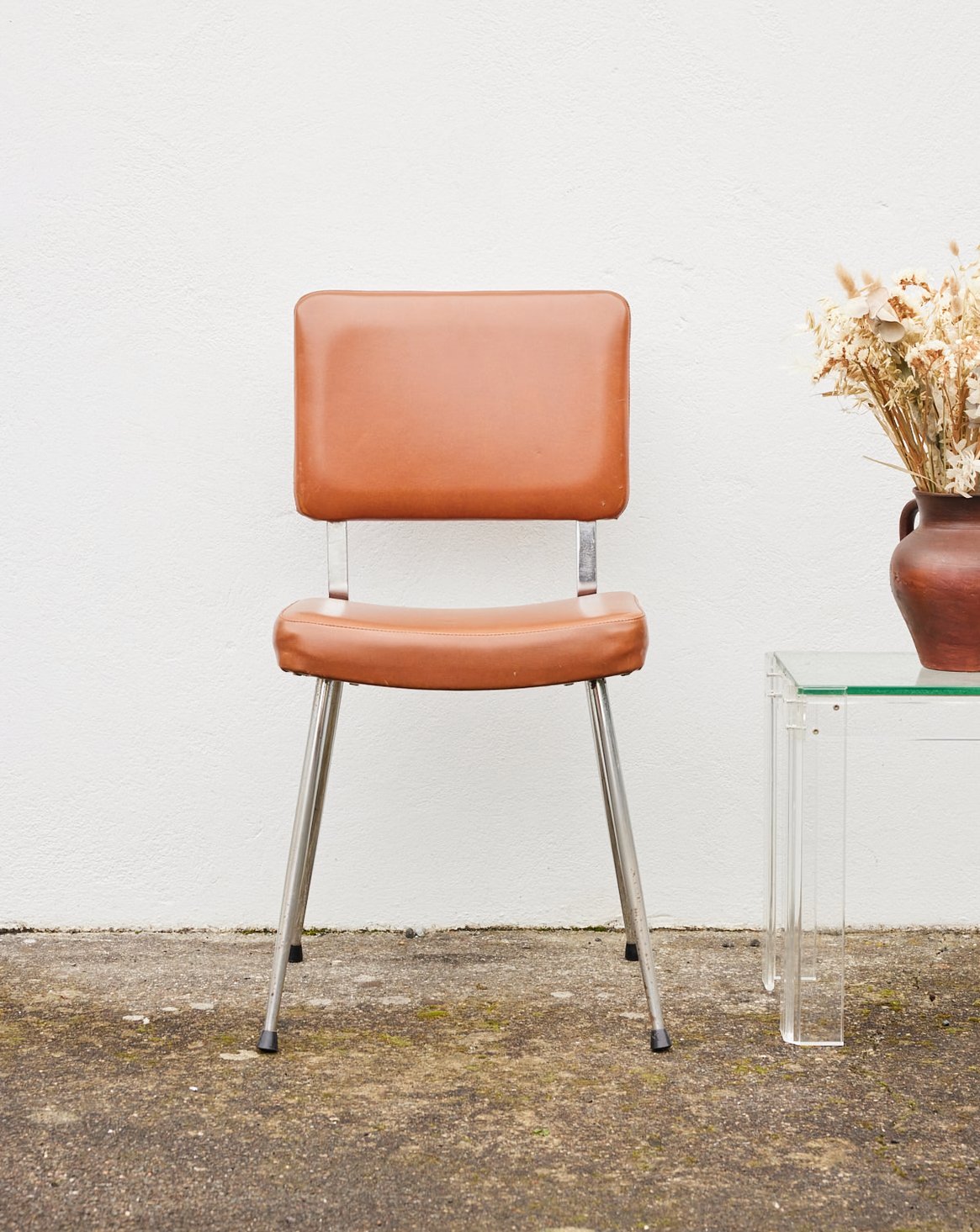 Adoptez cette chaise de bureau vintage en simili cuir marron et structure métallique chromée, au profil élégant qui habille un coin travail comme un salon avec raffinement. L'assise confortable et les proportions équilibrées invitent à de longues heures de concentration ou de lecture, tandis que le piétement chromé apporte une touche graphique et lumineuse. Idéale pour accompagner un bureau contemporain ou rétro, elle joue la carte du style sans ostentation.