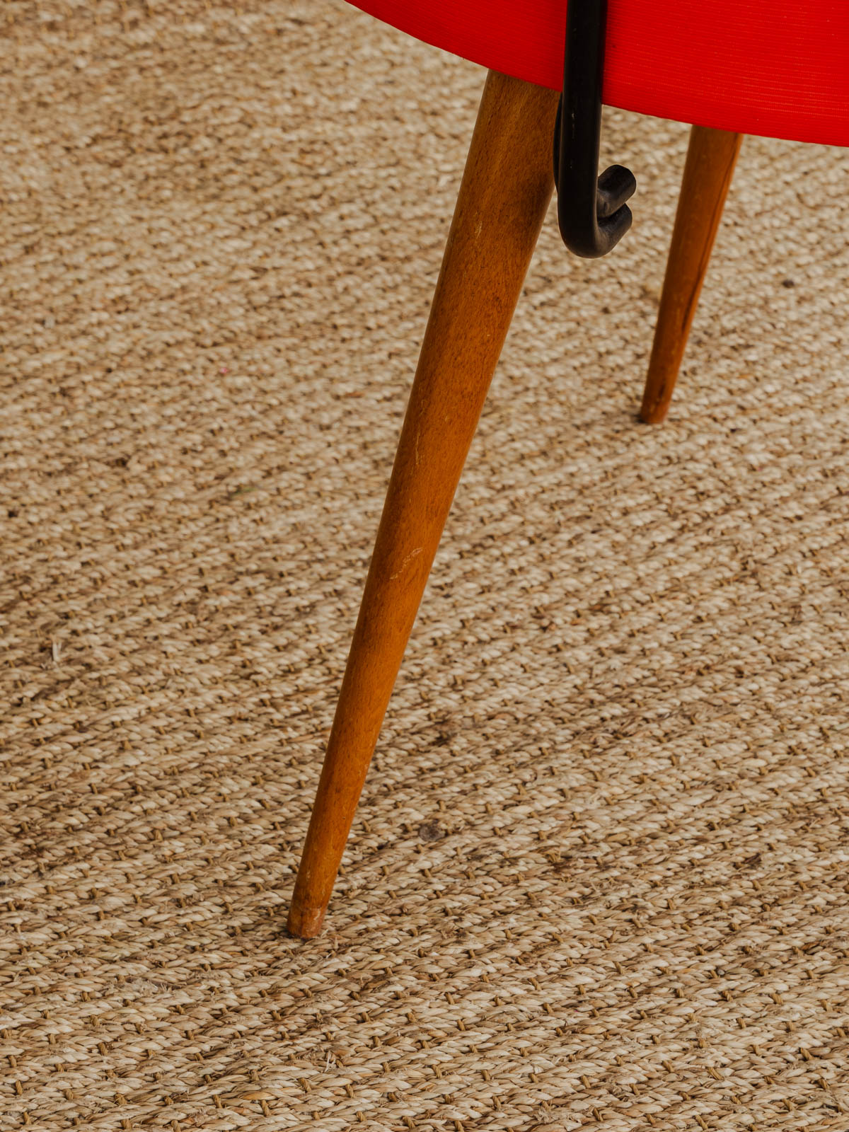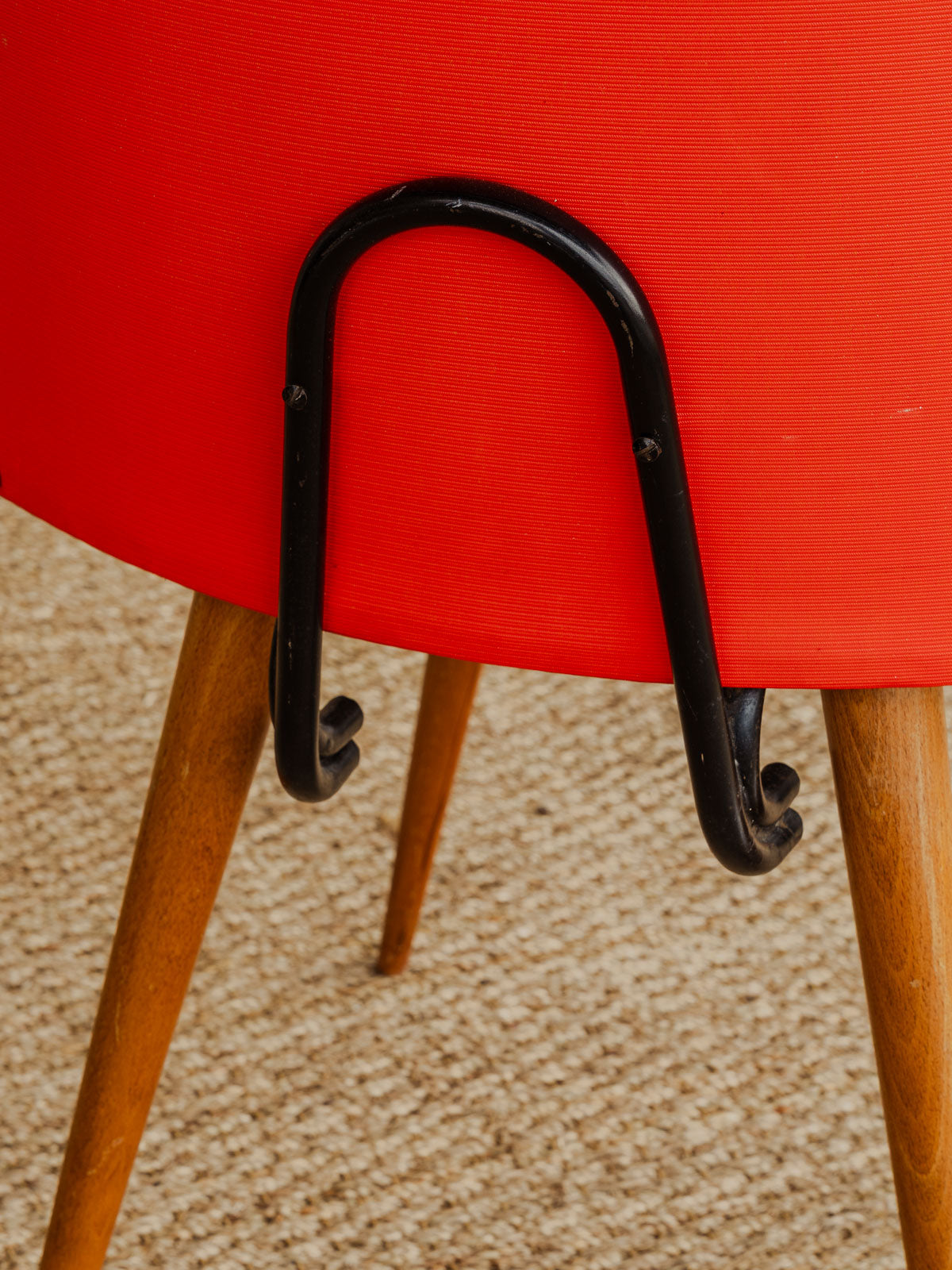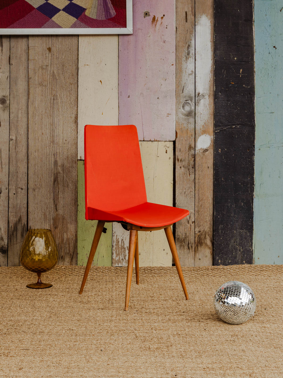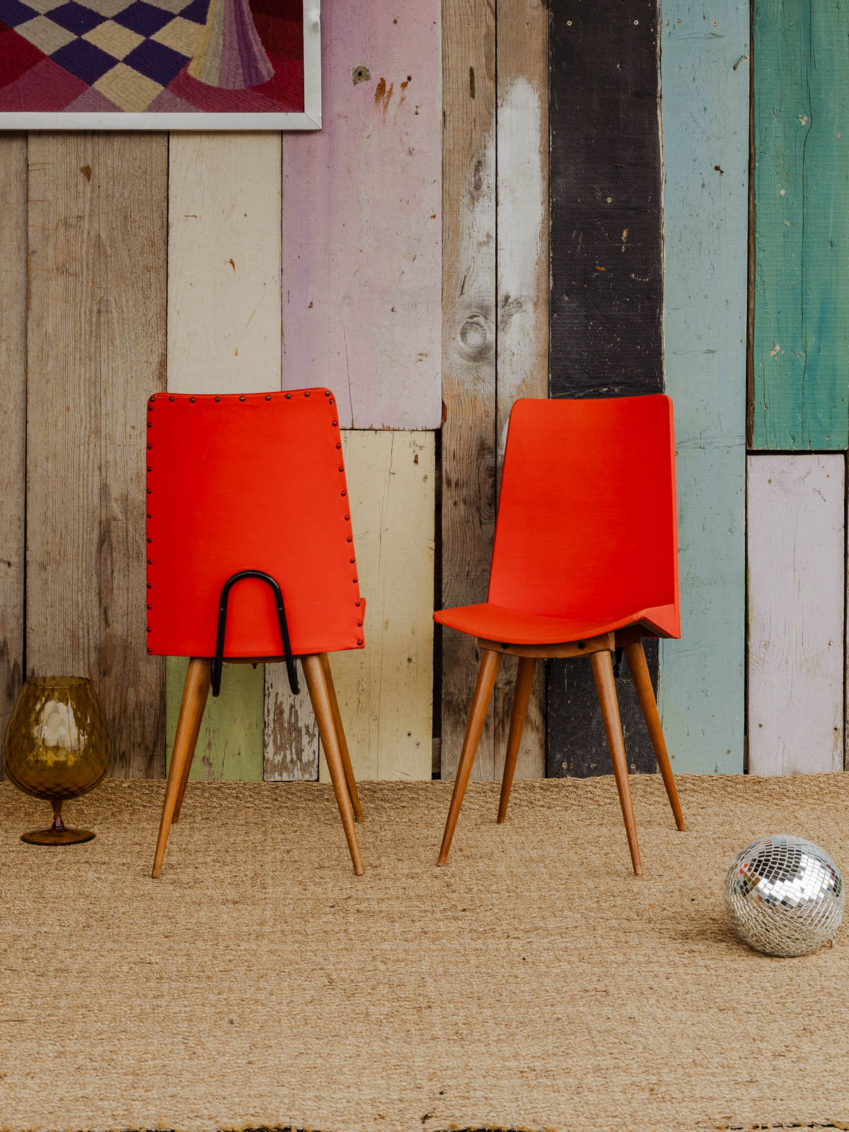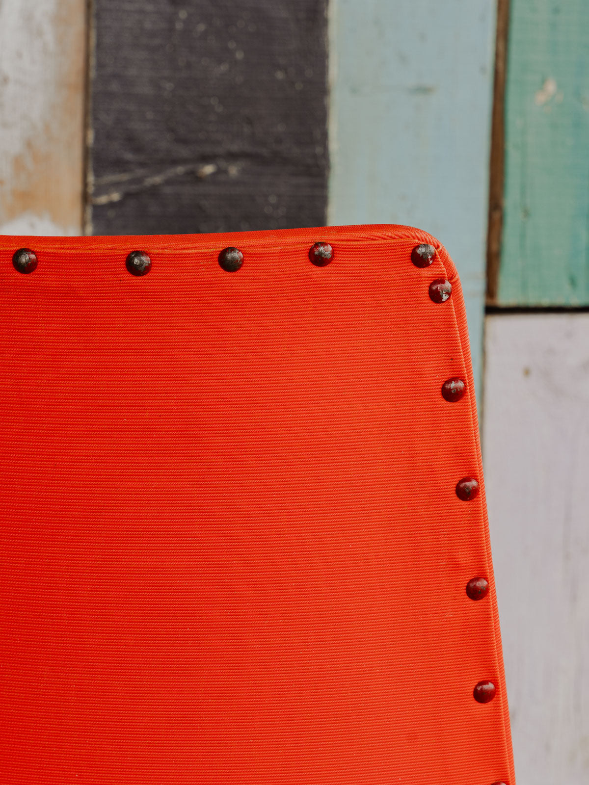 Adoptez cette paire de chaises anciennes habillées d'un tissu rouge chaleureux, cloutées sur le dossier et reposant sur des pieds en bois. Leurs proportions et leurs lignes classiques s'intègrent aussi bien autour d'une table que comme sièges d'appoint dans une entrée, apportant une note chaleureuse et structurée à votre intérieur. Vente possible à l'unité. Quelques traces d'usure qui font son authenticité.