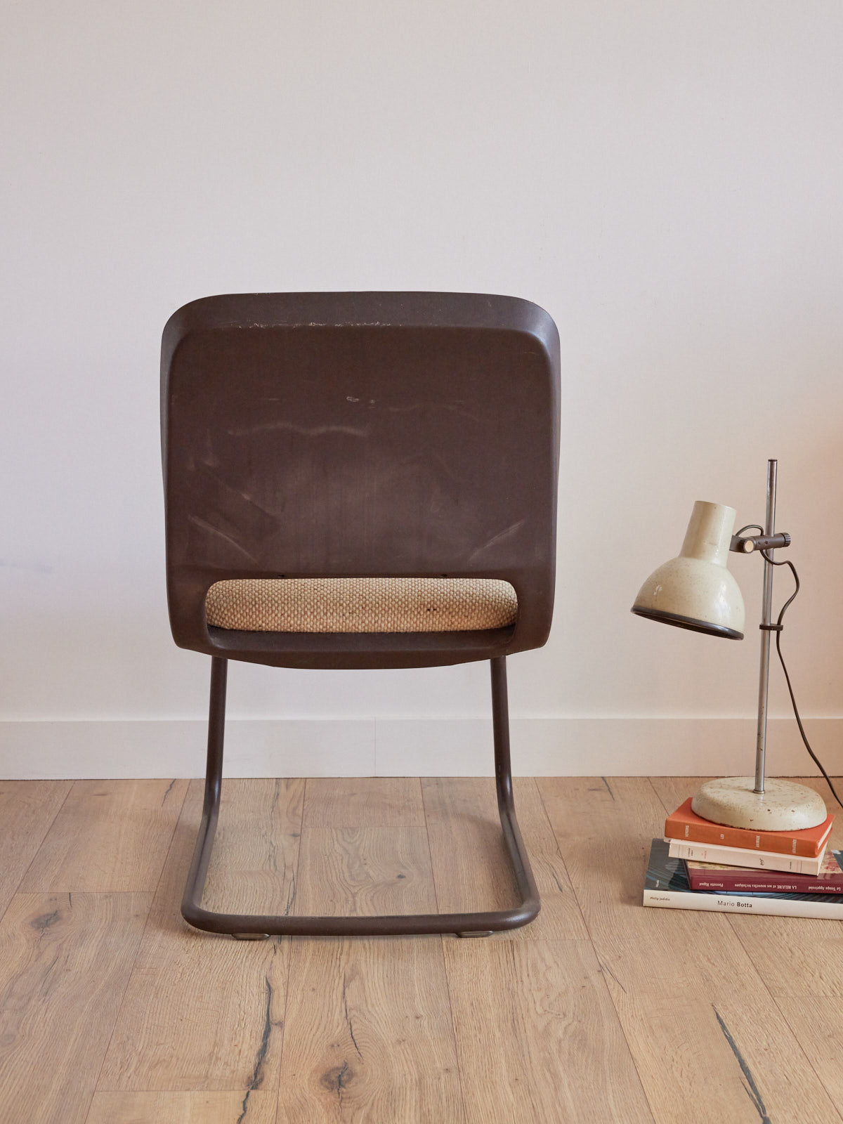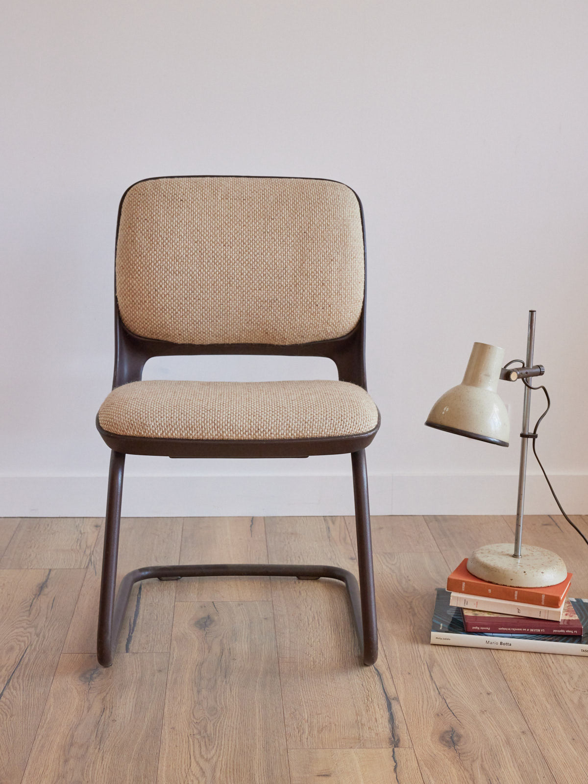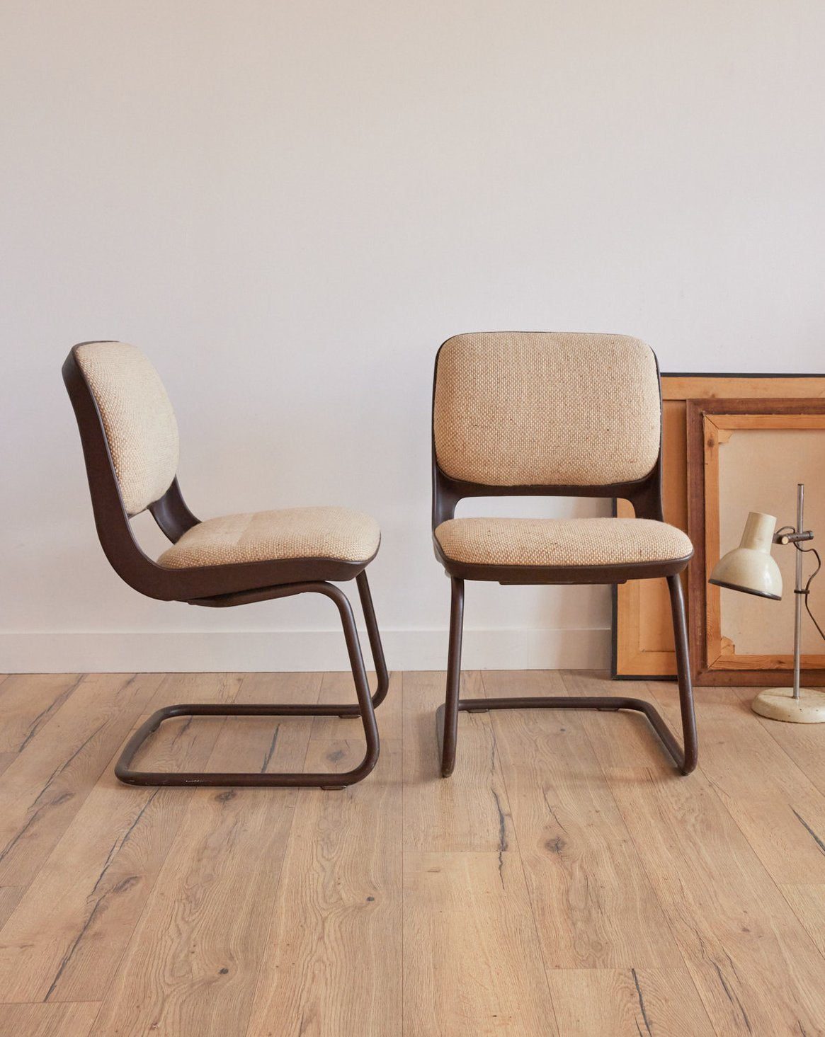 Adoptez cette paire de chaises rétro des années 80 en plastique dur et tissu beige, son design graphique apporte une touche vintage à votre salle à manger ou à votre coin bureau. Le plastique garantit une assise robuste tandis que le tissu beige apporte douceur et chaleur, ces proportions compactes facilitent l'intégration dans des espaces variés. Parfaites pour instaurer une ambiance nostalgique et accueillante, elles se marient aussi bien avec du mobilier bois que des intérieurs contemporains. Traces d'usure présentes sur le plastique
