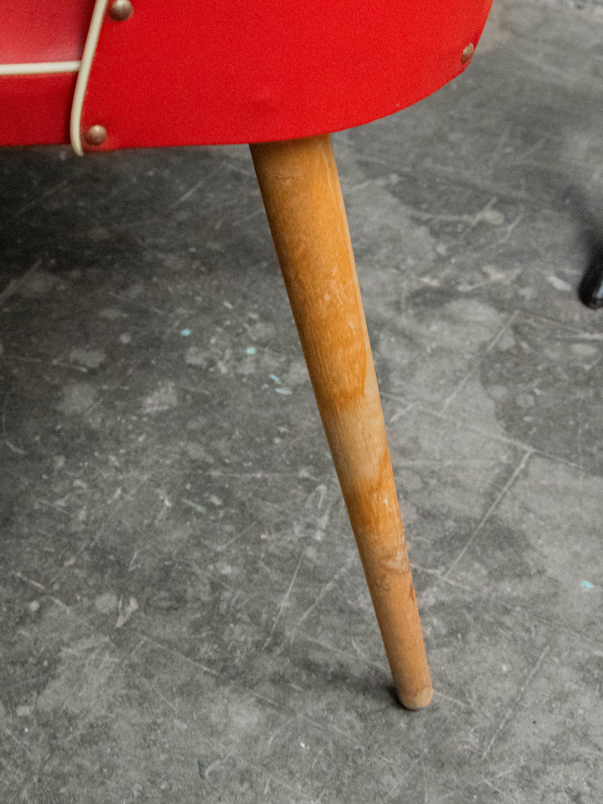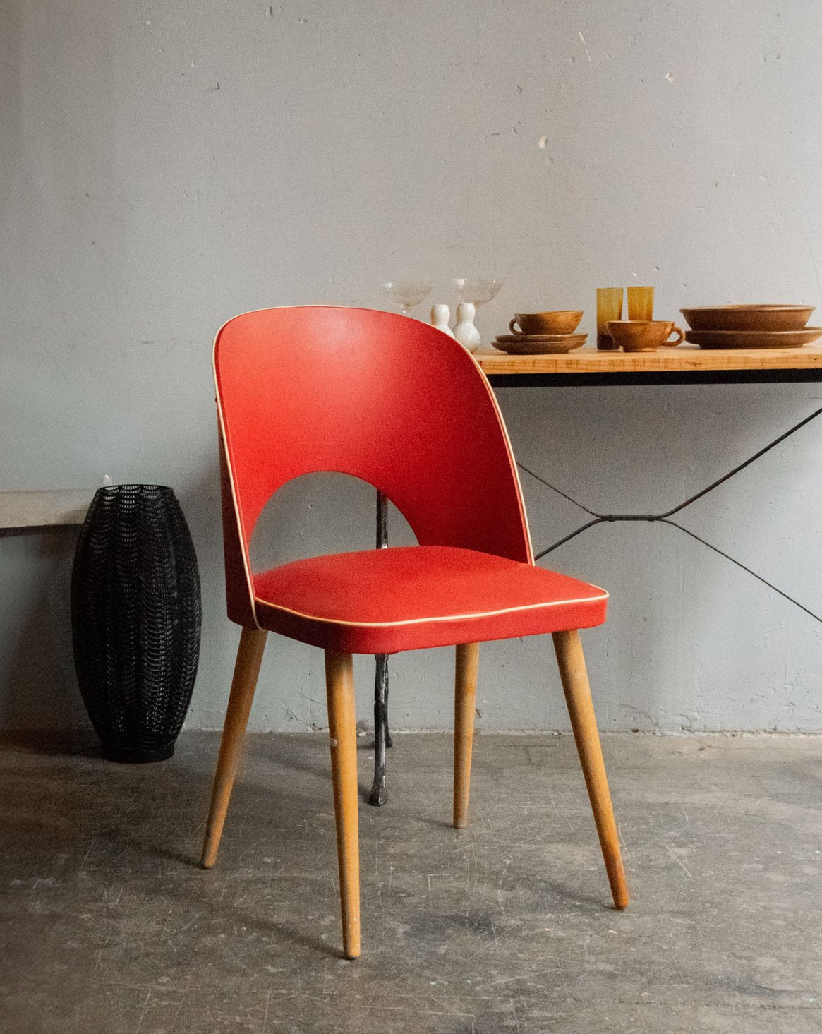 Adoptez cette chaise en vinyle rouge au charme rétro, où une assise et un dossier enveloppants invitent à s'installer confortablement, tandis que les pieds compas en bois clair apportent une élégance graphique et une allure légère. Le petit trou décoratif à l'arrière souligne son esprit vintage et facilite la prise, la rendant idéale autour d'une table, dans un coin bureau ou une alcôve lecture. Sa présence colorée réchauffe l'ambiance sans imposer, pour une décoration à la fois sobre et inspirante. Usures légères.