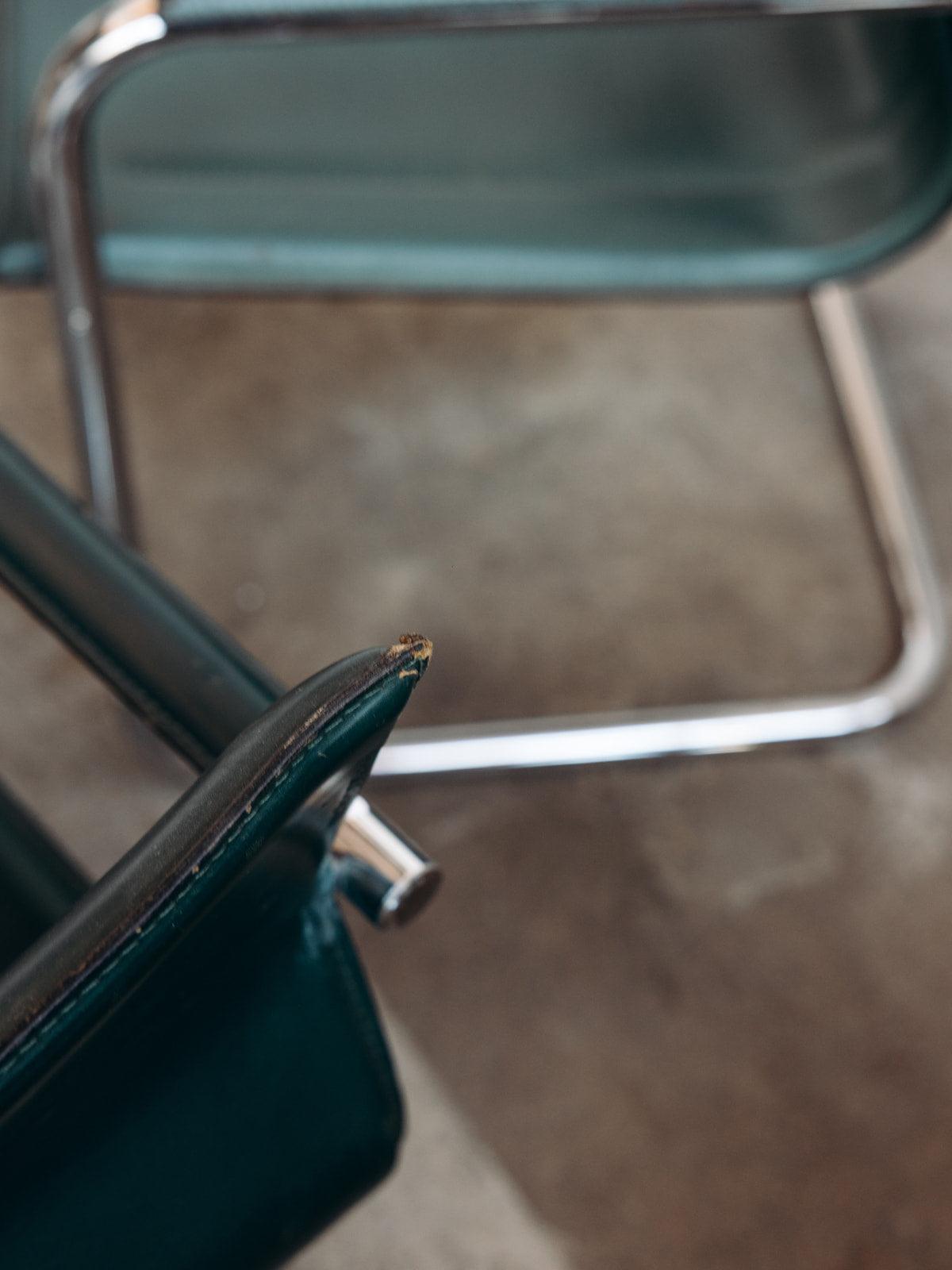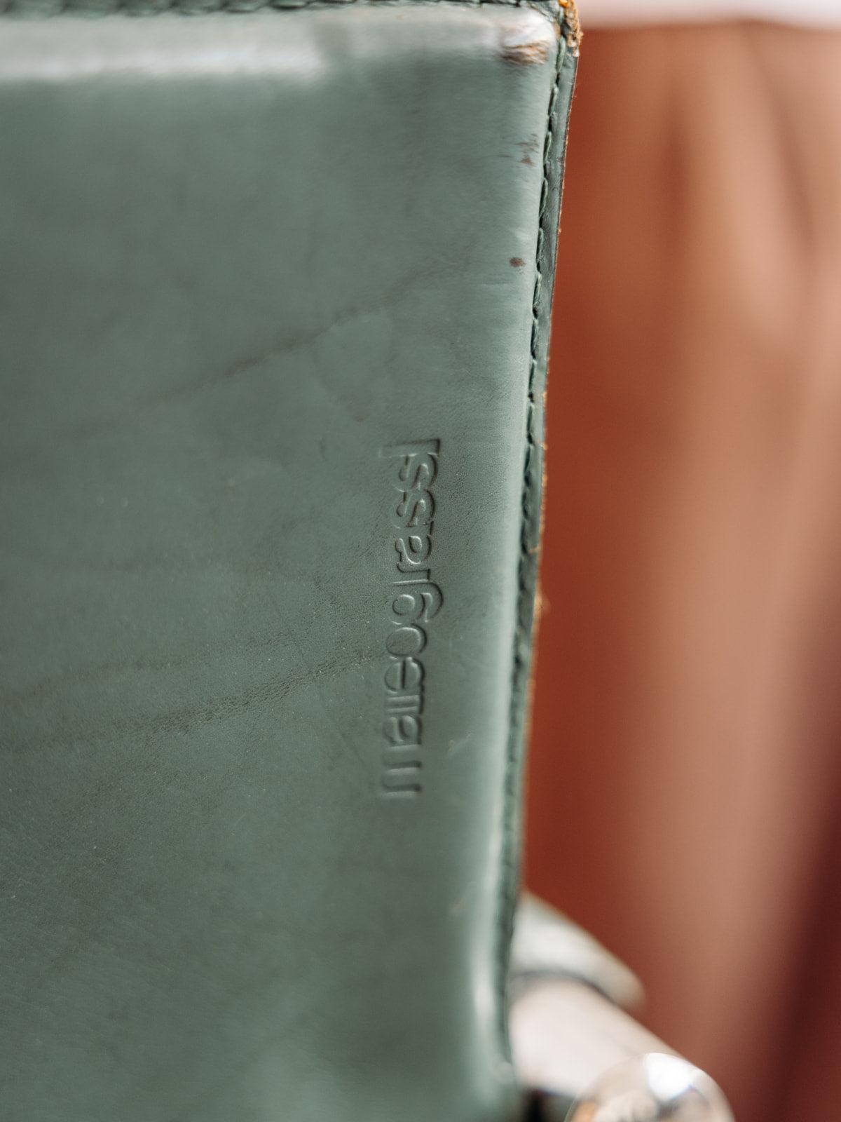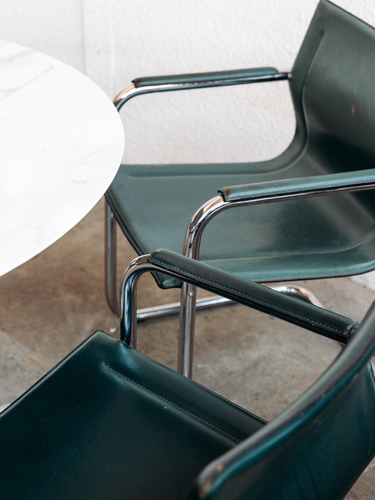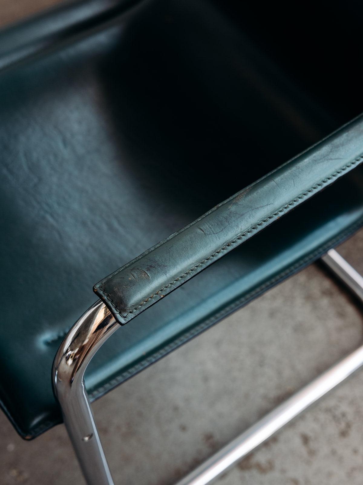 Coup de cœur pour ces chaises Matteo Grassi, qui allient cuir vert et structure en métal dans un style inspiré de Breuer. Nous avons craqué pour leur design contemporain et épuré, qui apportera un véritable caractère à votre intérieur ! Quelques défauts sont visibles au niveau de la couleur sur l'assise. Vendues par lot de 2 et 2 lots sont disponibles.