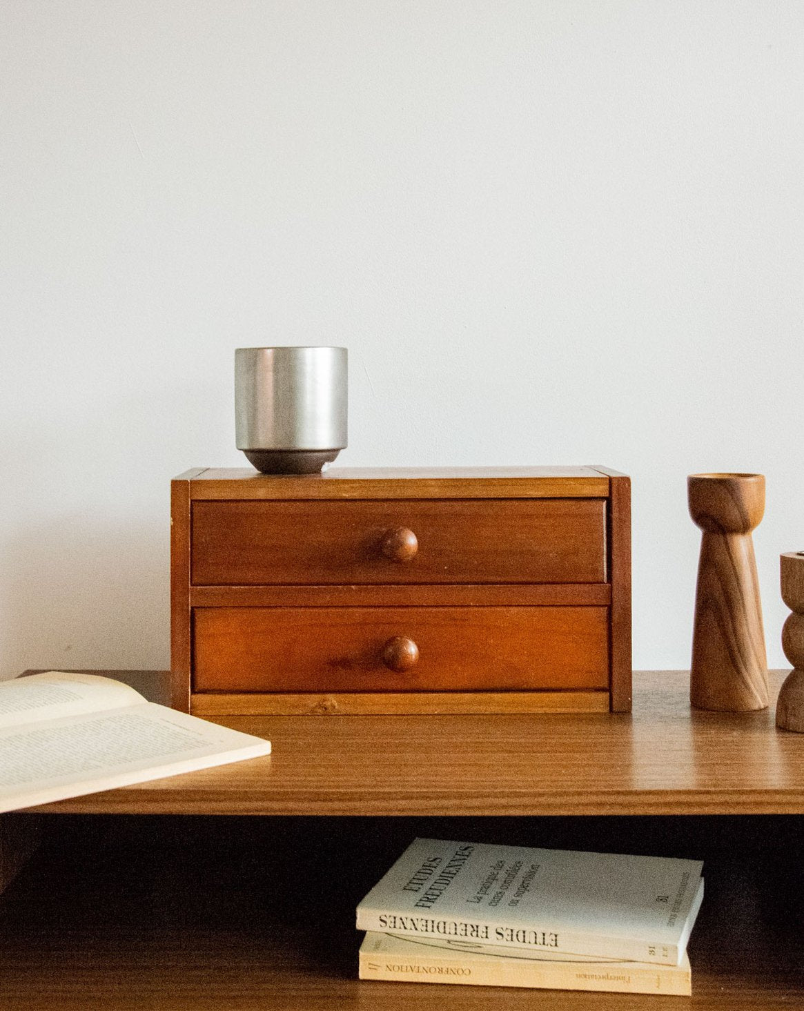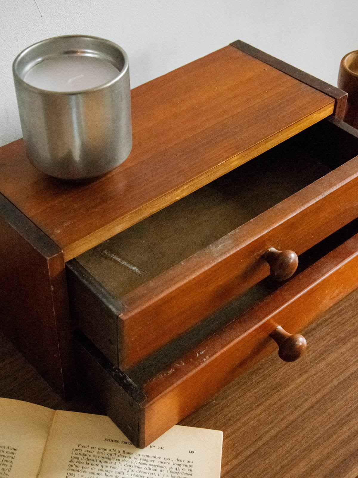 Ajoutez ce petit meuble de rangement en bois foncé à votre intérieur, dont les deux tiroirs aux proportions compactes offrent un rangement discret pour papiers, accessoires ou petits objets du quotidien. Sa teinte profonde et son grain naturel apportent une touche chaleureuse et sobre, adaptée à une chambre, un bureau ou une entrée aux lignes épurées. Compact et stable, il se glisse facilement sur une table ou une commode, créant une ambiance organisée et raffinée.
