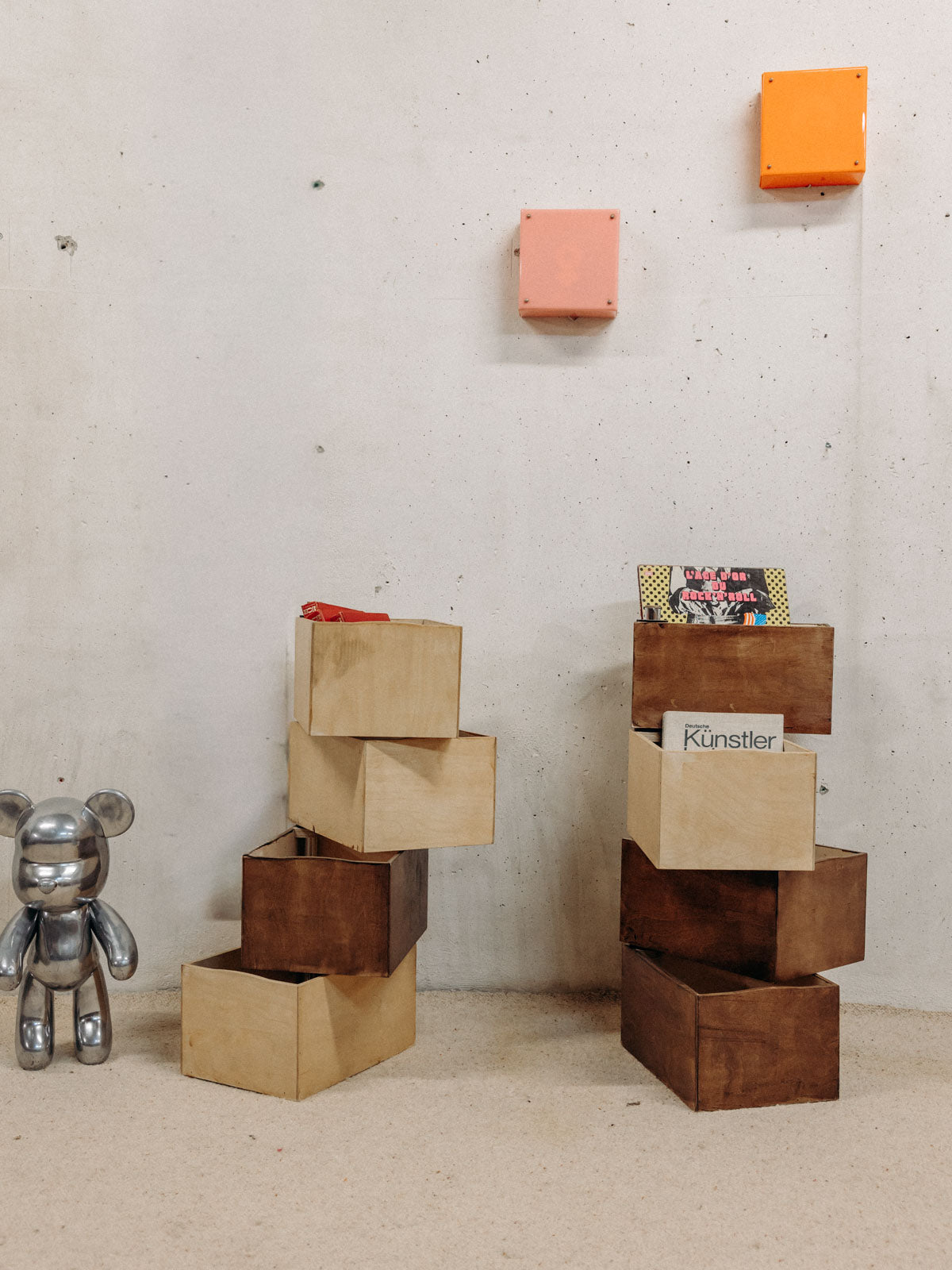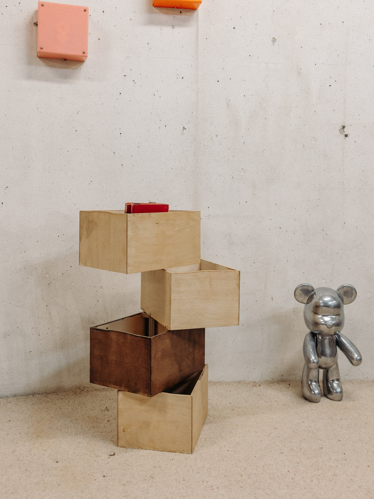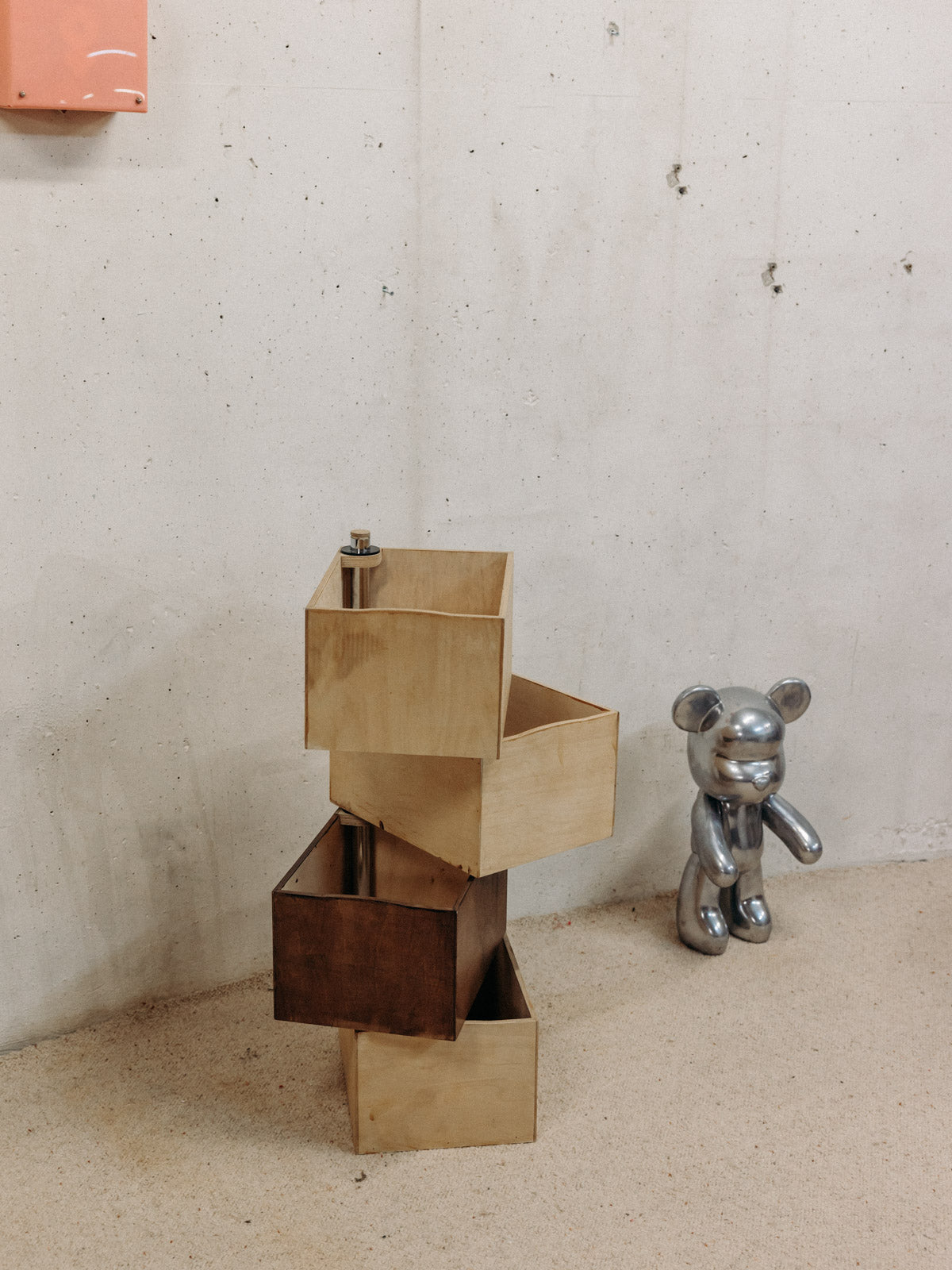 Créez une composition sculpturale avec cette pile de casiers pivotants en bois clair et foncé autour d'un tube en chrome, qui marie la chaleur du bois à l'élégance du métal. Chaque casier s'articule pour offrir un rangement modulable et une mise en valeur de petits objets, livres ou accessoires, idéal pour animer un salon, un bureau ou une entrée. Disponible en deux configurations — trois casiers foncés et un clair, ou l'inverse avec trois casiers clairs et un foncé— elle apporte une note graphique et contemporaine à votre intérieur.