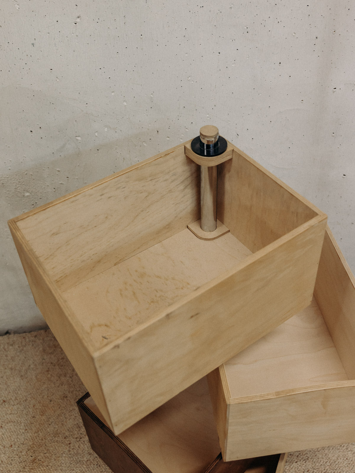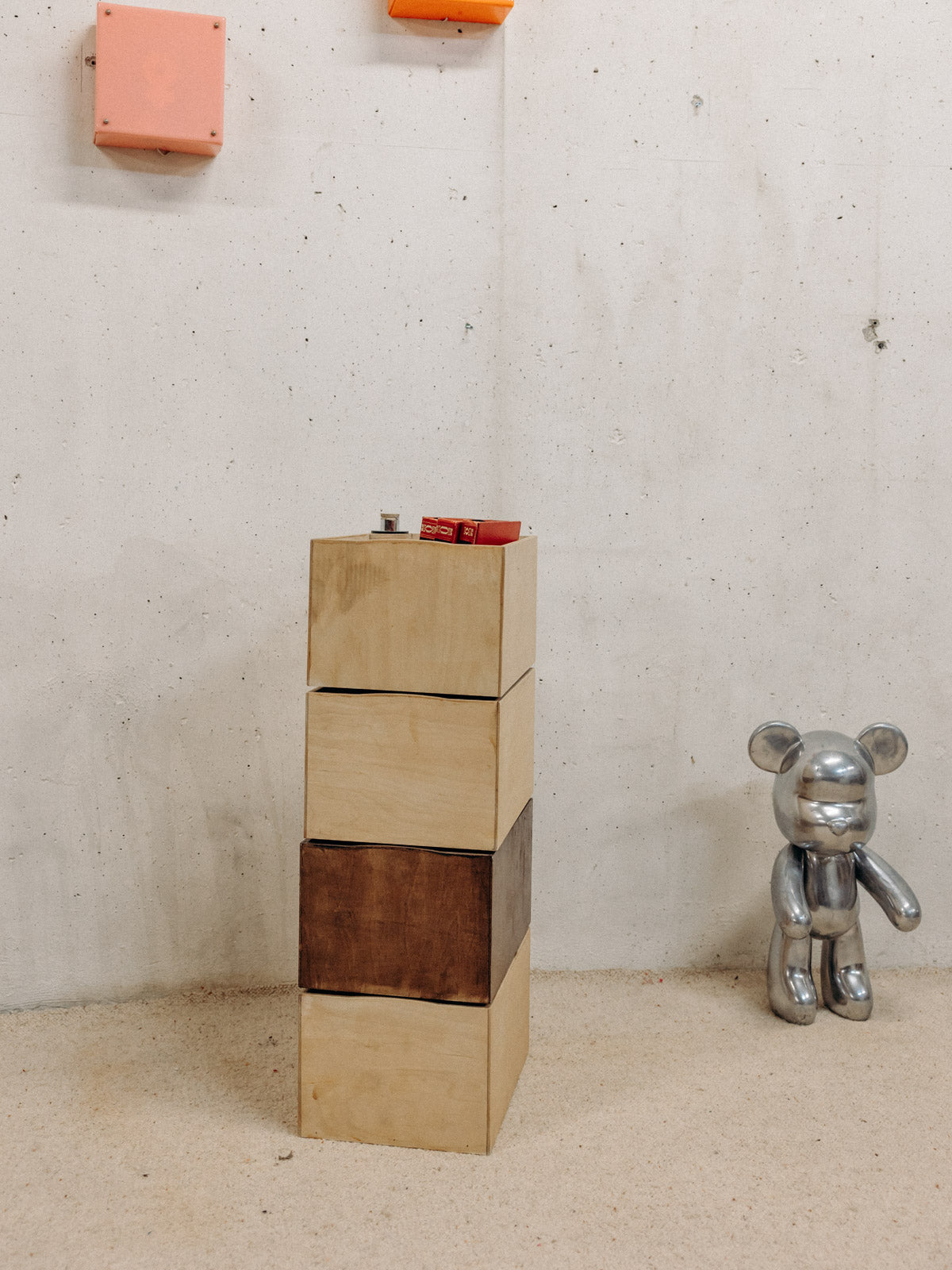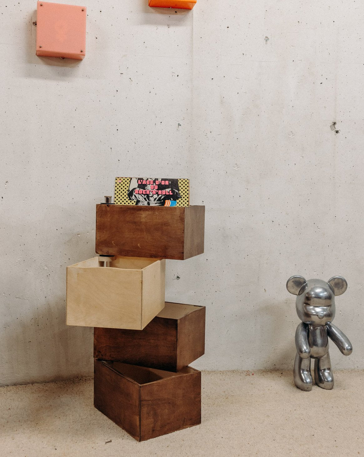 Créez une composition sculpturale avec cette pile de casiers pivotants en bois clair et foncé autour d'un tube en chrome, qui marie la chaleur du bois à l'élégance du métal. Chaque casier s'articule pour offrir un rangement modulable et une mise en valeur de petits objets, livres ou accessoires, idéal pour animer un salon, un bureau ou une entrée. Disponible en deux configurations — trois casiers foncés et un clair, ou l'inverse avec trois casiers clairs et un foncé— elle apporte une note graphique et contemporaine à votre intérieur.
