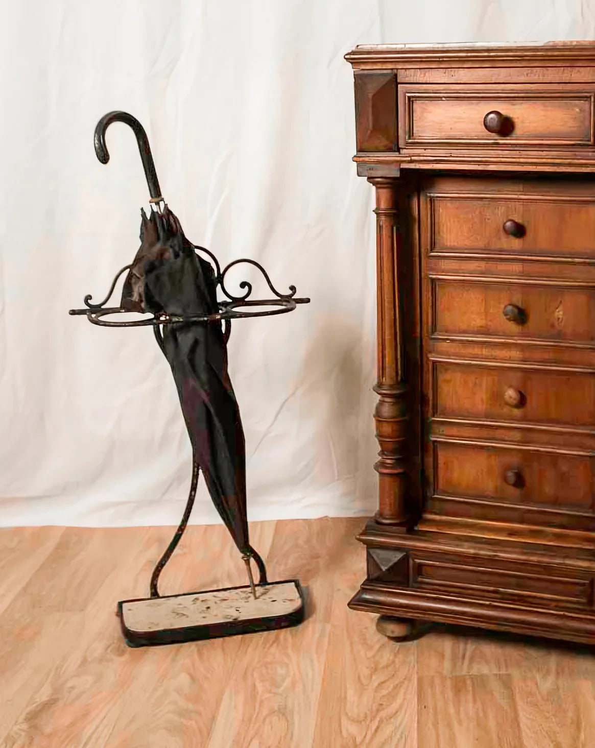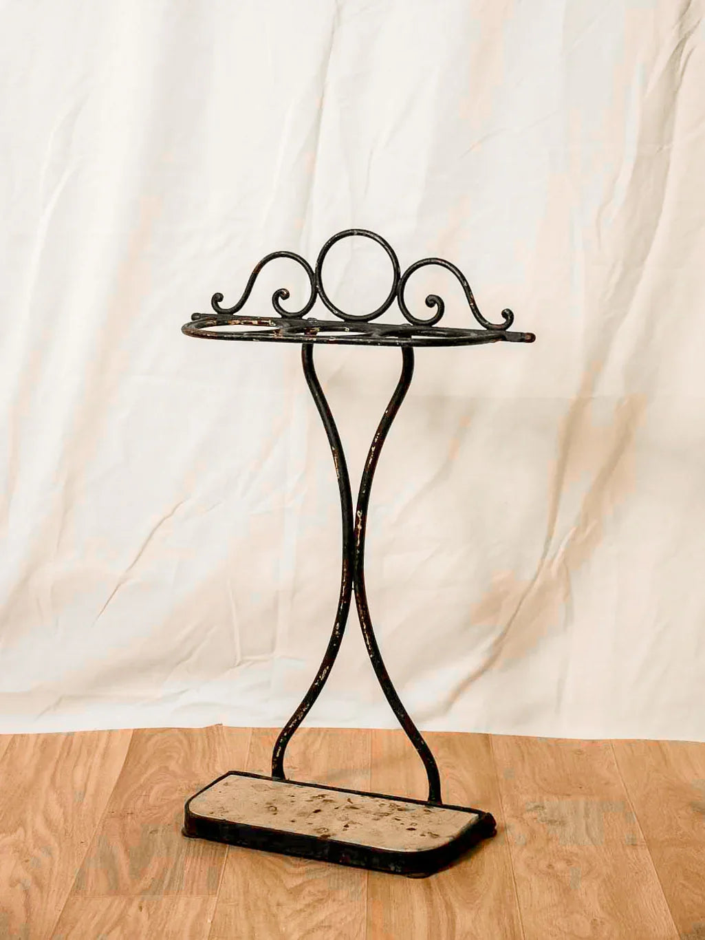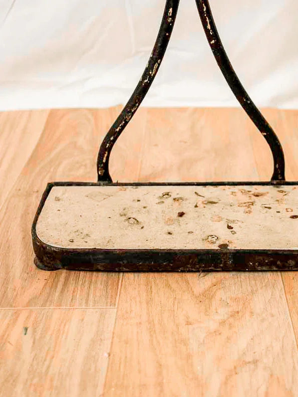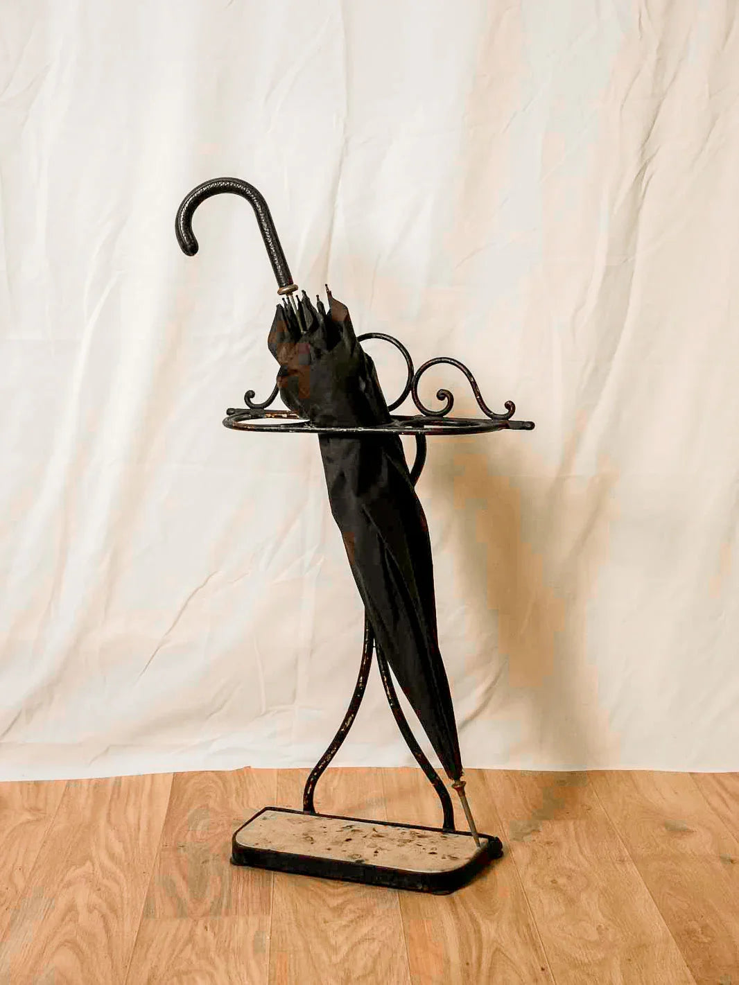 Découvrez ce porte-parapluie en métal noir sur pied en plaque de travertin, au design sobre et équilibré, qui apporte une présence discrète à l'entrée. Trois emplacements accueillent parapluies et cannes, format compact adapté aux espaces de passage. La base en travertin offre une note minérale et stable, en contraste élégant avec la métal patiné ; quelques éclats de peinture témoignent de son histoire et renforcent son caractère. Légères traces du temps qui participent à son charme.