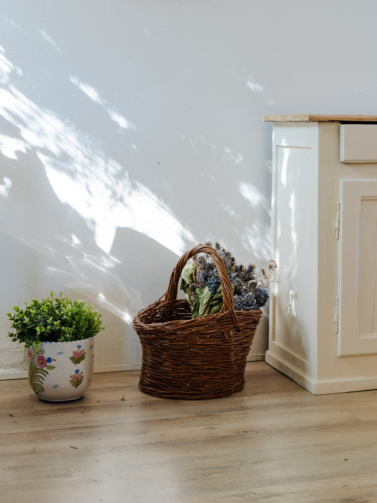 Adoptez ce panier à anse en osier, mêlant rusticité et élégance naturelle. Sa structure légère mais robuste accueille facilement vos courses, plaids ou bouquets et s'intègre avec grâce à une cuisine, une entrée ou un coin pique-nique. La teinte chaude de l'osier apporte une note authentique et chaleureuse, au charme discret, à vos objets du quotidien. Quelques traces du temps présentes.