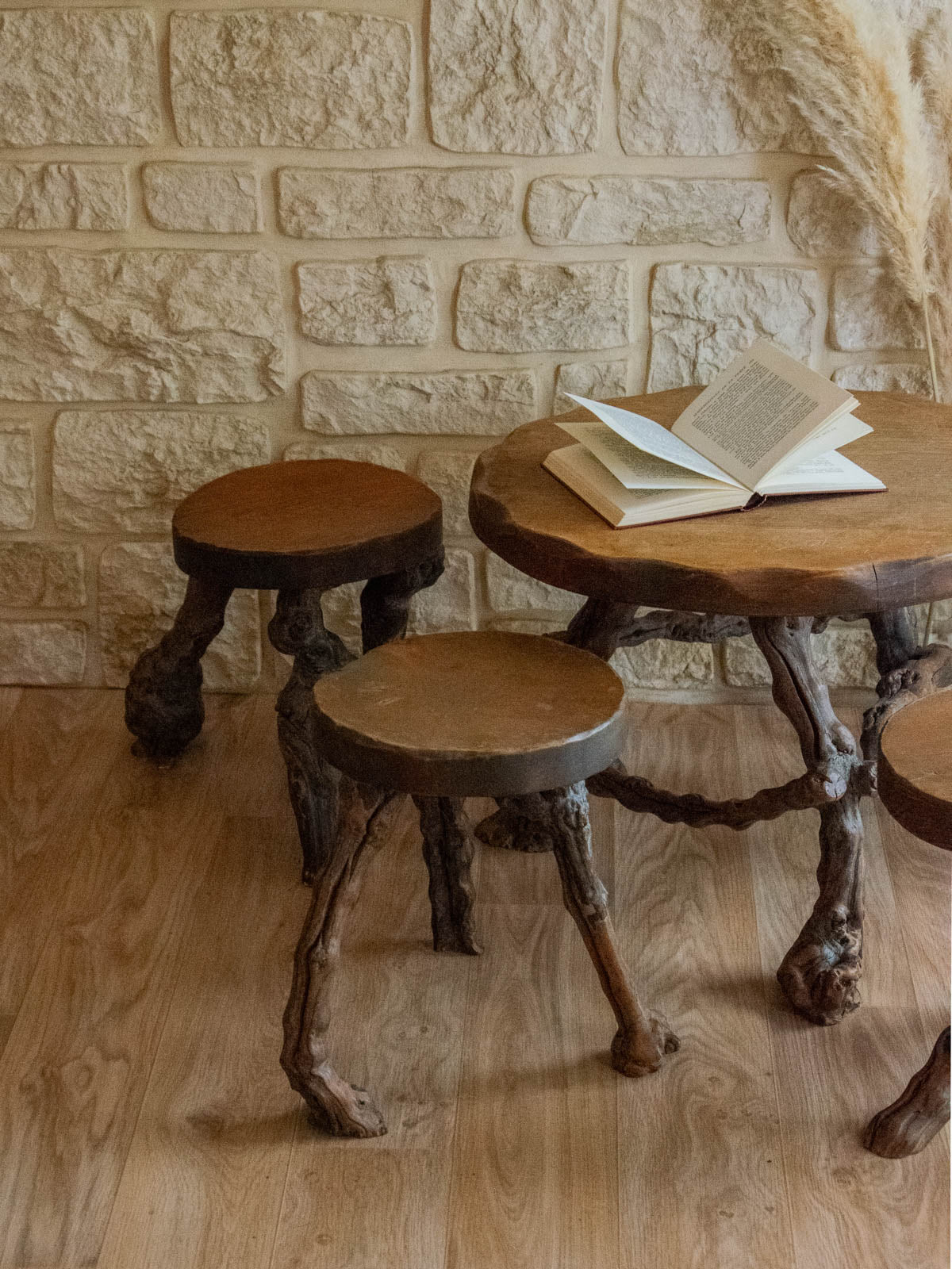Invitez l'esprit des vignes chez vous avec cet ensemble composé d'une table basse et de quatre tabourets aux pieds en bois de vigne, travaillés pour conserver leur caractère organique. Le plateau offre un plan bas idéal pour poser tasses et livres, tandis que les tabourets compacts se glissent autour pour des moments conviviaux ou servent d'appoint modulable. Sa patine naturelle et ses veines apparentes créent une atmosphère chaleureuse, mêlant rusticité subtile et élégance sobre, parfaite pour un salon intime ou une terrasse accueillante. Légères traces du temps et d'usure présentes.