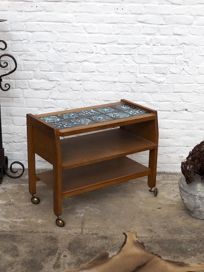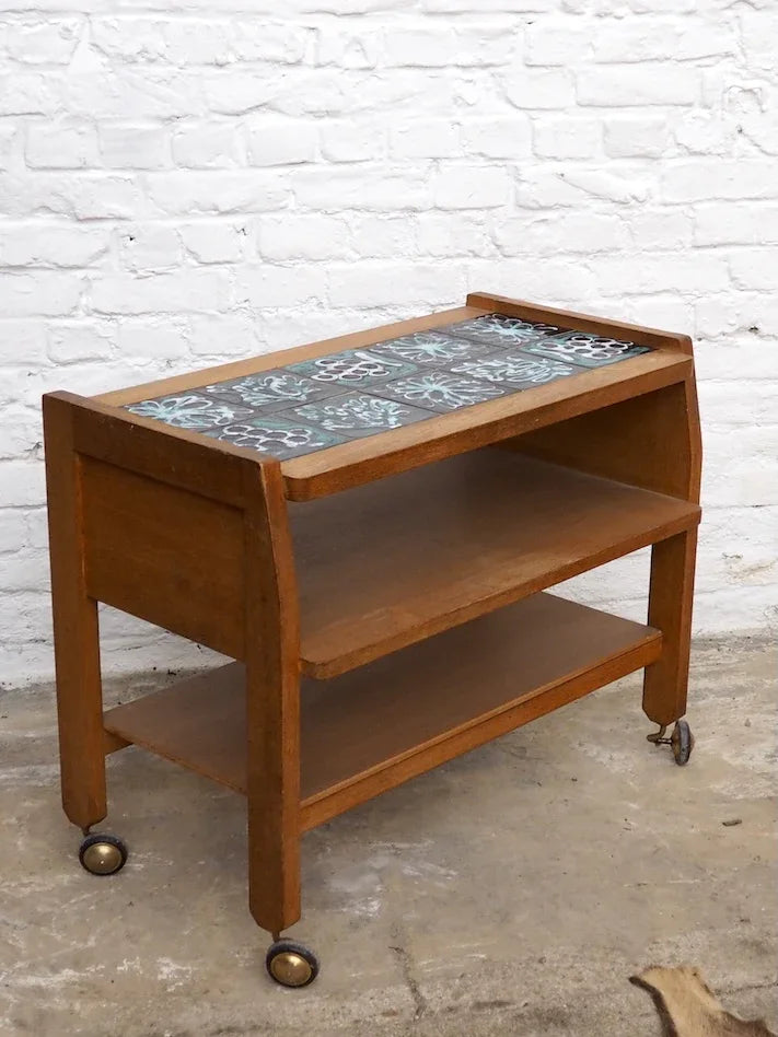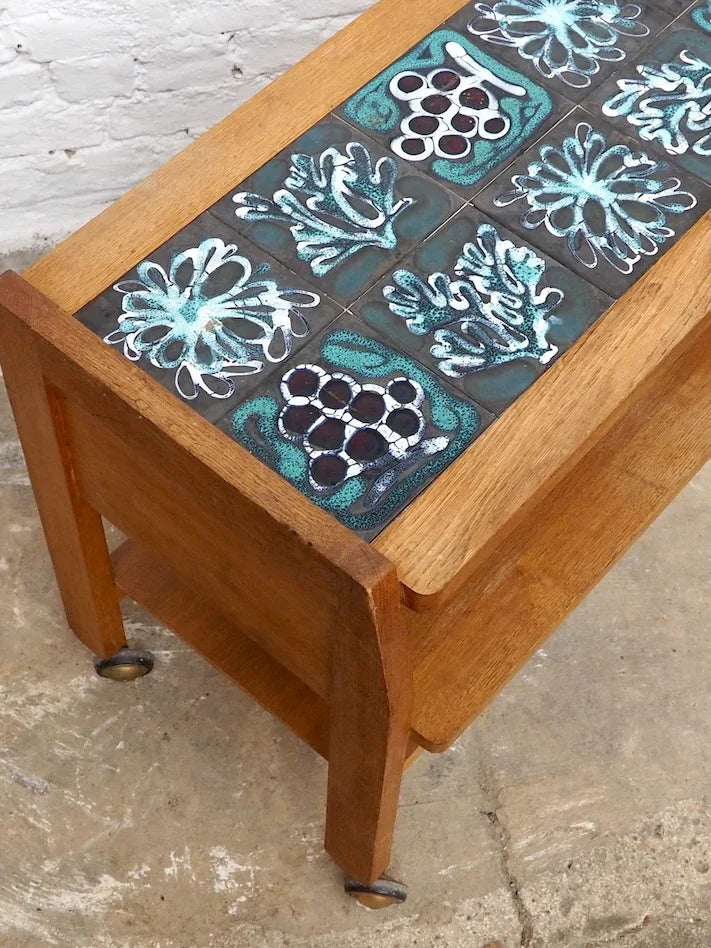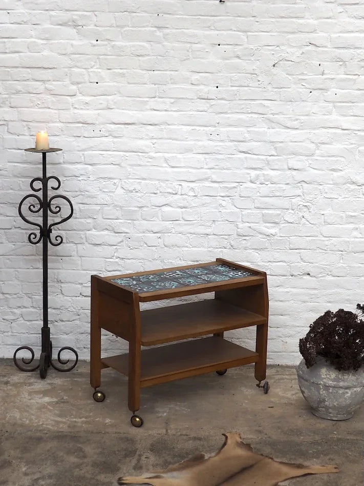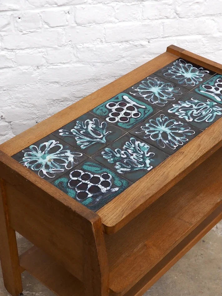 Découvrez cette desserte signée Guillerme et Chambron en bois de chêne, ponctuée de carreaux d'Anikowski intacts qui apportent une touche graphique et raffinée. Son gabarit pratique et ses roulettes discrètes facilitent les déplacements, la rendant idéale comme plan de service mobile pour la cuisine ou un coin repas. Les lignes simples et l'allure artisanale créent une ambiance sobre et conviviale, parfaite pour intégrer un intérieur contemporain ou rétro.