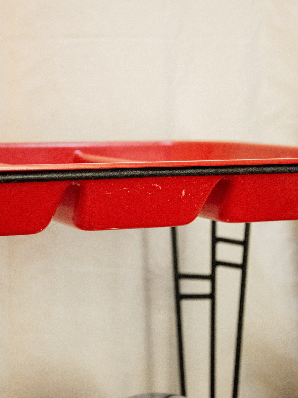 Sublimez vos moments de réception avec cette desserte en fer forgé noir au plateau amovible rouge compartimenté, qui marie robustesse et note colorée. Le plateau supérieur, facilement retiré, se prête au service et à l'organisation des bouteilles, apéritifs ou petits accessoires, tandis que le plateau bas accueille vaisselle et réserves discrètes. Son allure sobre et contrastée crée une ambiance chaleureuse et contemporaine, parfaite pour un coin bar ou une table d'appoint conviviale. Traces du temps présentes.