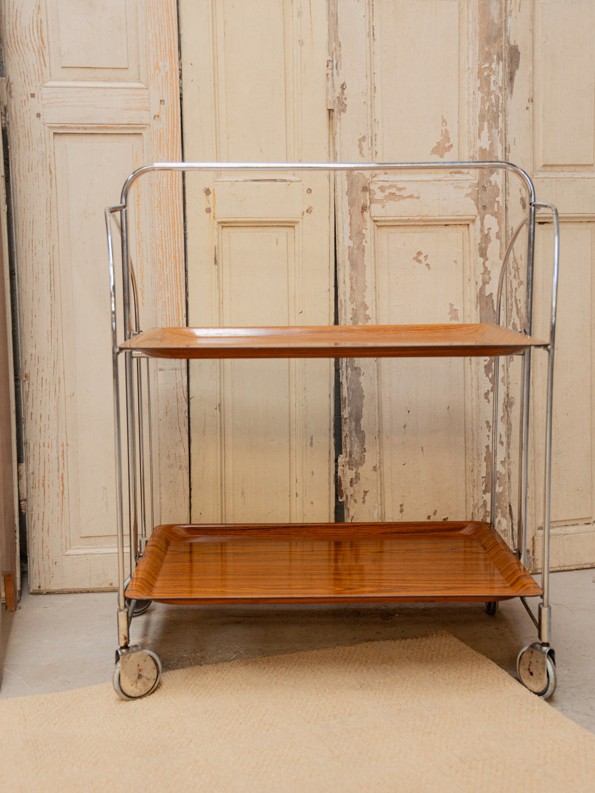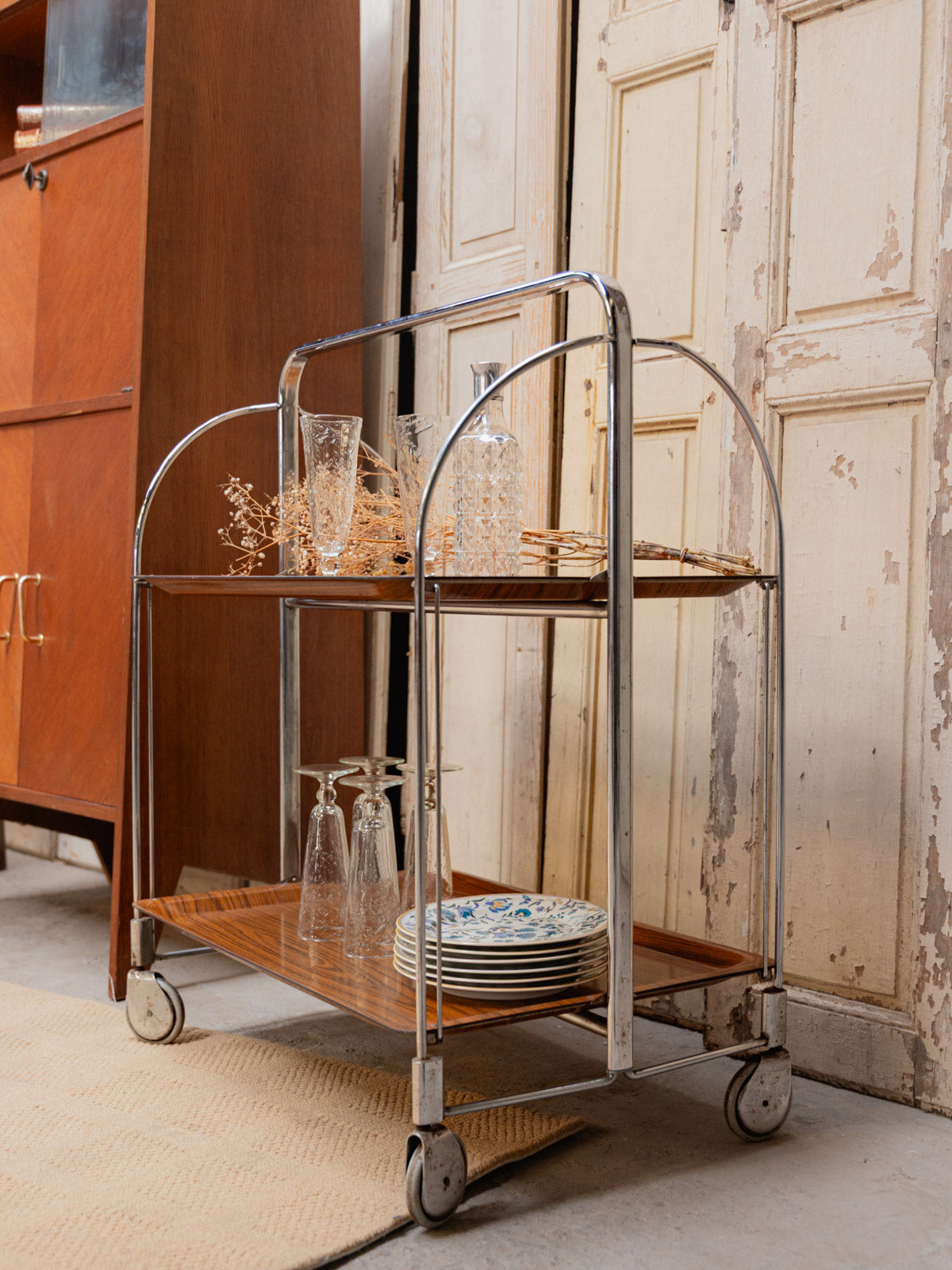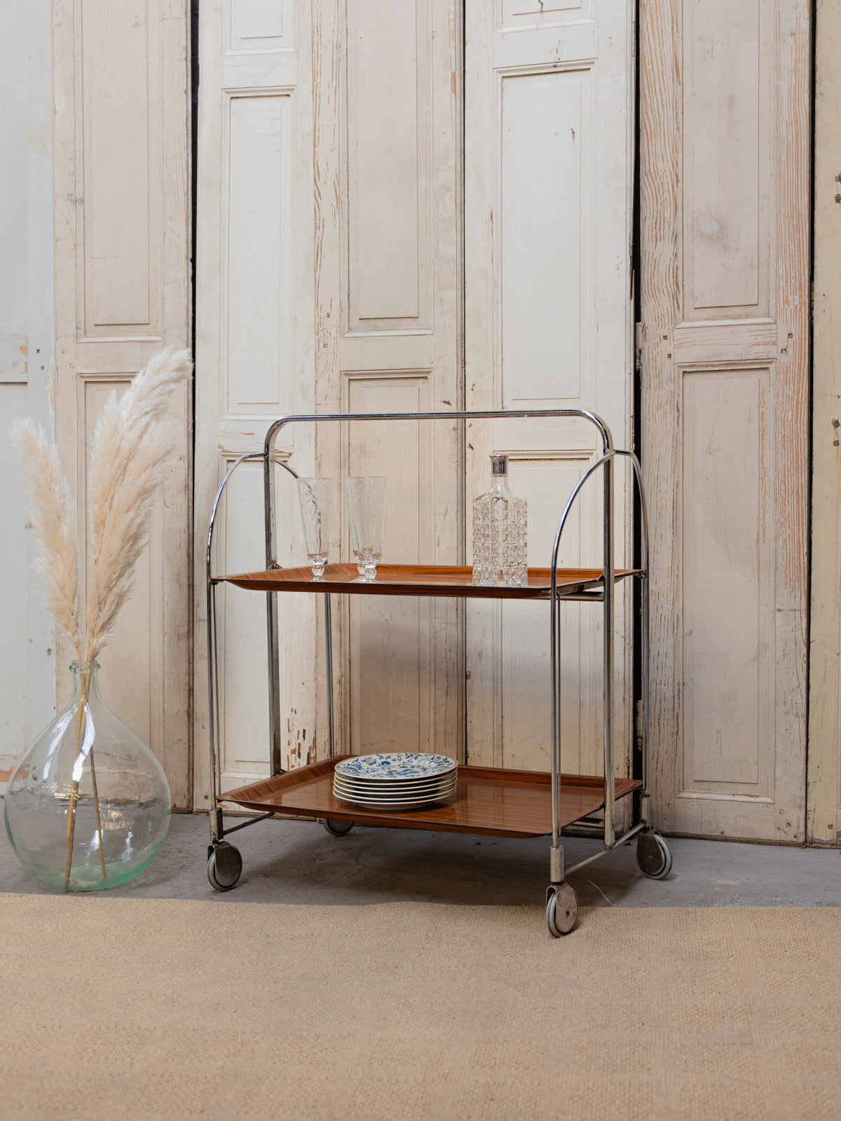 Découvrez cette desserte double plateau en chrome et résine coloris Formica marron, aux lignes arrondies et à l'anse singulière qui évoque un design rétro-chic. Ses deux plateaux modulables accueillent vaisselle, carafes et mets pour servir avec élégance lors d'un apéritif ou d'un dîner convivial, tandis que le contraste métal/matière poétique apporte du caractère à votre intérieur. Pensée pour la vie moderne, elle se replie entièrement pour un rangement discret, idéale dans les petits espaces.