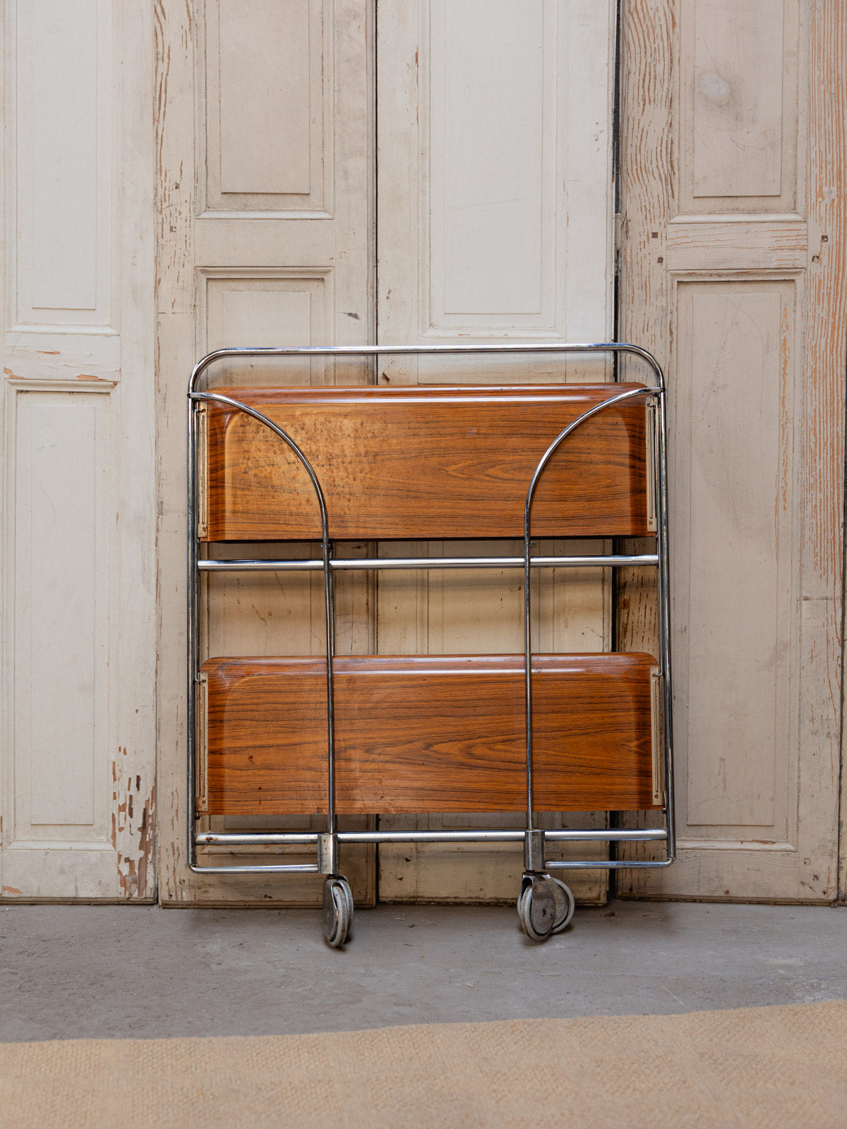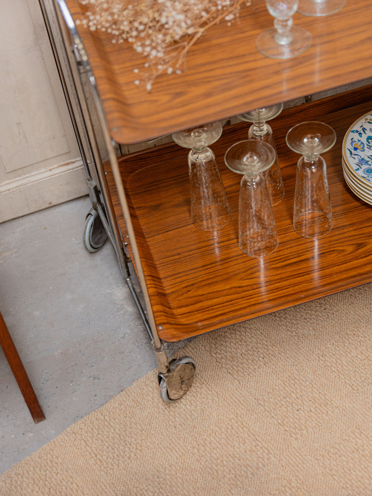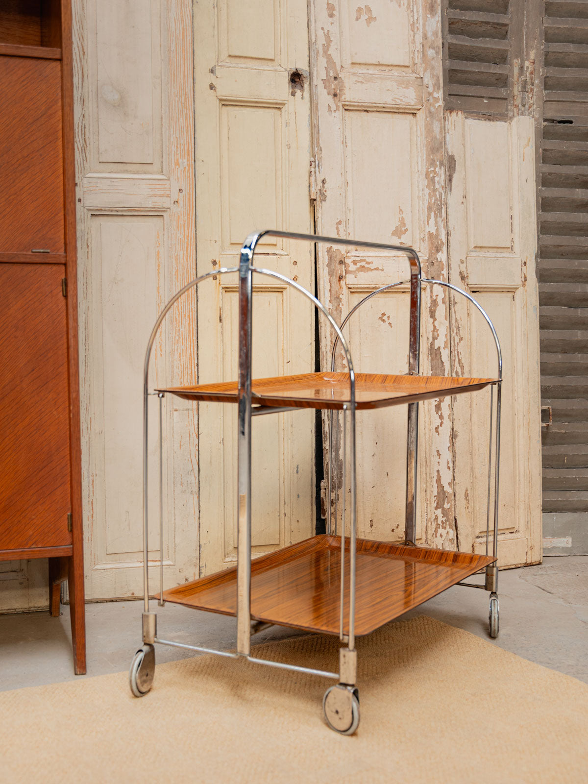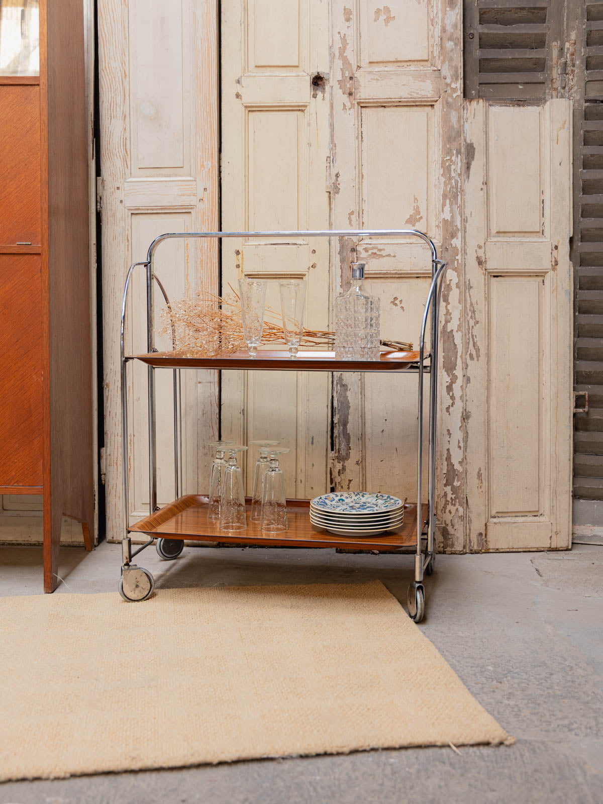Découvrez cette desserte double plateau en chrome et résine coloris Formica marron, aux lignes arrondies et à l'anse singulière qui évoque un design rétro-chic. Ses deux plateaux modulables accueillent vaisselle, carafes et mets pour servir avec élégance lors d'un apéritif ou d'un dîner convivial, tandis que le contraste métal/matière poétique apporte du caractère à votre intérieur. Pensée pour la vie moderne, elle se replie entièrement pour un rangement discret, idéale dans les petits espaces.