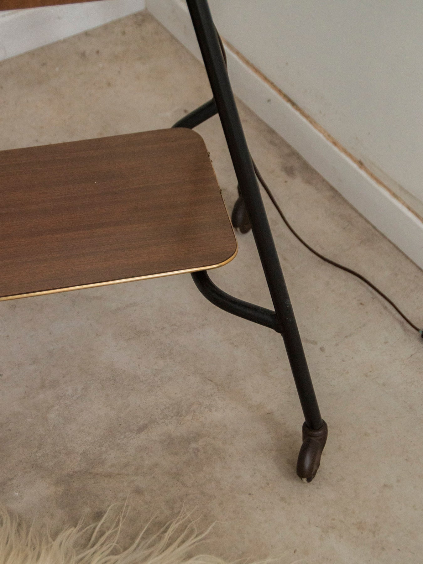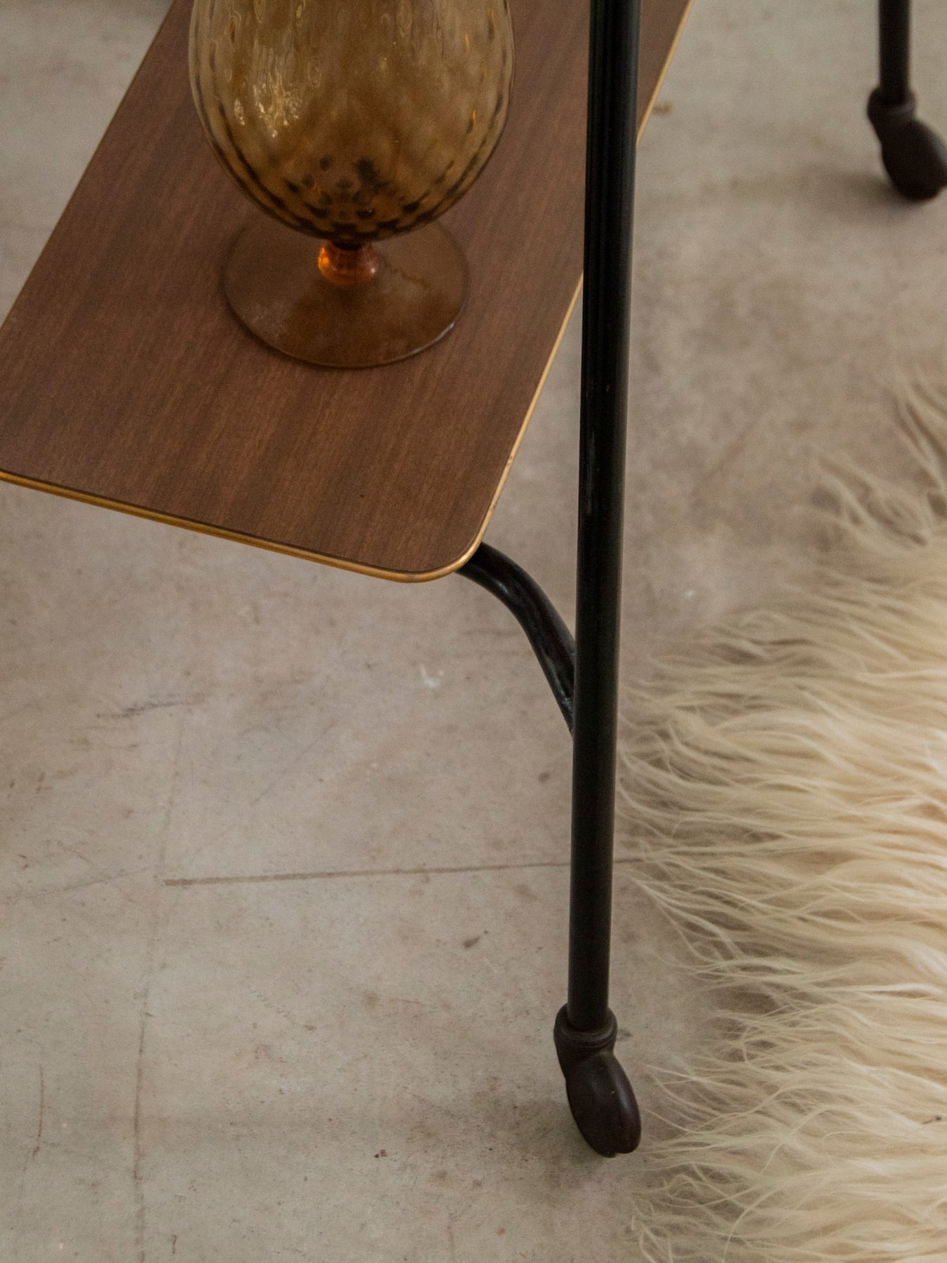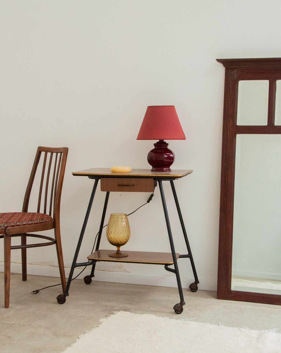 Ajoutez une touche rétro fonctionnelle à votre intérieur avec cette desserte à double plateau en formica et métal, pensée pour allier praticité et allure graphique. Son petit tiroir discret accueille couverts et accessoires tandis que les deux niveaux multiplient les possibilités d'usage — service d'apéritif, préparation près du plan de travail ou rangement d'appoint — et les roulettes permettent de la déplacer facilement d'une pièce à l'autre. L'association du formica brillant et du métal structuré apporte une esthétique vintage contemporaine, parfaite pour un espace compact et convivial.
