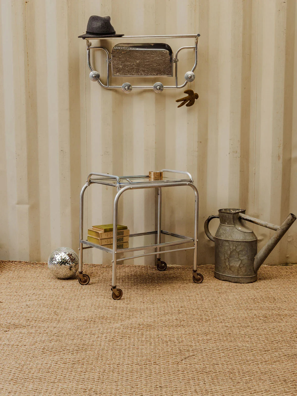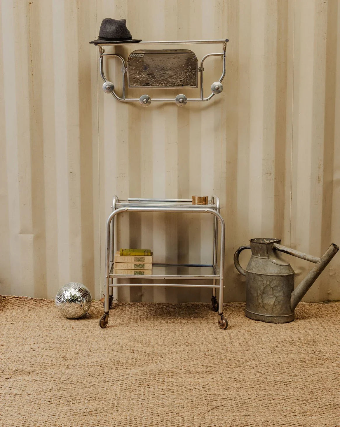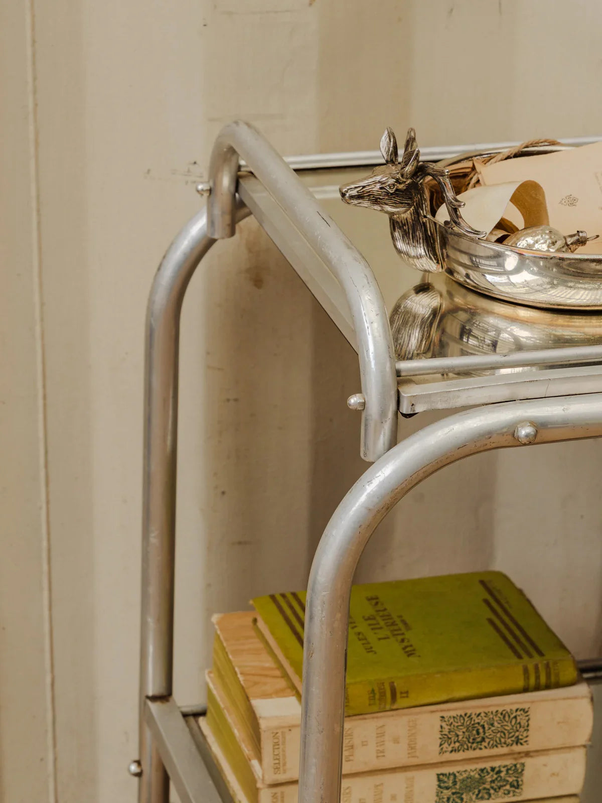 Invitez cette desserte à roulettes chromée au design rétro et raffiné : son plateau supérieur amovible facilite le service tandis que ses plateaux en miroir diffusent une lumière élégante et contemporaine. Le métal argenté affirme un style sobre et fonctionnel, parfait pour animer un coin bar, une réception ou pour présenter verres et carafes avec allure. Légères rayures sur les plateaux.