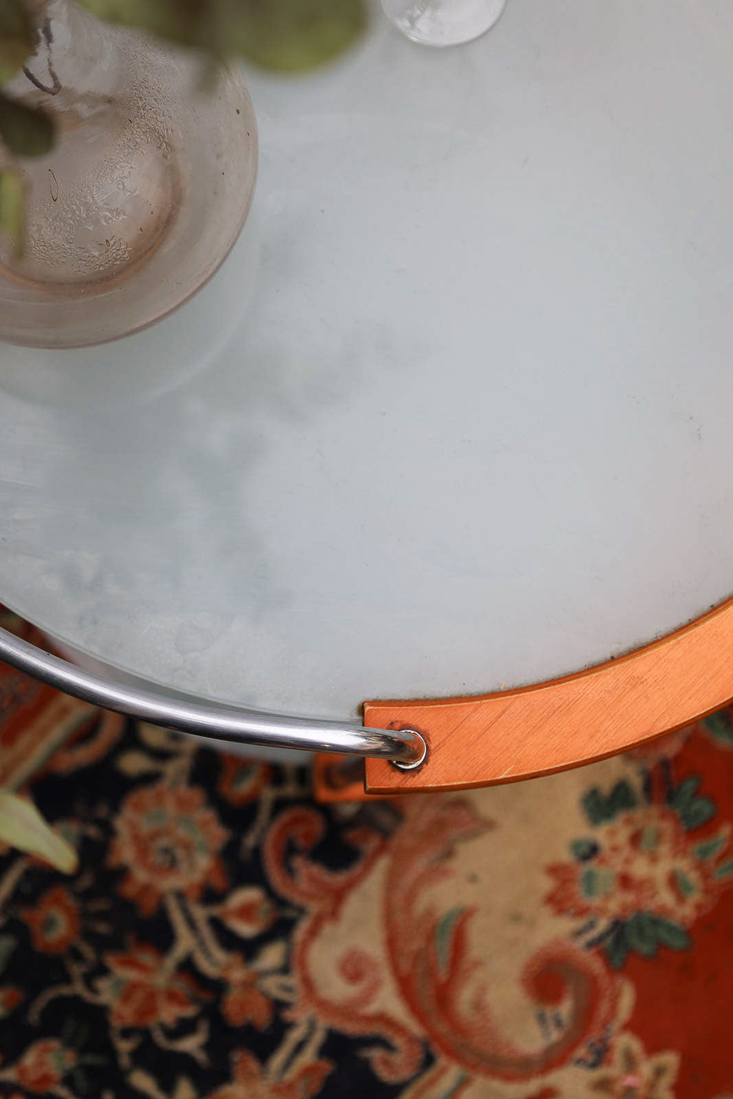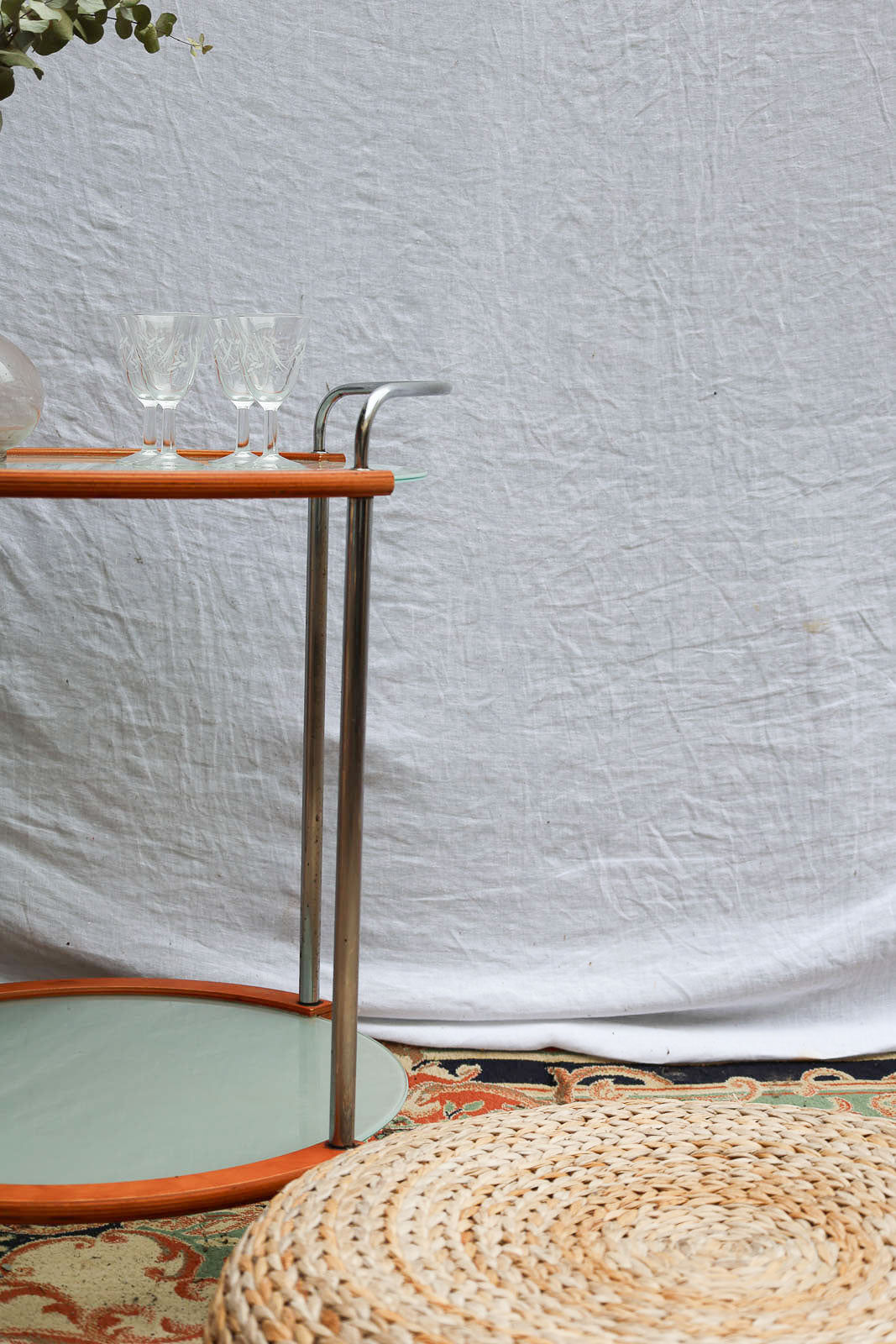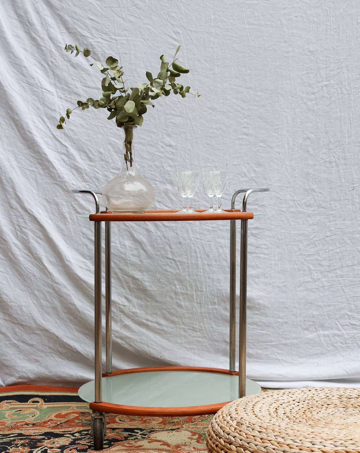 Sublimez votre intérieur avec cette desserte ronde sur roulettes, alliant lignes modernes et charme rétro. Deux plateaux en verre opalescent offrent des surfaces lumineuses et distinctes, soutenus par des tubulaires en chrome qui soulignent la finesse de la structure bois ; La hauteur différenciée des plateaux permettent de présenter verres, carafes ou objets décoratifs avec style. Maniable et stable, elle crée une atmosphère conviviale et nomade pour le salon ou la cuisine.