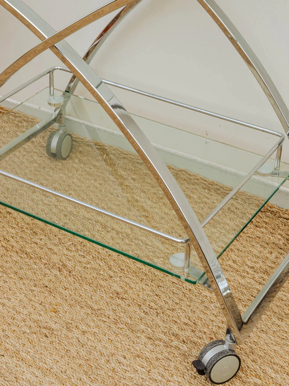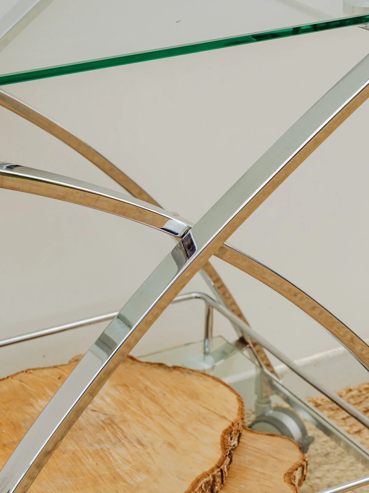 Apportez une touche vintage à votre intérieur avec cette desserte à roulettes, alliant plateaux en verre et structure métallique aux pieds chromés. Ses deux niveaux créent un espace modulable pour servir, exposer ou organiser vaisselle et bouteilles. Le contraste du verre et du métal apporte une élégance lumineuse, idéale pour un coin bar, la cuisine ou comme desserte dans le salon. Quelques traces du temps présentes.