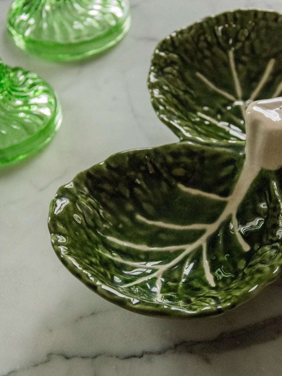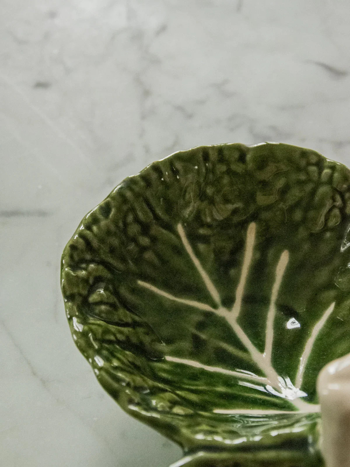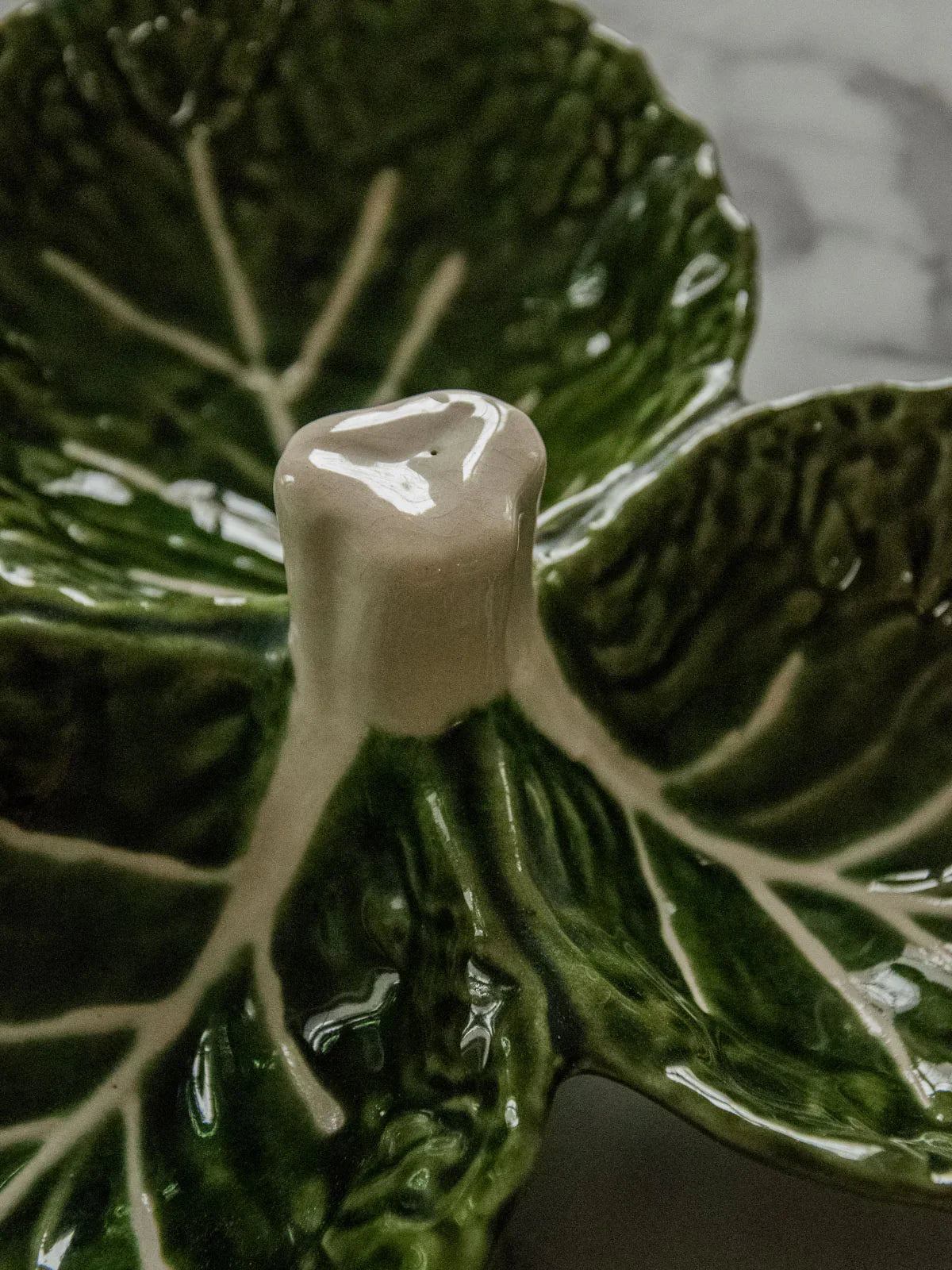 Découvrez ce plat en barbotine en forme de feuilles de chou, un bel objet des années 1970 au décor naturel et à l'émaillage brillant qui capte la lumière. De diamètre généreux mais peu profond, il accueille fruits, salades ou desserts et s'impose comme centre de table ou plateau de service pour l'apéritif. Son vocabulaire végétal apporte une note rétro-bucolique idéale pour une table champêtre ou un intérieur contemporain en quête d'une touche organique. En excellent état, aucun accroc.