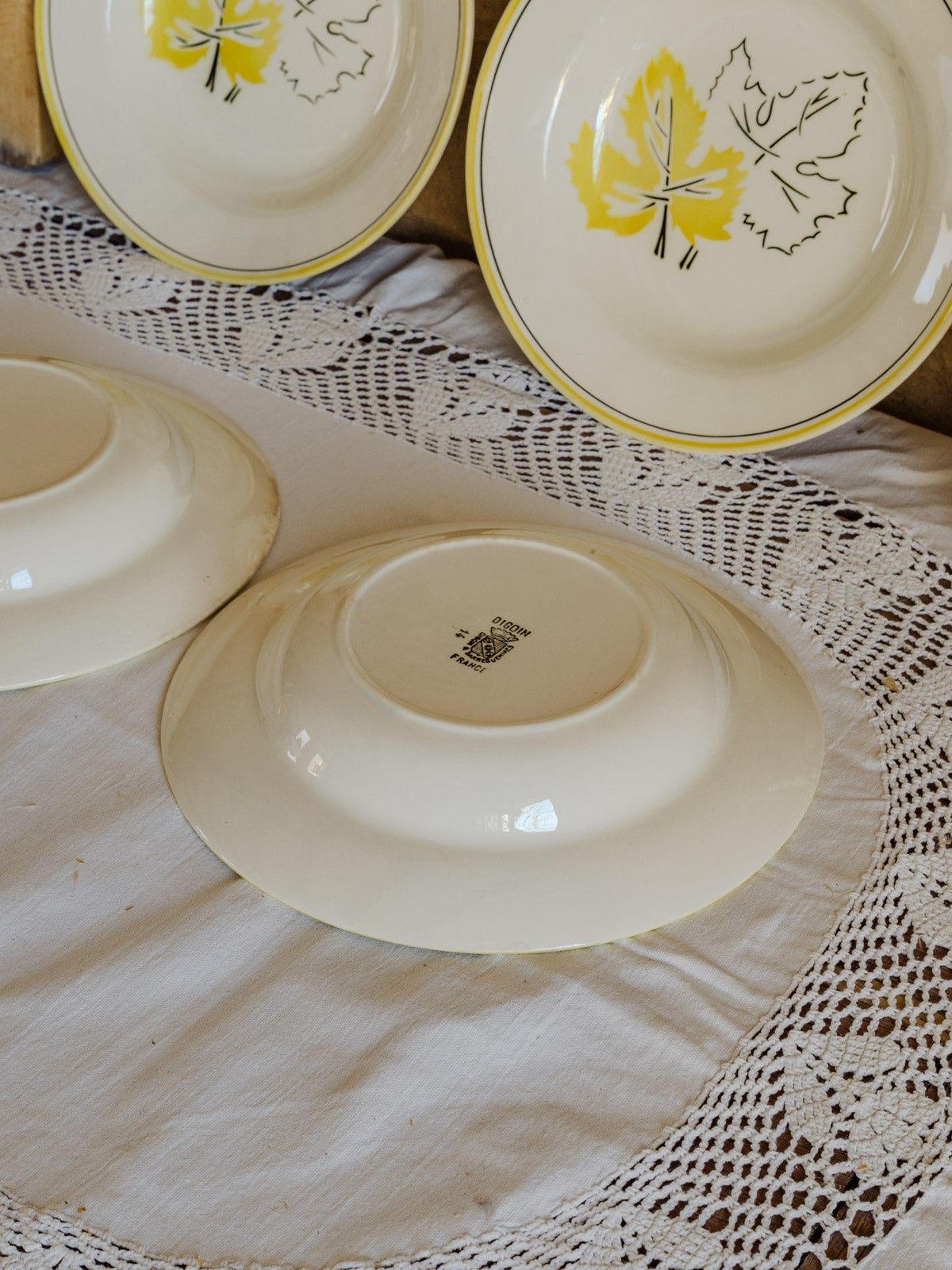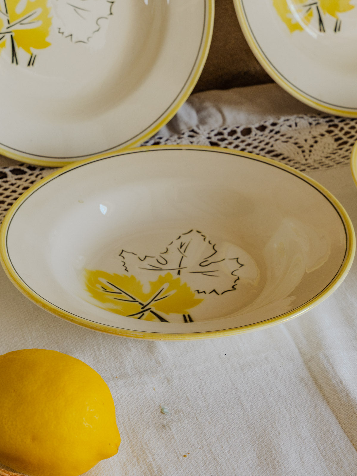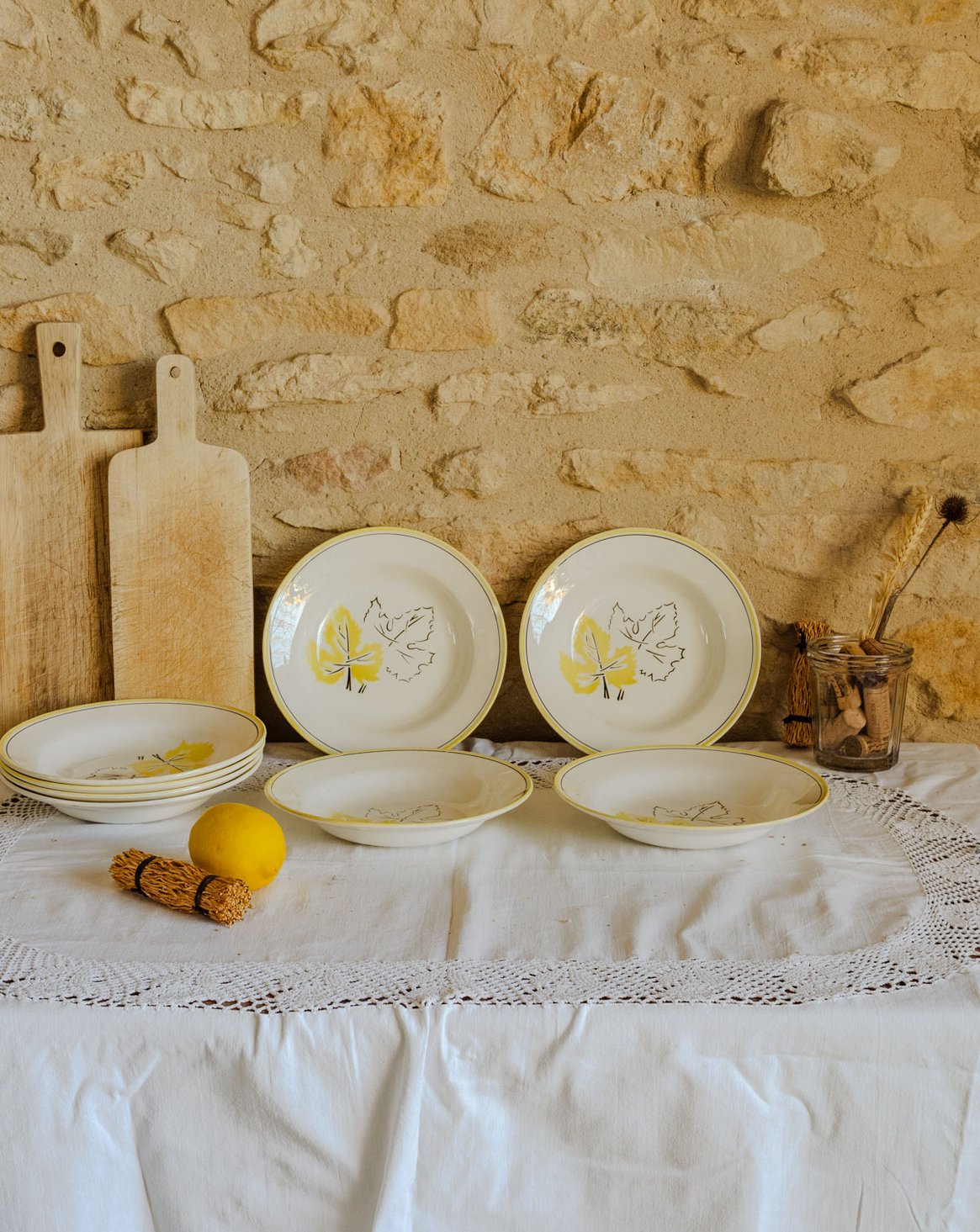 Apportez une touche ensoleillée à votre table avec ce lot de huit assiettes creuses en faïence de Sarreguemines et Oigoilk, rehaussées d'un liseré jaune et d'un motif feuille central en noir et jaune. Leur format convient parfaitement aux soupes, pâtes et plats en sauce, tandis que l'émail valorise la couleur et facilite le service. Elles dégagent un charme rétro et artisanal, idéal pour créer une ambiance conviviale et élégante.