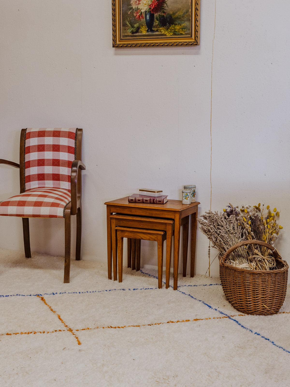 Apportez à votre intérieur un trio de tables gigognes en bois, au design sobre et élégant. Le jeu d'échelles — grande, moyenne et petite — offre une modularité parfaite pour servir de table d'appoint, chevet ou support de présentation, et s'intègre aussi bien dans un salon contemporain que dans un intérieur plus classique. La belle patine du bois souligne une ambiance chaleureuse et le grain naturel met en valeur la qualité de la matière. Quelques marques d'usage qui font son authenticité.