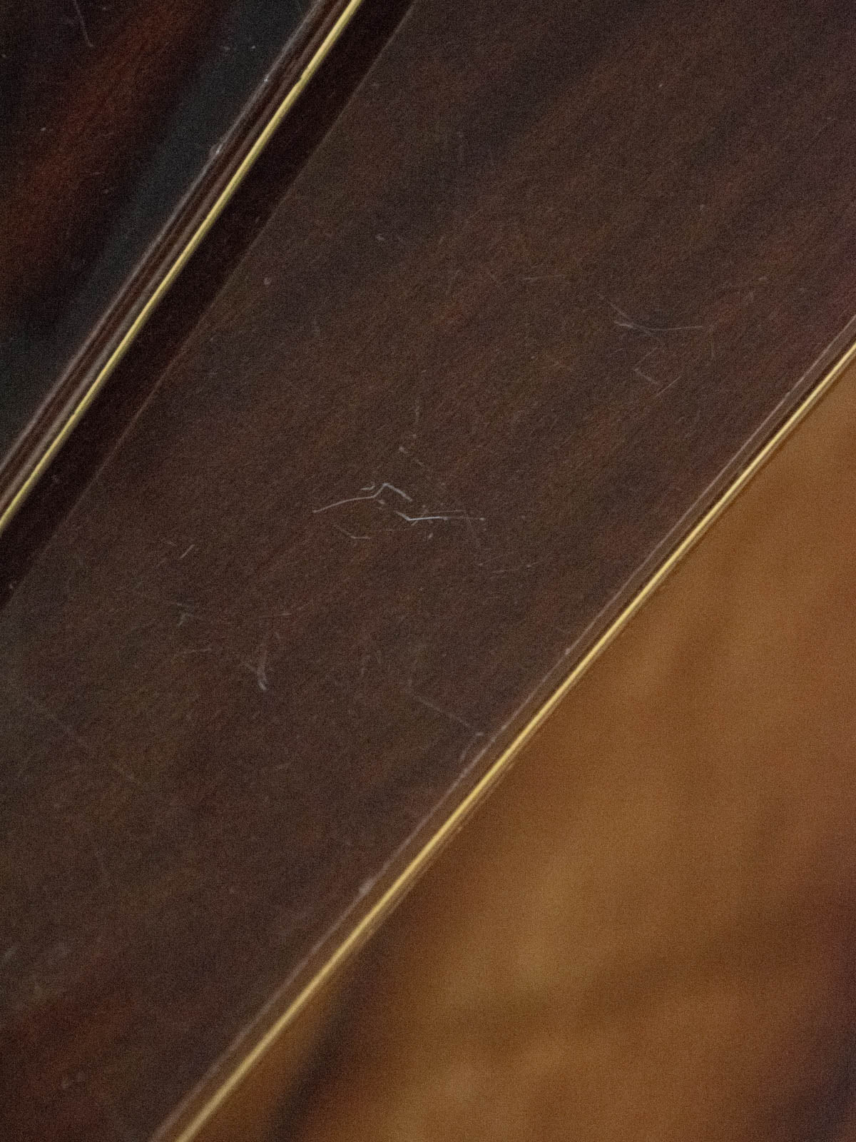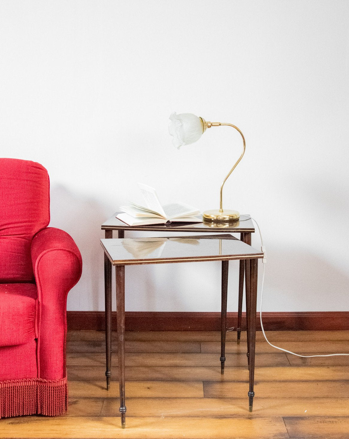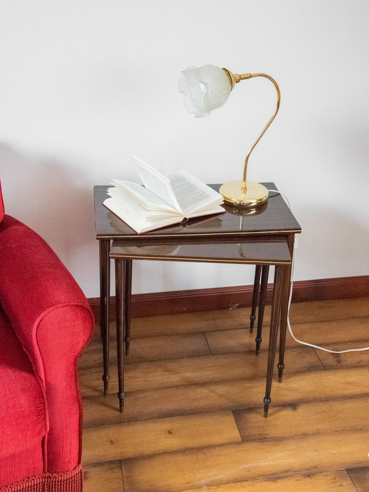 Apportez une touche de finesse à votre intérieur avec cette paire de tables gigognes au plateau plaqué et laqué, rehaussées d'un liseré doré qui souligne élégamment chaque contour; leur gabarit imbriqué optimise l'espace et permet d'installer une lampe, une tasse ou des objets décoratifs selon vos besoins, tandis que les pieds fuselés et leurs embouts métalliques apportent une délicate note sophistiquée. Quelques égratignures et un angle supérieur droit abîmé sur la plus petite table.