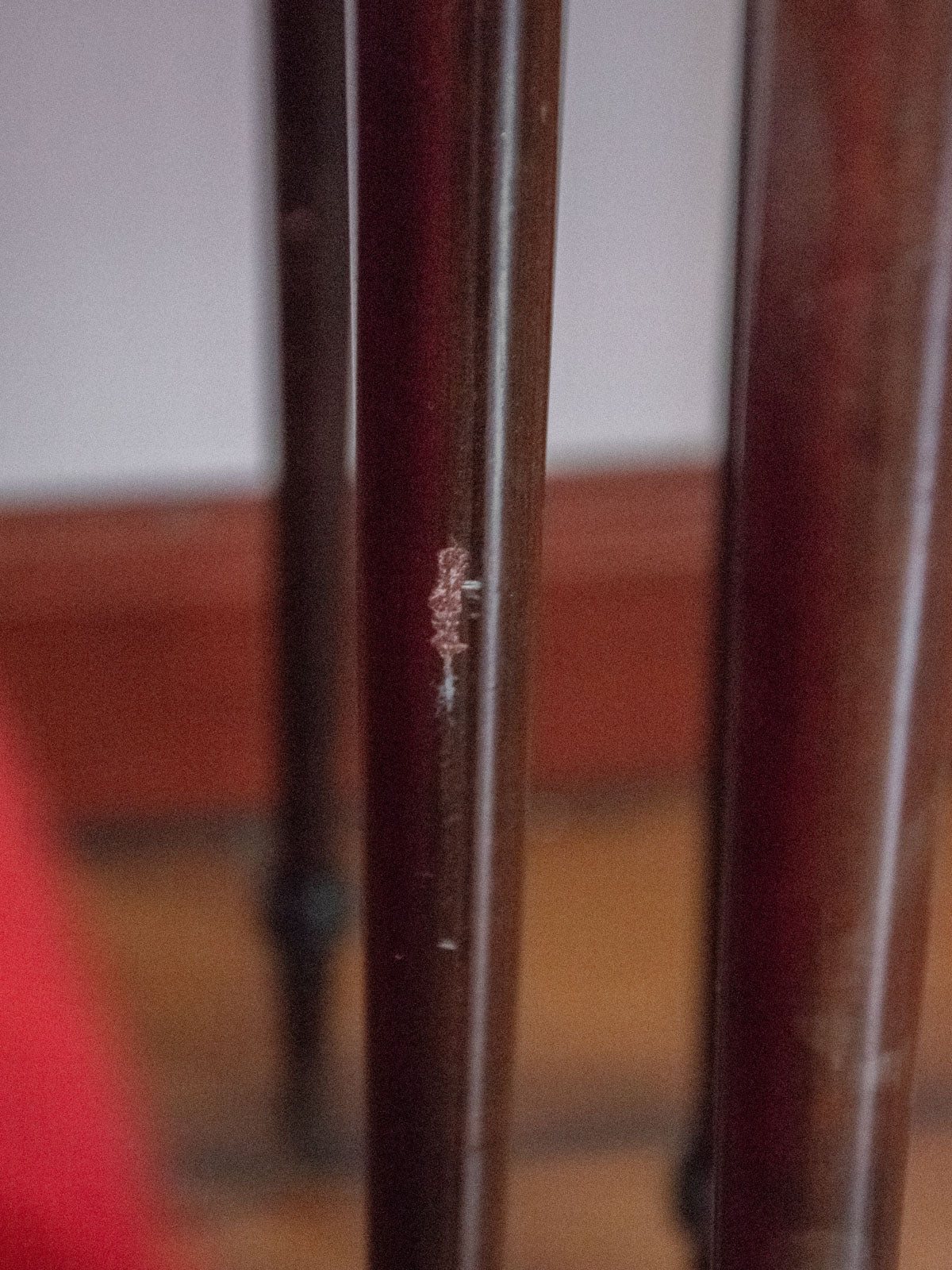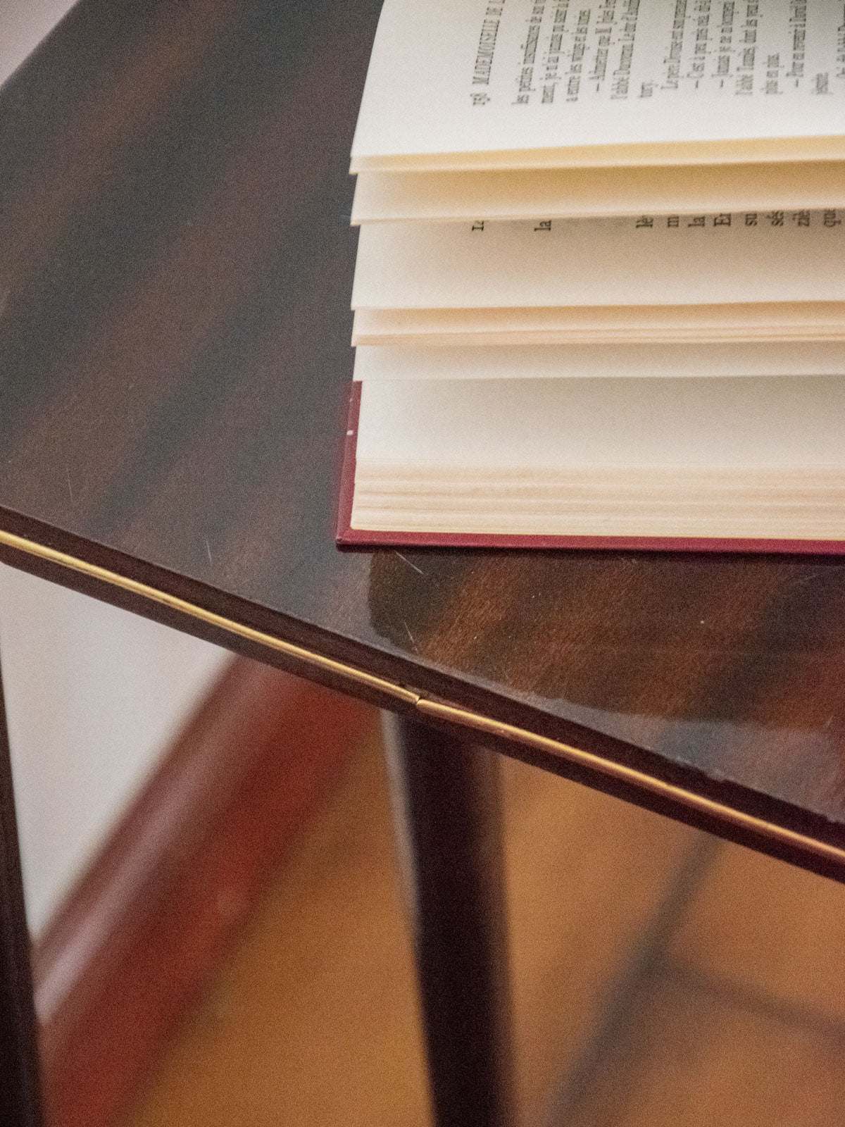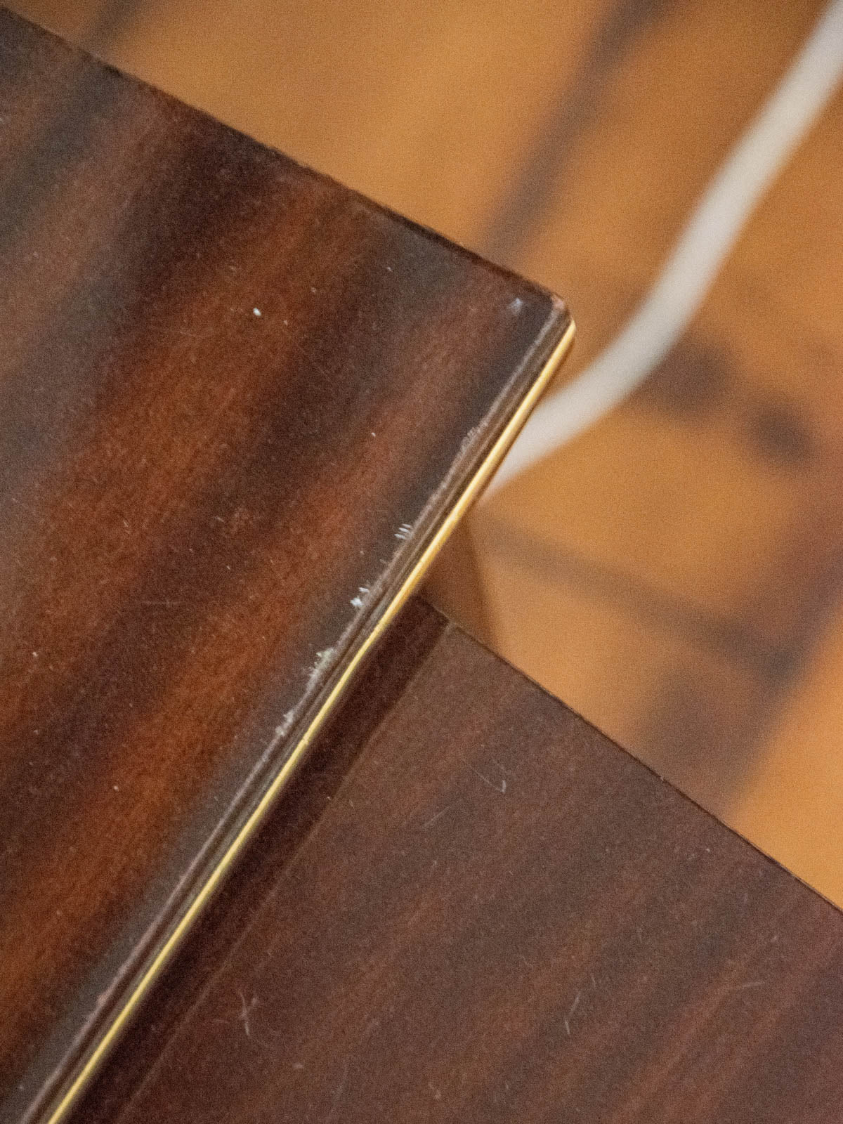 Apportez une touche de finesse à votre intérieur avec cette paire de tables gigognes au plateau plaqué et laqué, rehaussées d'un liseré doré qui souligne élégamment chaque contour; leur gabarit imbriqué optimise l'espace et permet d'installer une lampe, une tasse ou des objets décoratifs selon vos besoins, tandis que les pieds fuselés et leurs embouts métalliques apportent une délicate note sophistiquée. Quelques égratignures et un angle supérieur droit abîmé sur la plus petite table.