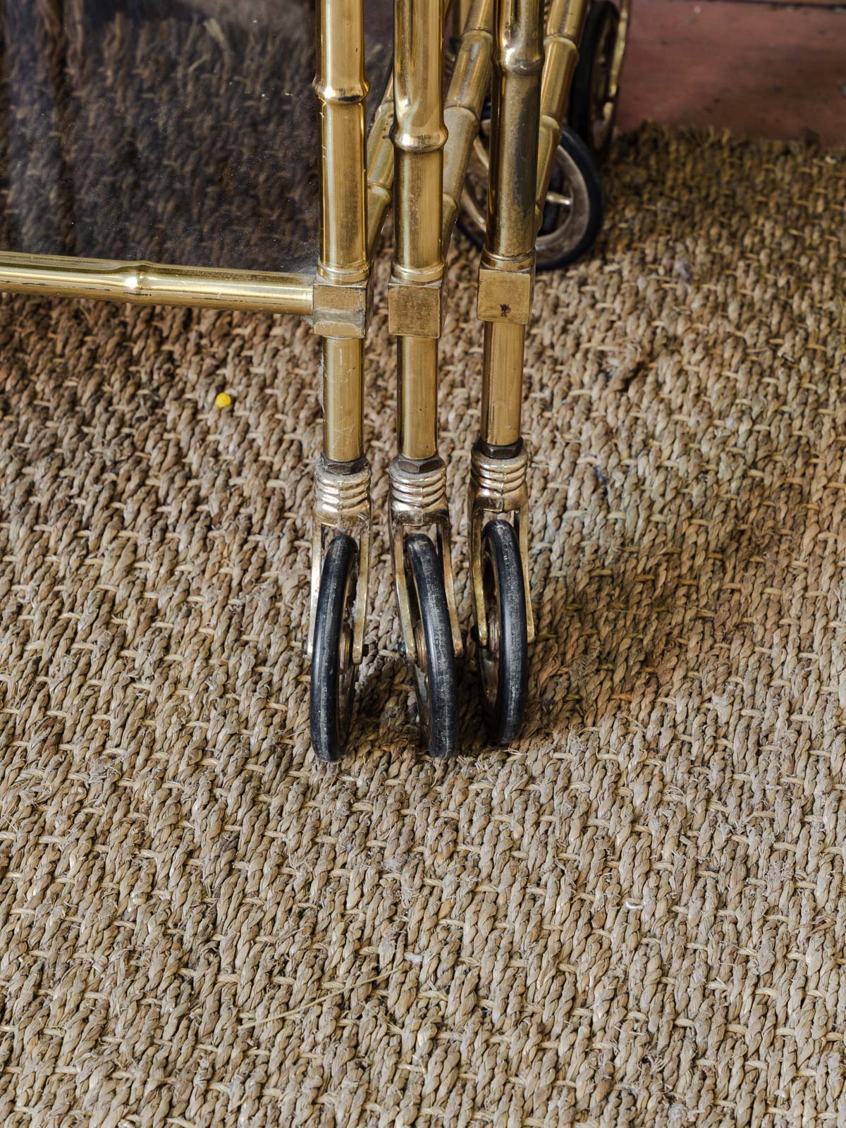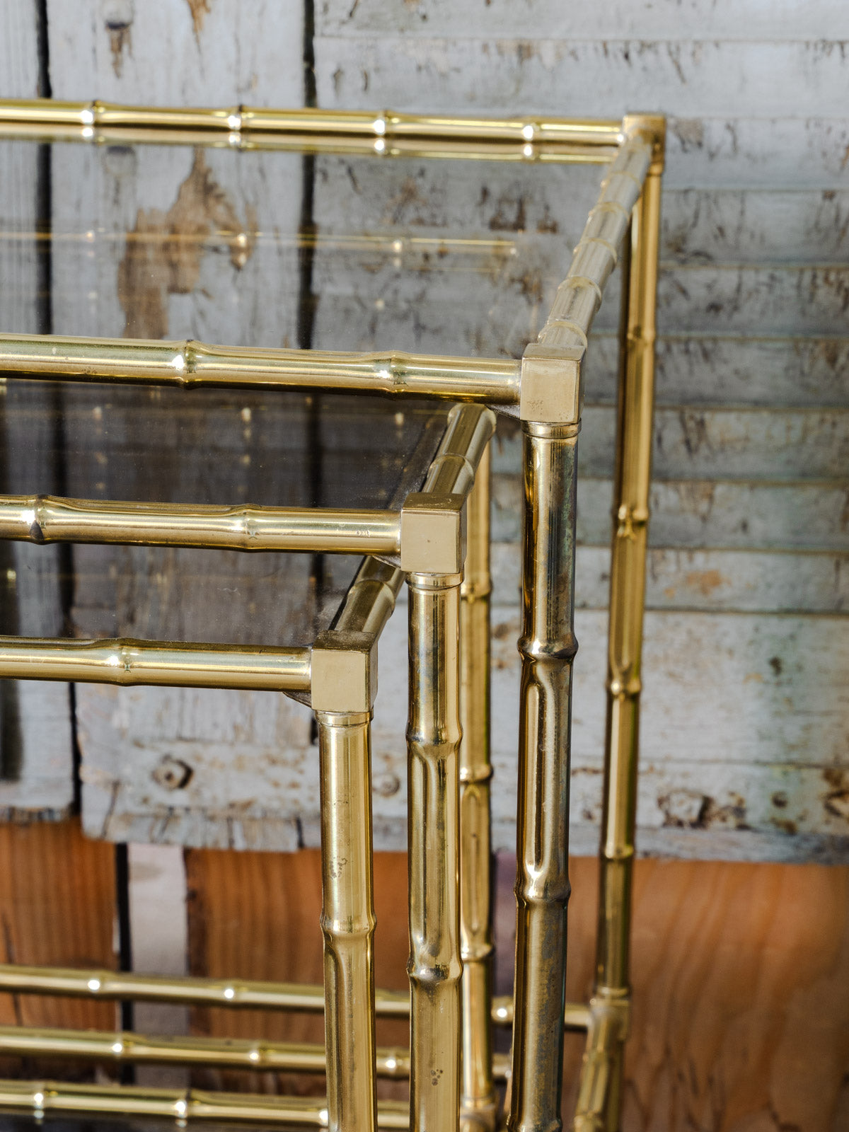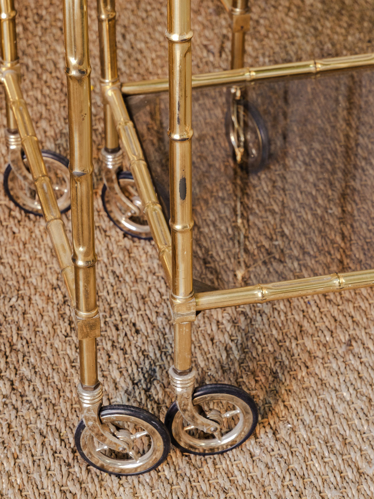 Apportez une touche raffinée à votre salon avec ce trio de tables gigognes en laiton doré et verre fumé, qui combine élégance et praticité. Assemblées sur roulettes, elles se déplacent facilement pour servir d'appoint, de bout de canapé ou comme plateau occasionnel, leur proportion variée permettant un usage modulable selon l'espace. Le verre fumé nuance la lumière et le laiton patiné réchauffe l'ambiance, créant une atmosphère feutrée et contemporaine. Quelques traces du temps présentes.