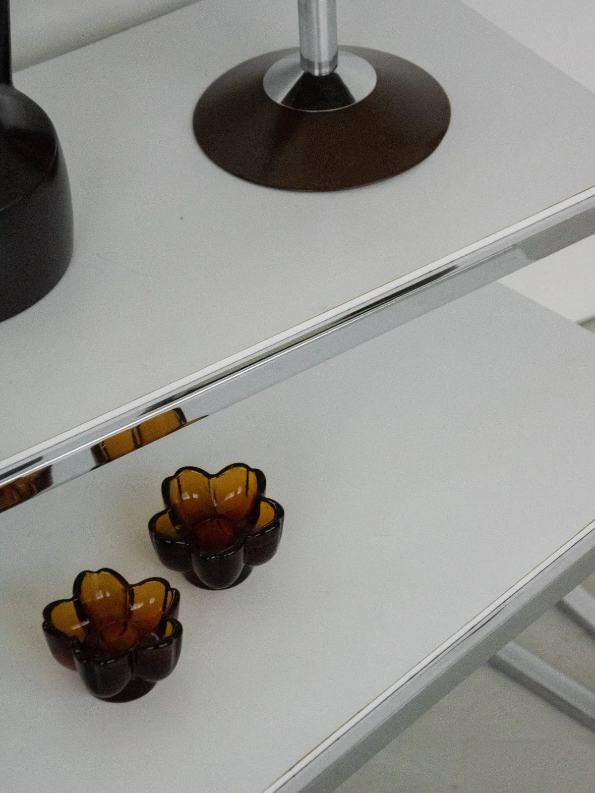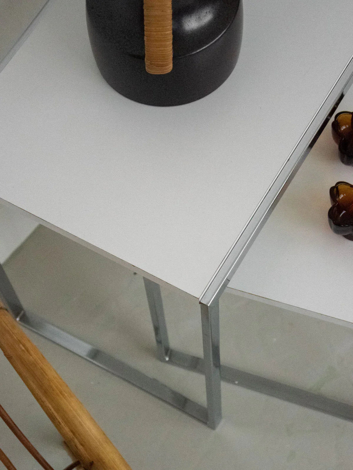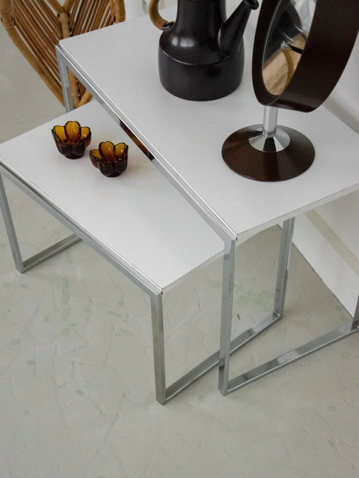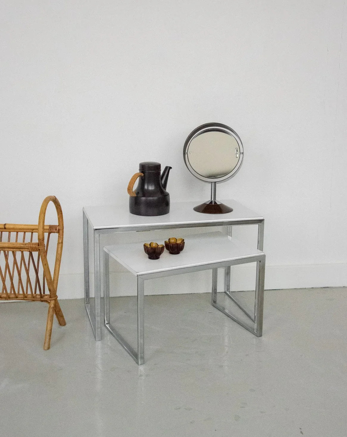 Adoptez ce duo de tables gigognes vintage des années 70, porté par une structure en métal chromé et des plateaux en formica aux finitions lisses. Le jeu de proportions permet un rangement imbriqué et une utilisation modulable — bout de canapé, chevet ou table d'appoint — pour structurer un salon au charme rétro. Le chromé capte la lumière et apporte une note graphique et légère à votre intérieur. Quelques discrets éclats de formica aux angles.