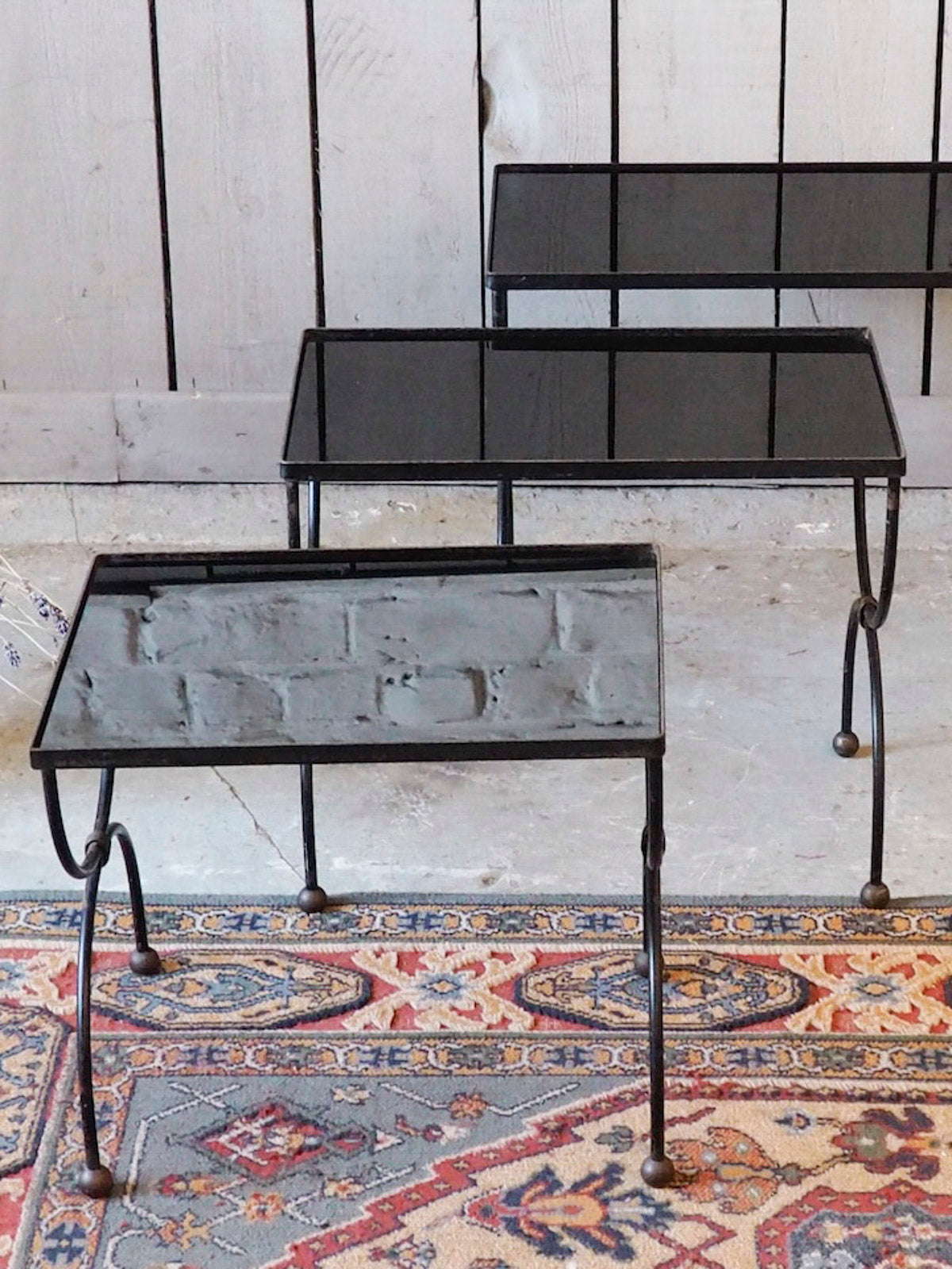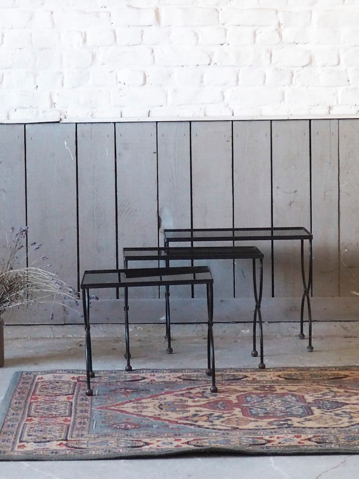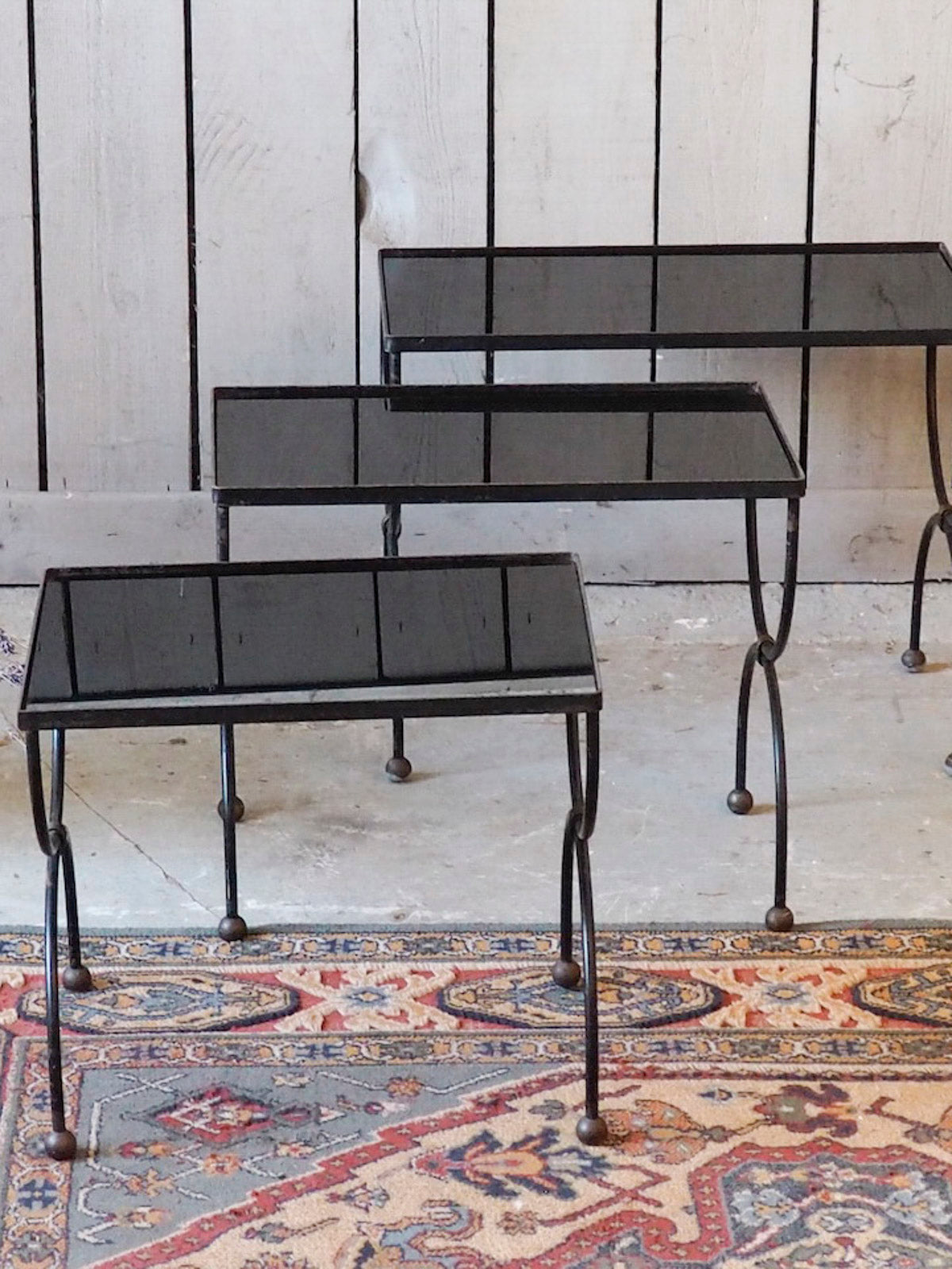 Découvrez cet ensemble de trois tables gigognes des années 1950, au design graphique et architectural. Conjuguant fer laqué, laiton et plateaux en verre opalin noir, elles jouent sur le contraste des matières et la délicatesse des pieds boules en laiton. Les formats complémentaires s'emboîtent pour libérer de l'espace ou se déployer en tables d'appoint dans un salon ou une chambre, créant une ambiance rétro sophistiquée et parfaitement maîtrisée.
