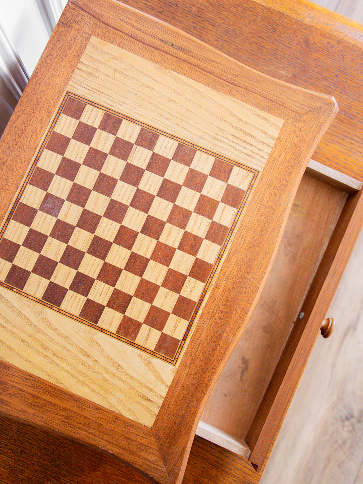 Découvrez cette élégante boîte de rangement qui fait aussi office d’échiquier. Elle est composée de plusieurs tons de bois, offrant un joli contraste naturel. Un tiroir discret permet de ranger les pièces ou d’autres petits objets. Son format compact et décoratif en fait un bel objet à exposer. Parfaite pour les amateurs de jeux et de beaux matériaux.