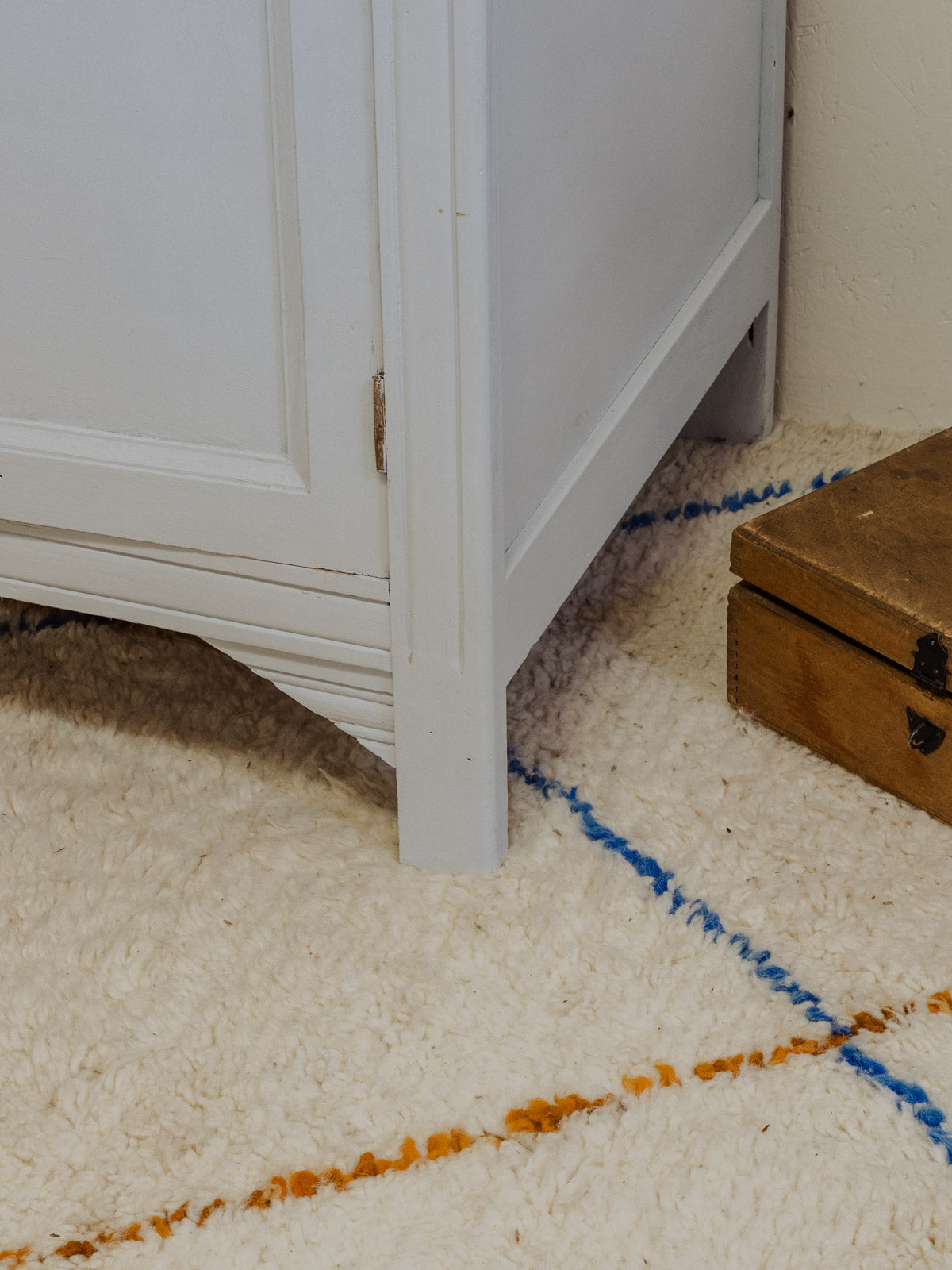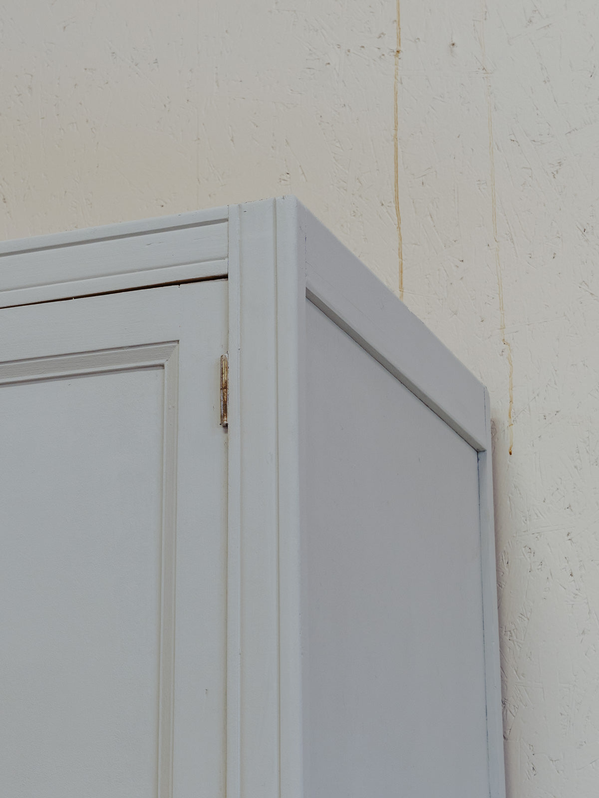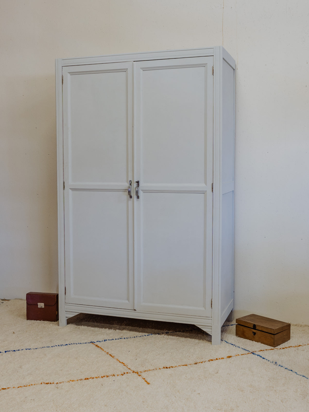 Découvrez cette armoire en bois peinte d'un bleu ciel nuancé de gris, dont la silhouette élancée apporte une touche douce et contemporaine à toute pièce. À l'intérieur, deux étagères et un revêtement en bois clair offrent des rangements organisés et adaptés aux volumes du quotidien, tandis que la poignée argentée et la serrure avec clé soulignent son caractère fonctionnel et raffiné. Quelques traces du temps présentes.