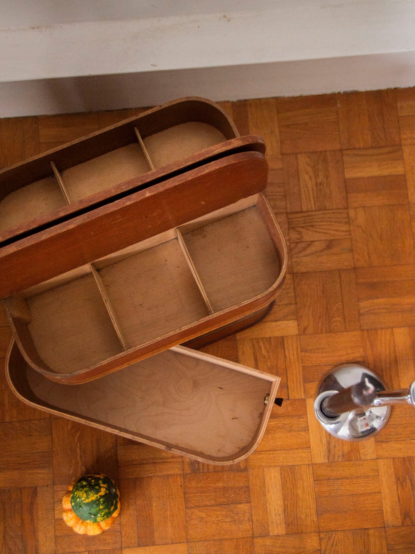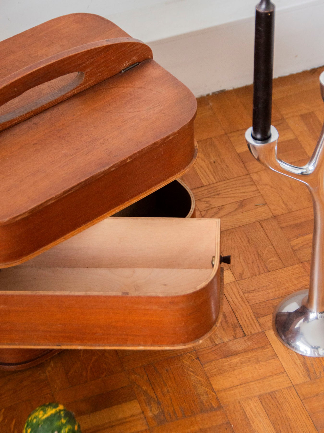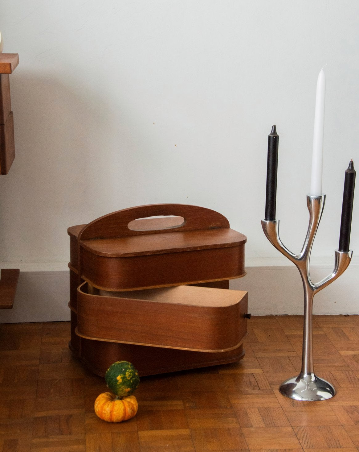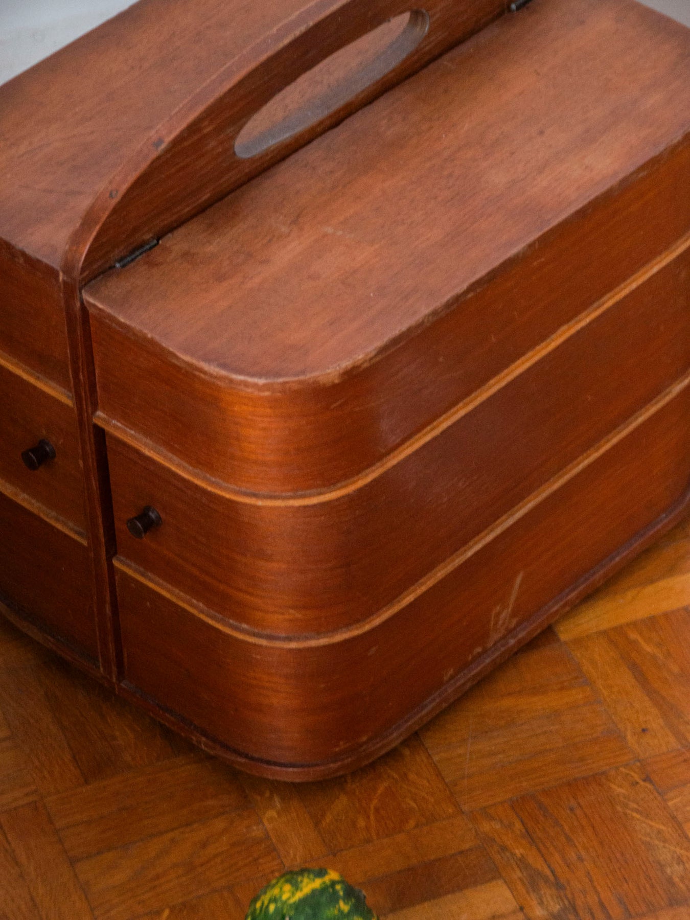 Découvrez cette travailleuse scandinave des années 1960 en teck, rare et élégamment dessinée au Danemark. Son design tout en courbes met en valeur la chaleur du bois et des poignées fuselées tandis que ses compartiments à couvercle et ses tiroirs pivotants offrent un rangement ingénieux pour accessoires et objets précieux. Compacte et polyvalente, elle s'intègre aussi bien dans un atelier que sur une console dans un salon, apportant une touche intemporelle et accueillante. Quelques traces d'usage mais en très bon état.