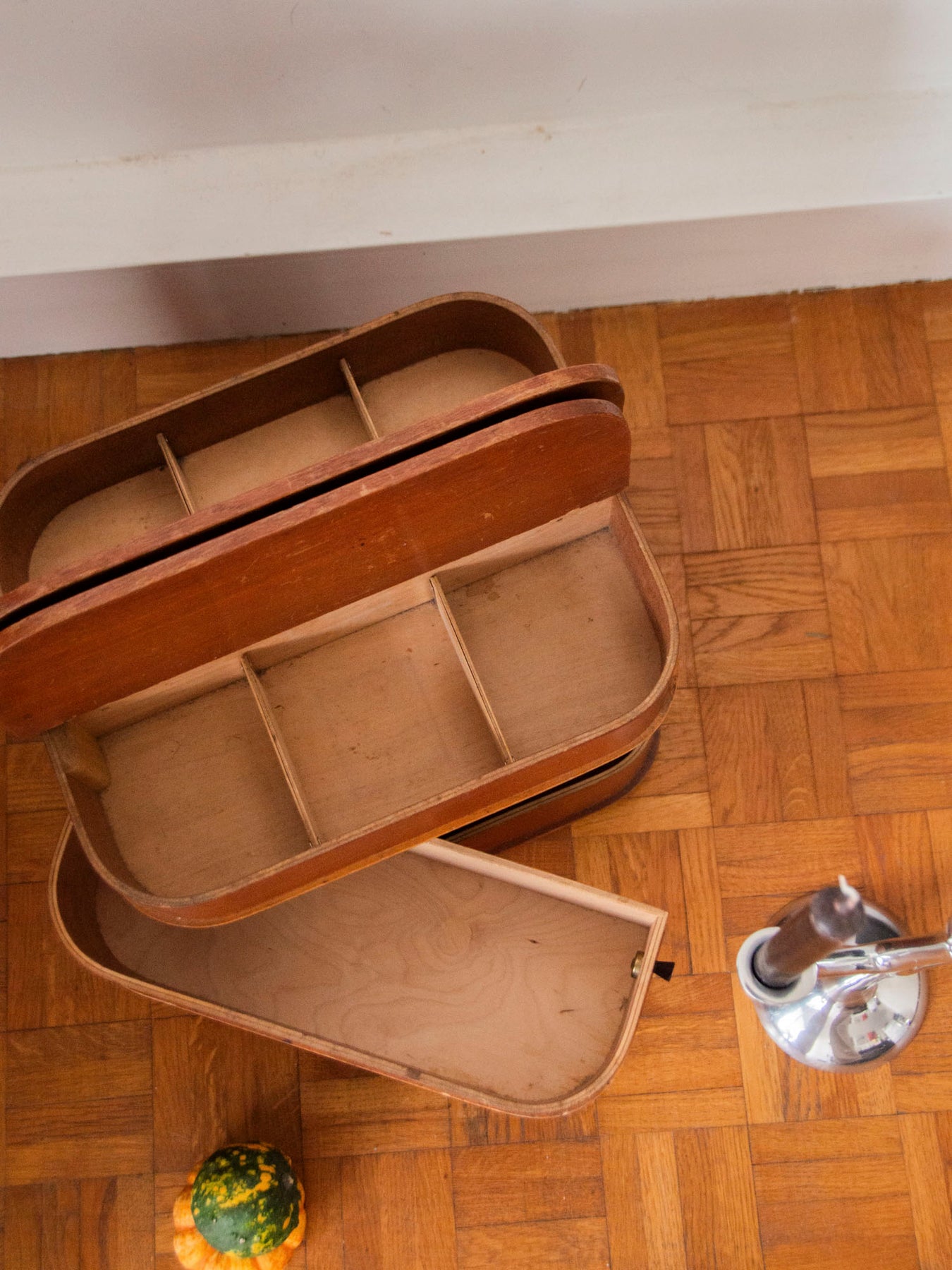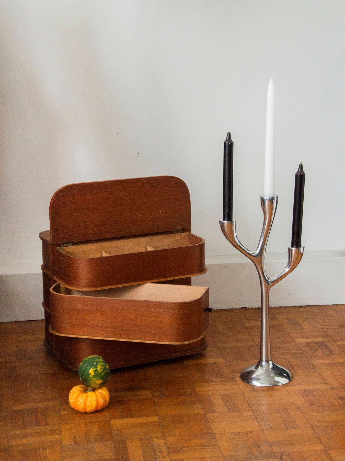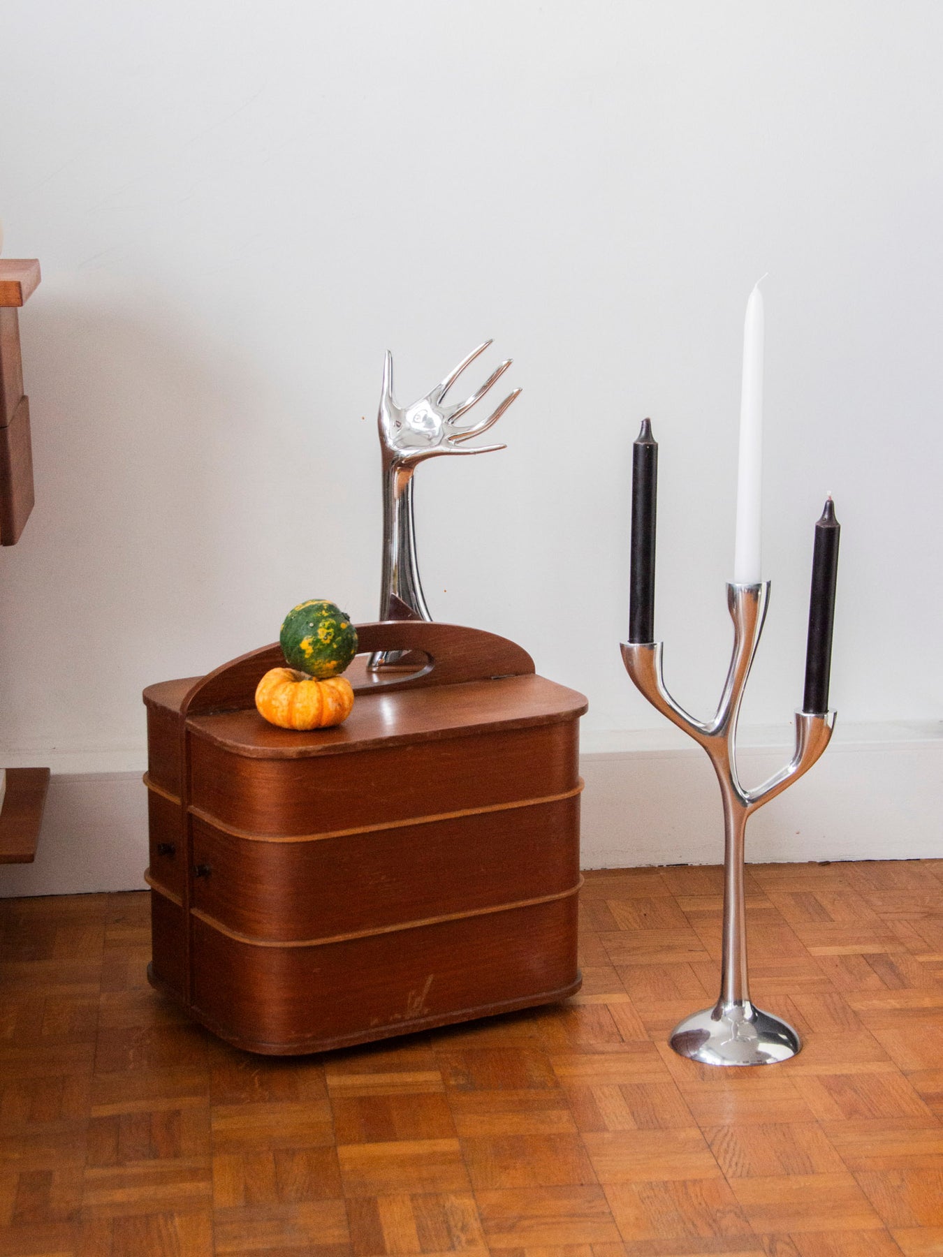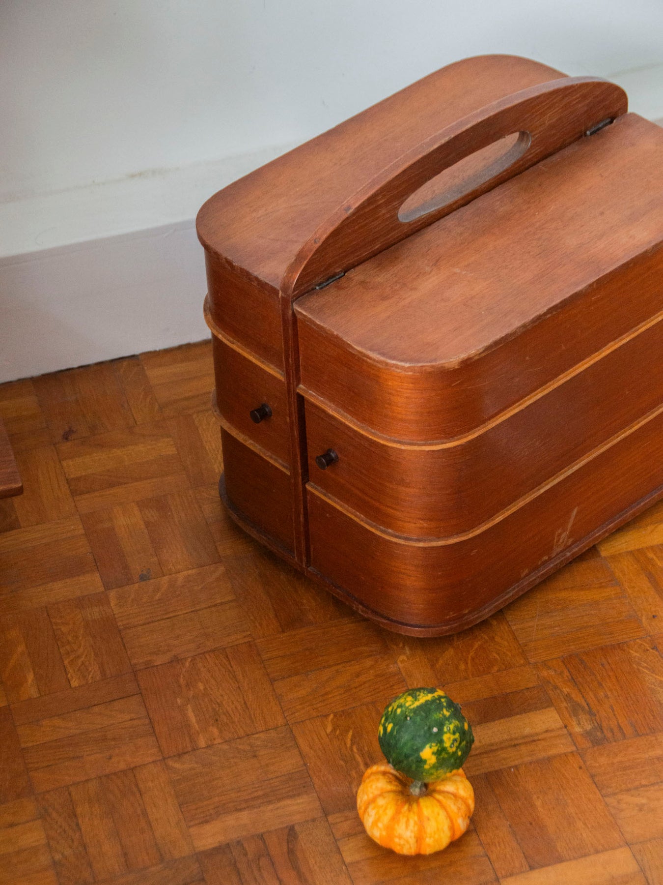 Découvrez cette travailleuse scandinave des années 1960 en teck, rare et élégamment dessinée au Danemark. Son design tout en courbes met en valeur la chaleur du bois et des poignées fuselées tandis que ses compartiments à couvercle et ses tiroirs pivotants offrent un rangement ingénieux pour accessoires et objets précieux. Compacte et polyvalente, elle s'intègre aussi bien dans un atelier que sur une console dans un salon, apportant une touche intemporelle et accueillante. Quelques traces d'usage mais en très bon état.