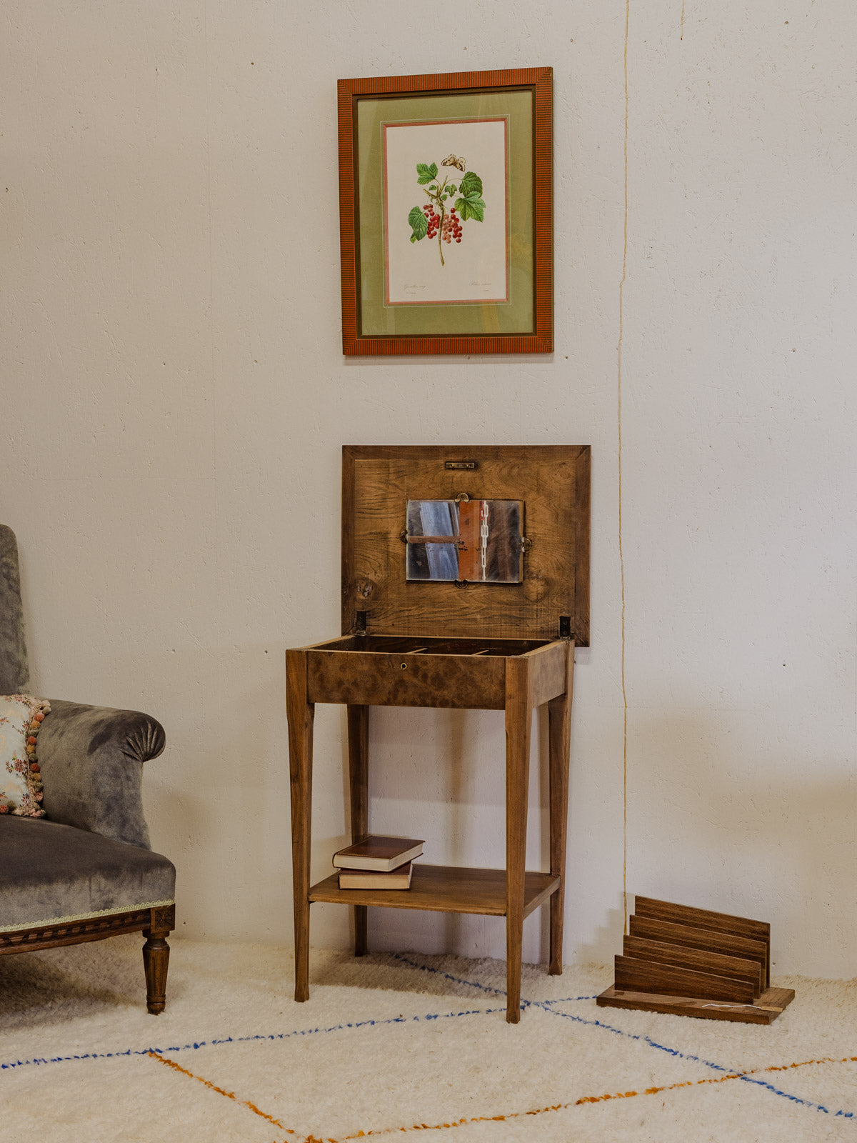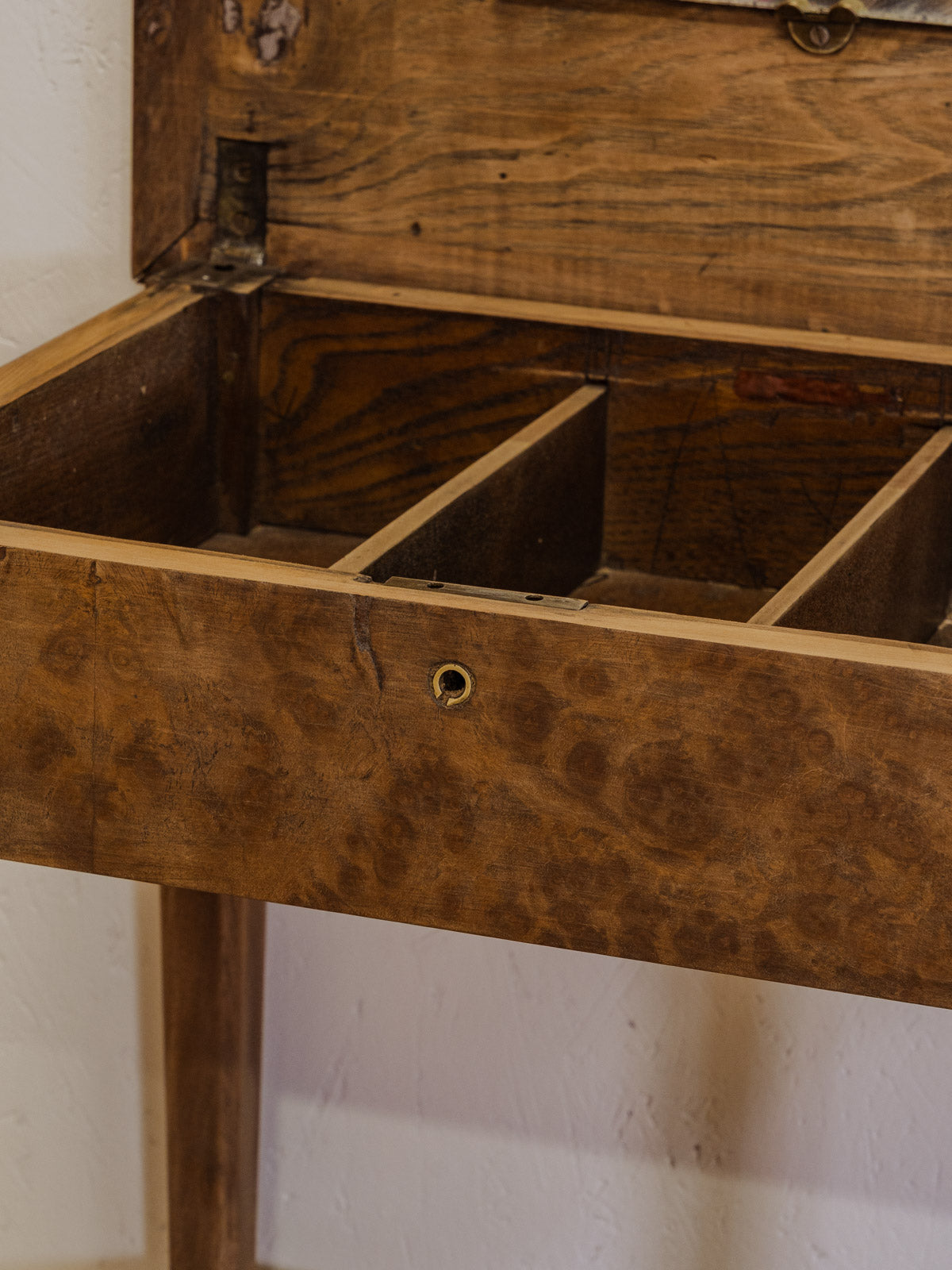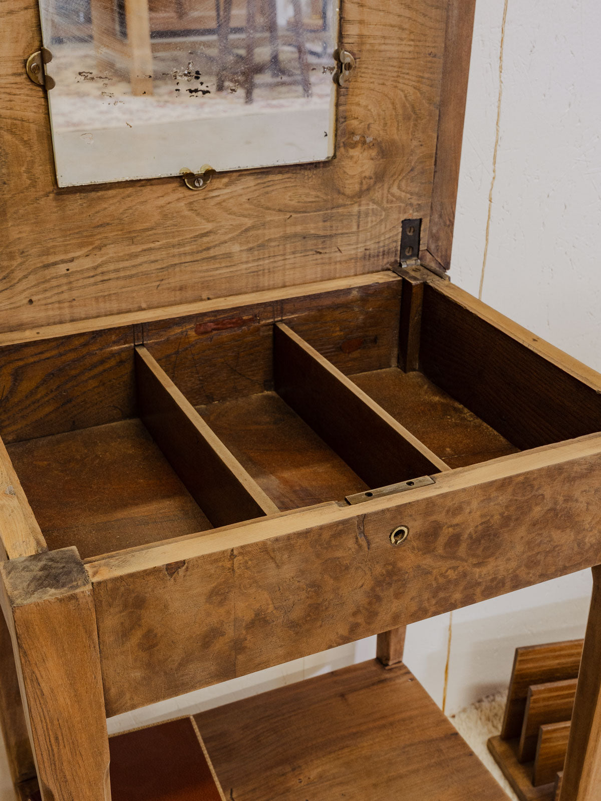 Adoptez cette travailleuse en bois au charme discret, dont le plateau s'ouvre pour révéler un petit miroir et trois compartiments parfaits pour organiser accessoires et trésors. Son sous-plateau et sa serrure sans clé ajoutent une fonctionnalité raffinée, tandis que ses proportions la rendent idéale comme coiffeuse ou console. La chaleur du bois et sa patine créent une ambiance douce et vintage, prête à s'intégrer dans un intérieur élégant. Quelques traces du temps présentes.