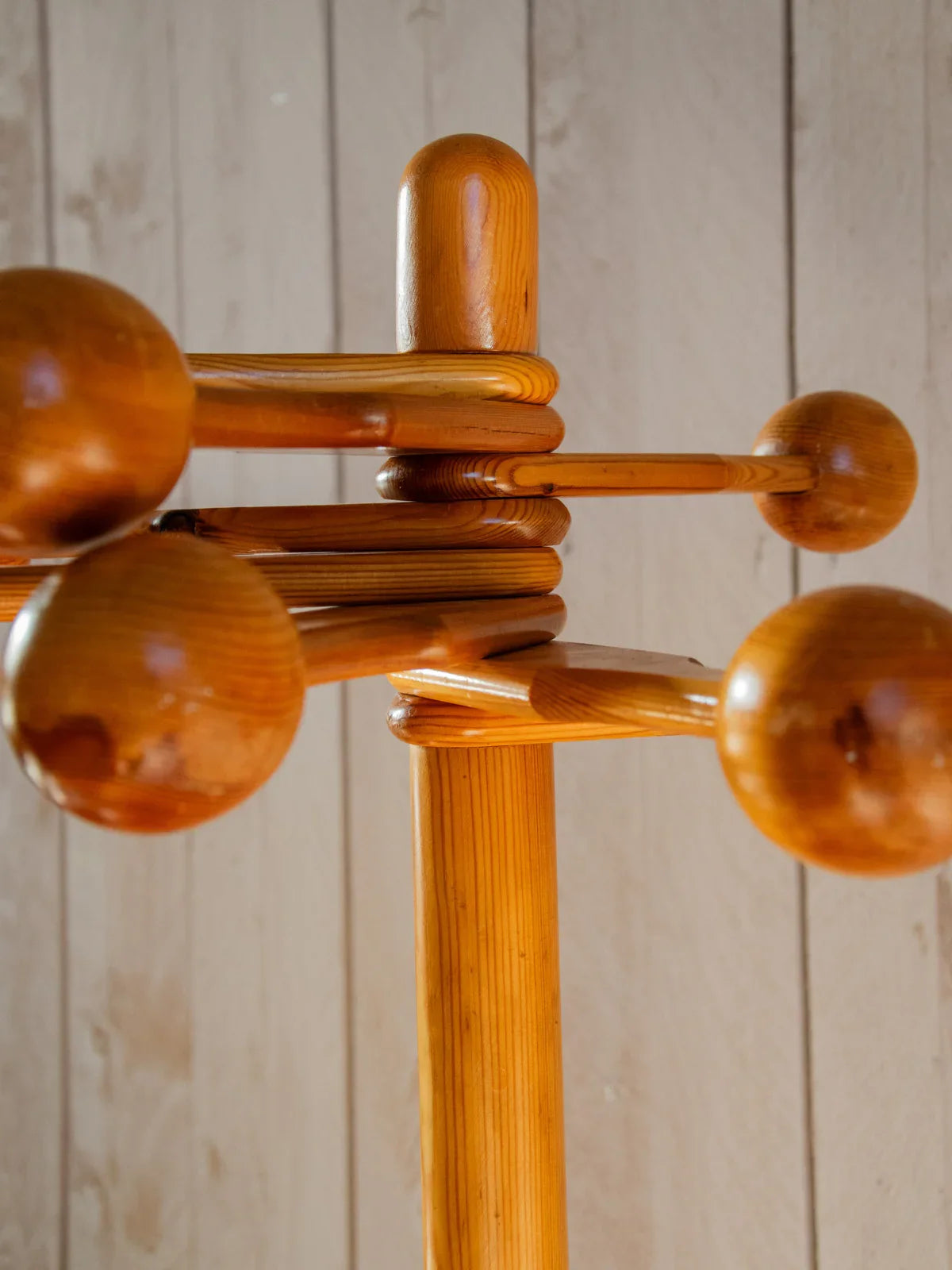 Invitez ce porte-manteaux ellipse des années 70 en bois, aux lignes organiques et chaleureuses, qui apporte une touche rétro maîtrisée à votre entrée ou dressing. Ses huit têtes, dont la position se règle, offrent une modularité pratique pour suspendre manteaux, chapeaux et écharpes, tandis que les pieds assurent une assise stable malgré un look sculptural. Sa patine révèle une belle matière, idéale pour une ambiance vintage contemporaine. Quelques marques d'usage sont présentes.