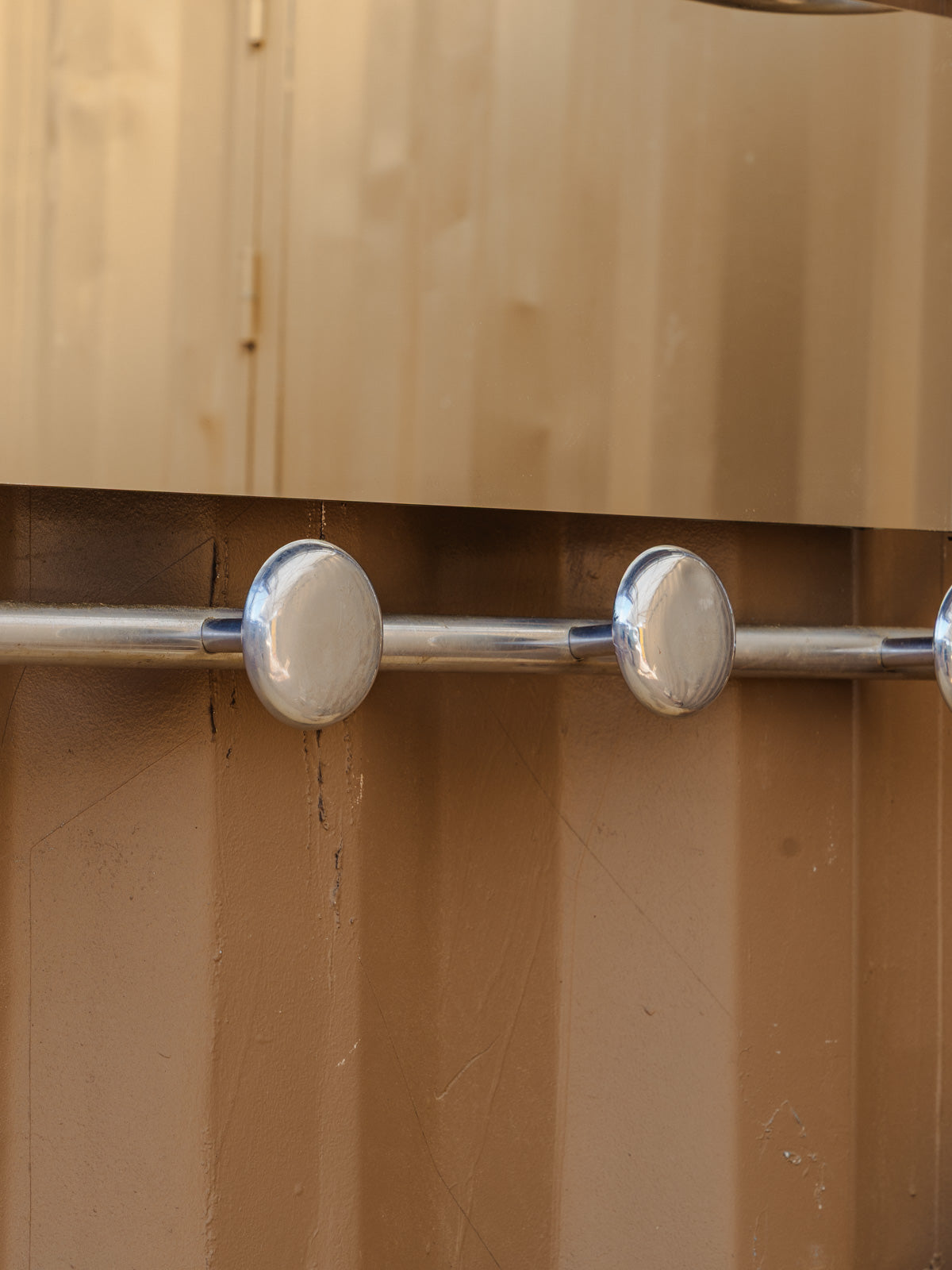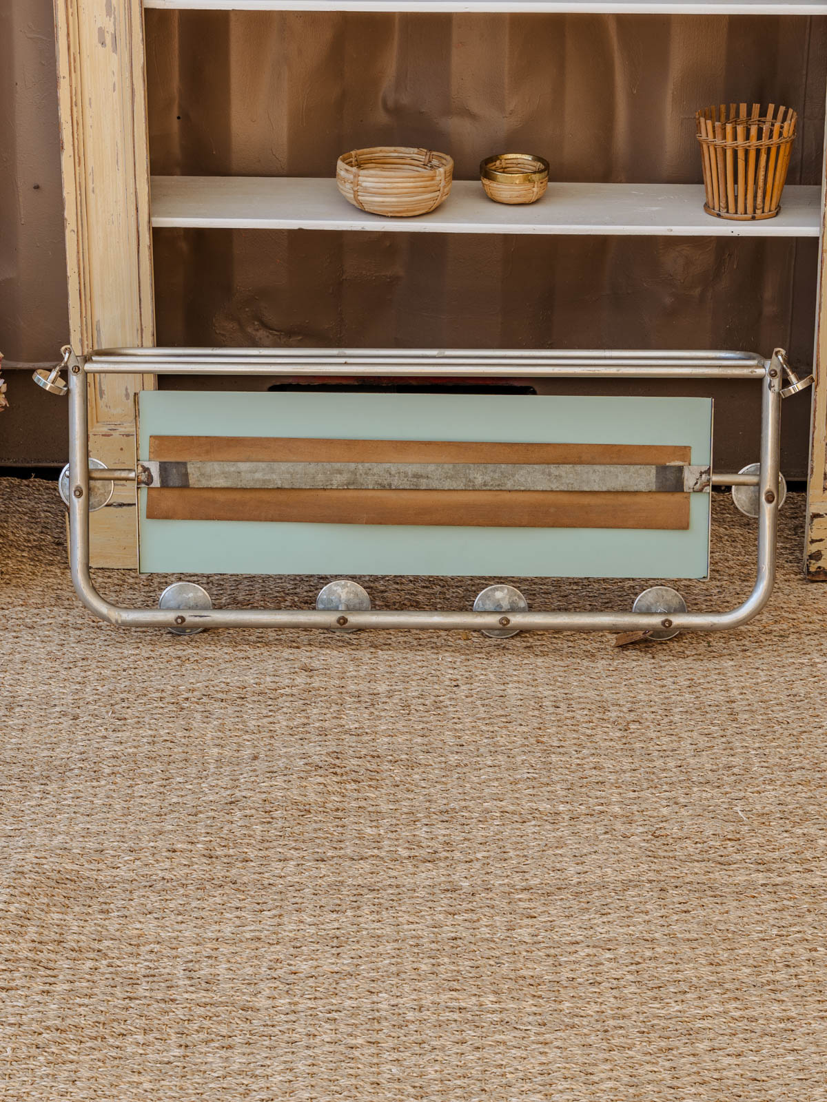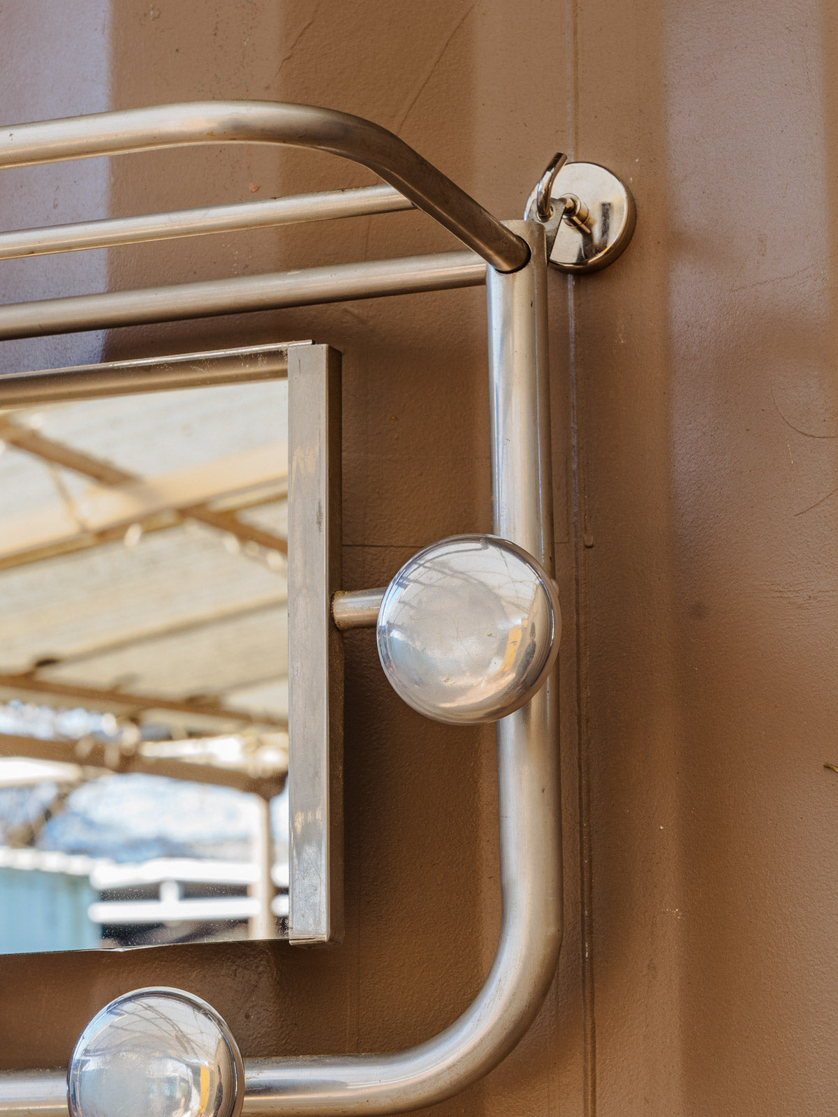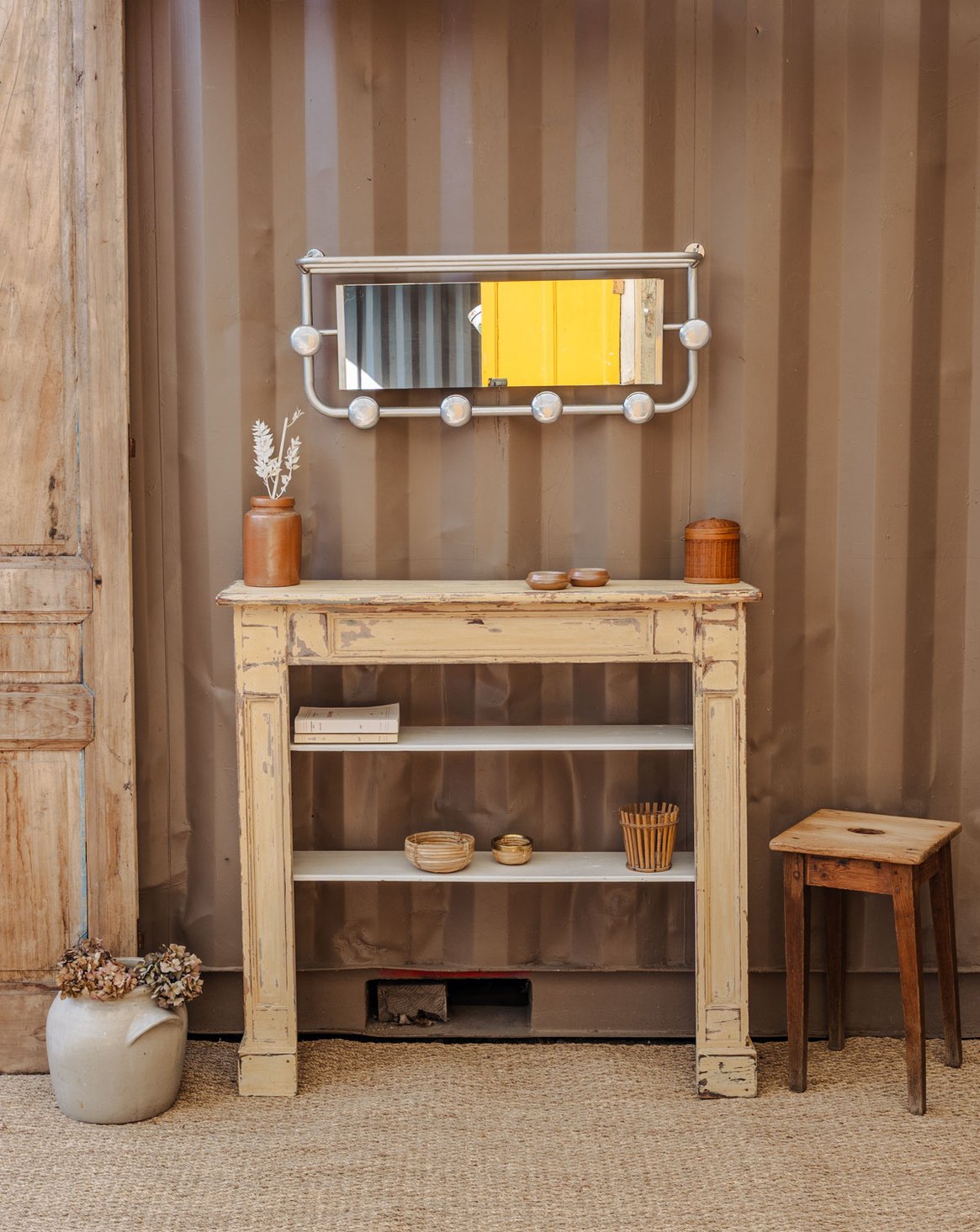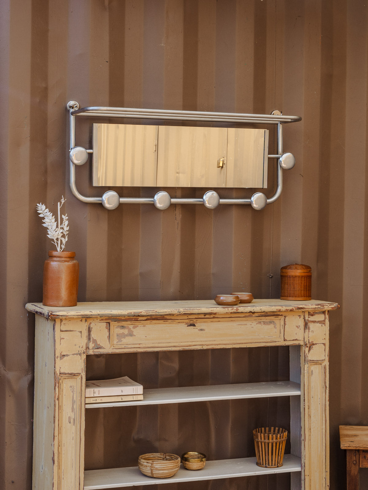 Ajoutez une note vintage et lumineuse à votre entrée avec ce porte-manteau chromé mural, équipé d'un miroir intégré et d'un plateau supérieur pour poser clés ou petits objets. Sa structure en métal poli lui donne une silhouette sobre et élégante. Ses six patères, accueillent manteaux, sacs et chapeaux sans encombrer l'espace, offrant un rangement fonctionnel et décoratif. Quelques traces du temps présentes.