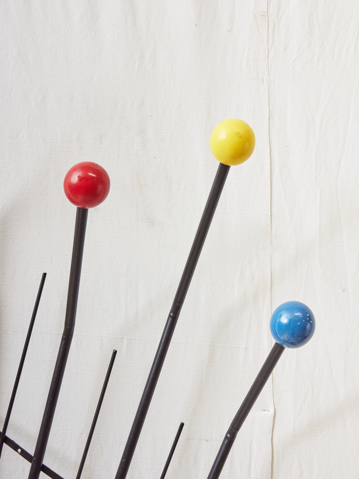 Invitez ce porte‑manteau en métal noir, ponctué de boules colorées et associé à un miroir en verre, pour une entrée à la fois ludique et raffinée. Sa structure verticale optimise le rangement des manteaux, chapeaux et écharpes tout en restant légère visuellement, et le miroir intégré agrandit l'espace et réfléchit la lumière. Le contraste entre le métal sombre et les touches vives apporte une note contemporaine chaleureuse et graphique.