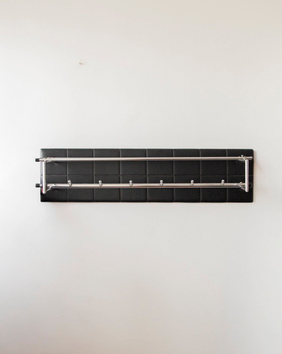 Adoptez ce porte-manteau mural des années 1960 habillé d’un simili cuir noir mat capitonné sur une tablette en bois, qui apporte une touche rétro et raffinée à l’entrée ou à la chambre. Ses deux supports chromés rectangulaires et ses six patères métalliques, complétés par plusieurs barres pour chapeaux, offrent un rangement organisé et visuellement léger. Sa taille contenue mais généreuse s’intègre facilement dans différents espaces, incarnant un style sobre et chaleureux.