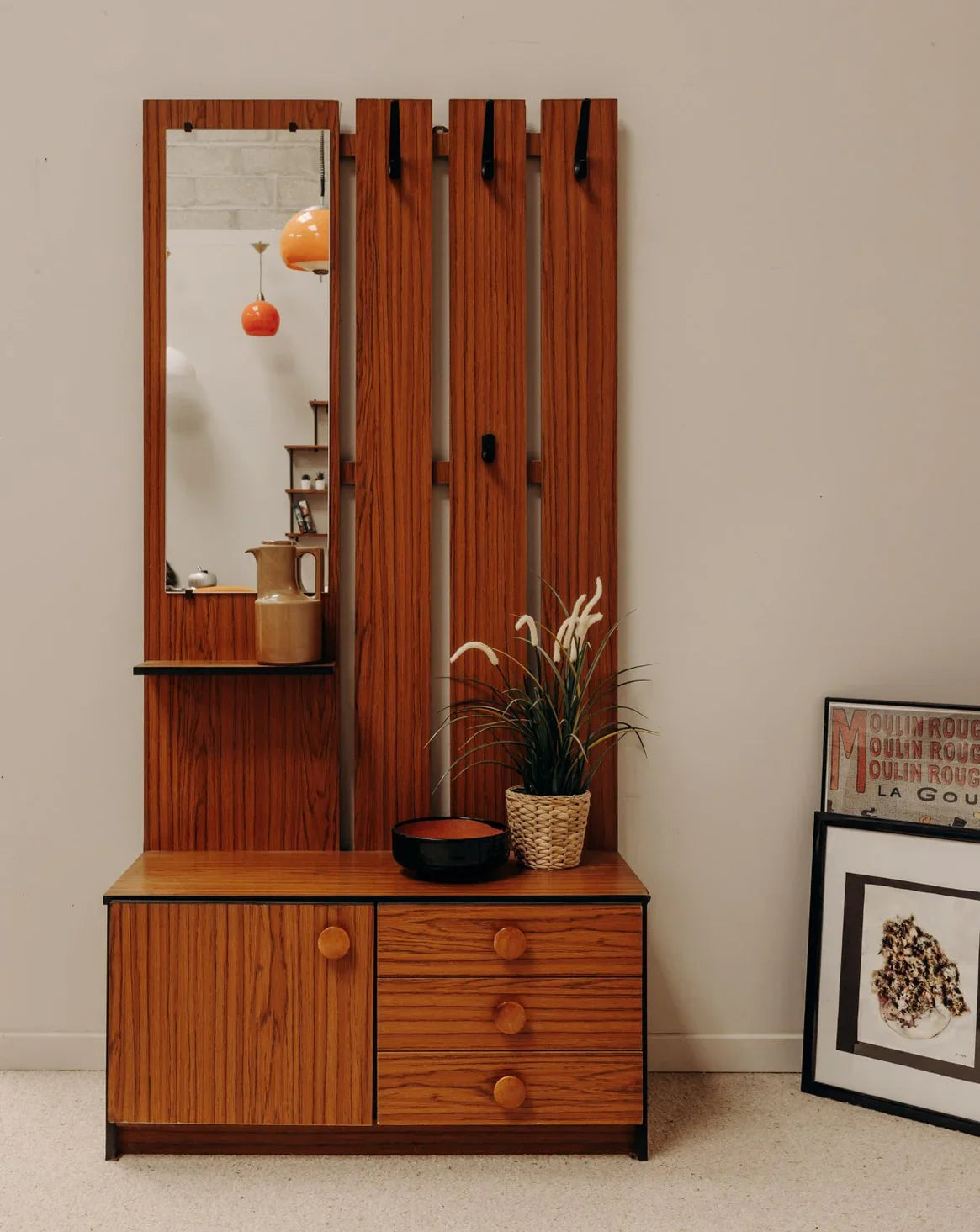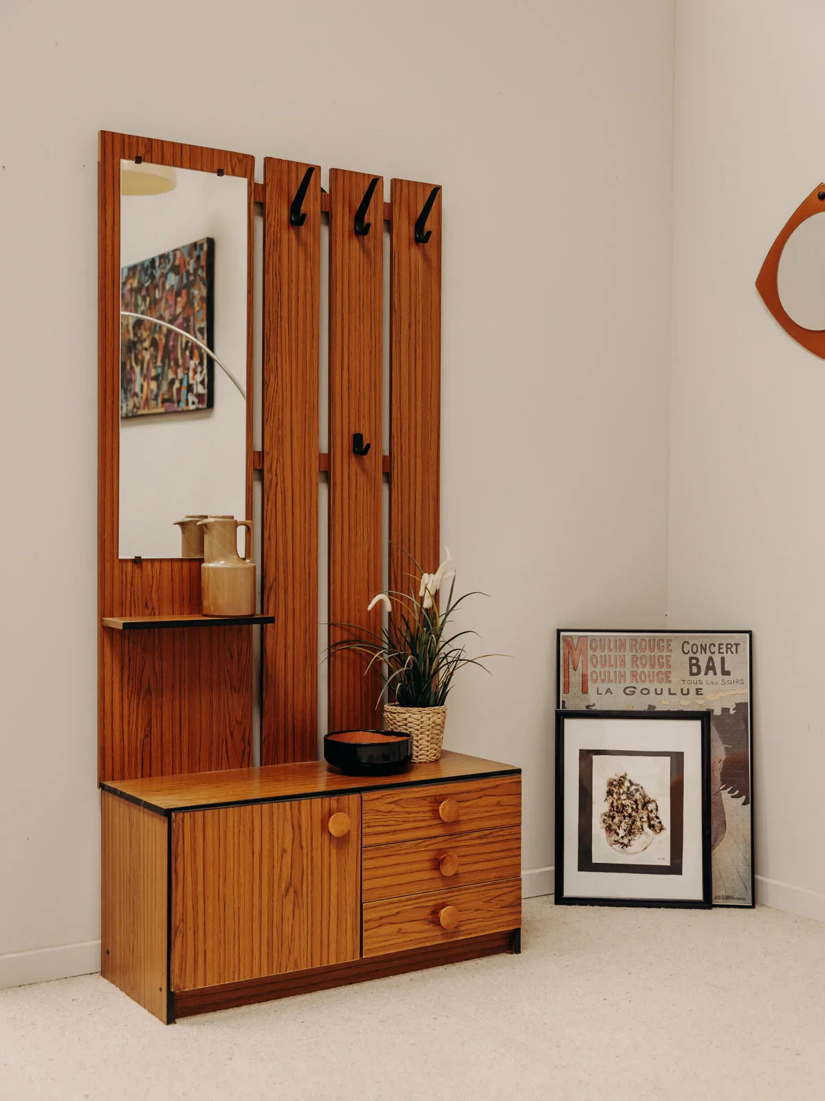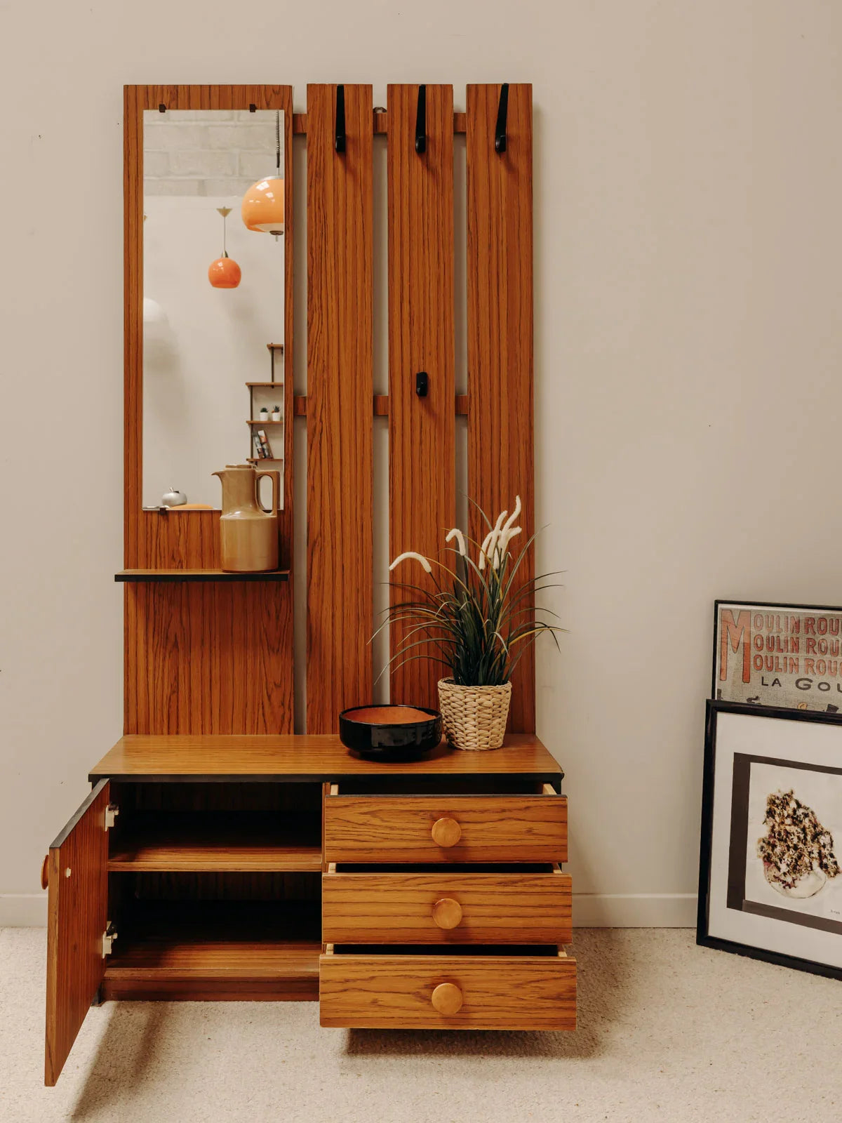 Adoptez ce vestiaire en placage de bois au design rétro, équipé d'un miroir intégré surmonté d'un petit plateau, de patères en partie haute et basse, et de trois tiroirs ainsi qu'un placard pour organiser vêtements et accessoires; son gabarit élancé s'intègre idéalement dans une entrée ou une chambre, apportant chaleur et fonctionnalité grâce à la teinte boisée et aux rangements pensés; manques de placage et accroc sur un côté.