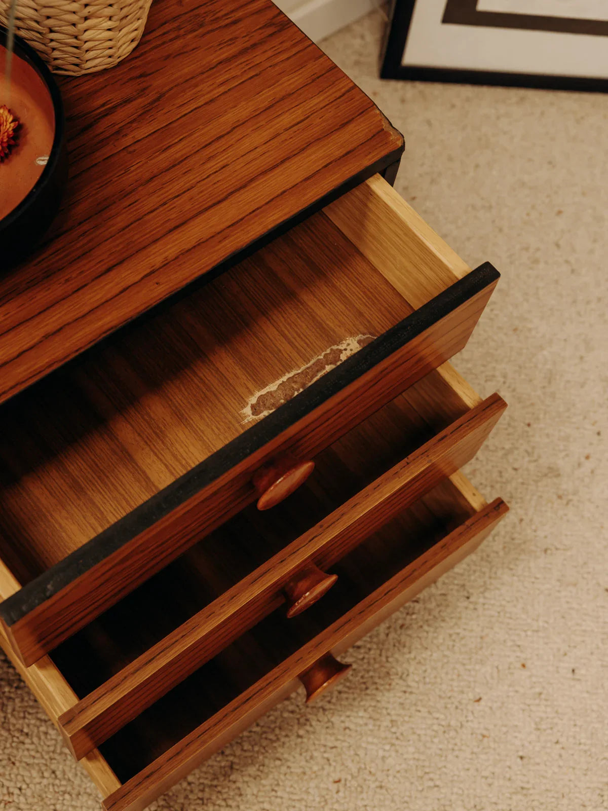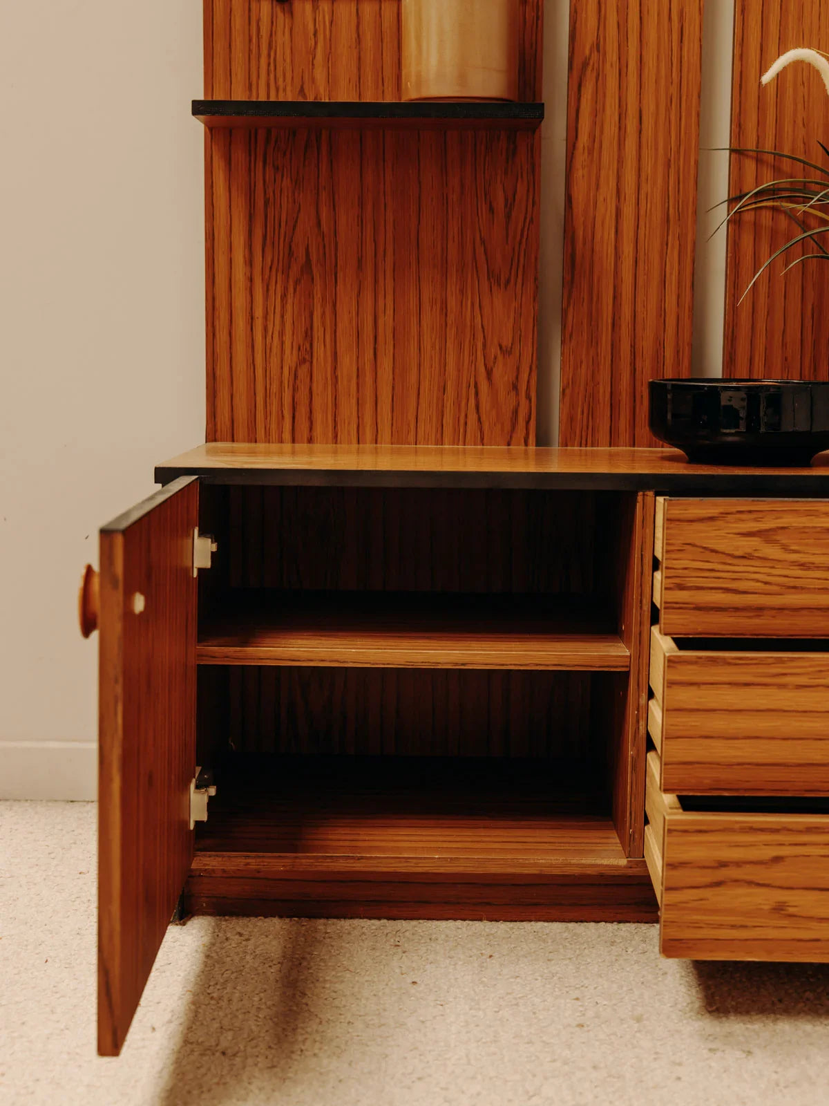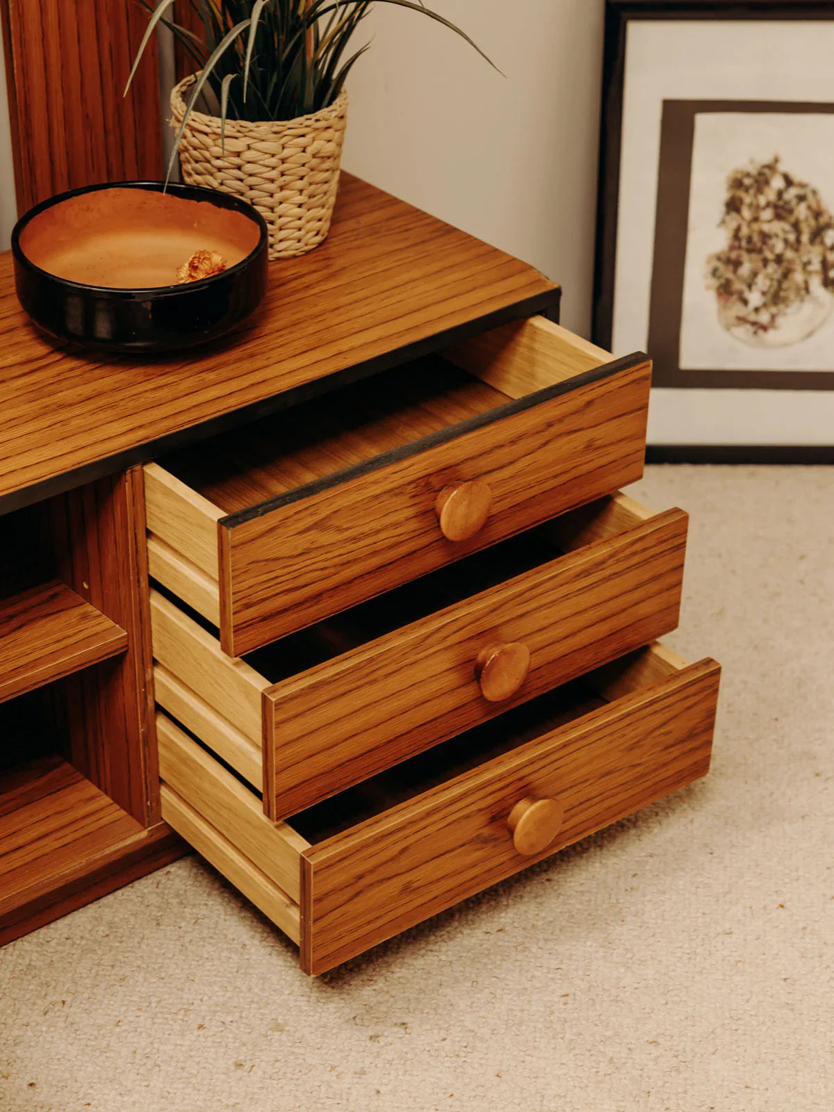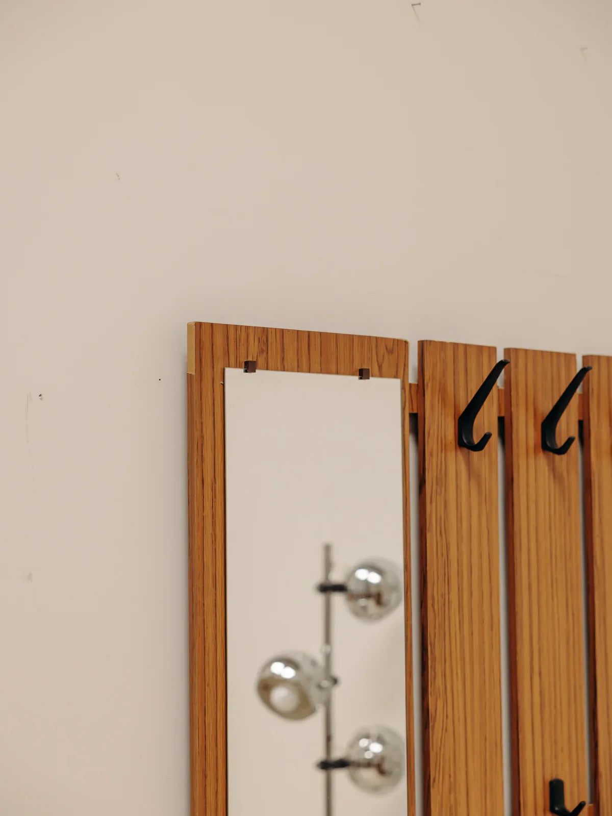 Adoptez ce vestiaire en placage de bois au design rétro, équipé d'un miroir intégré surmonté d'un petit plateau, de patères en partie haute et basse, et de trois tiroirs ainsi qu'un placard pour organiser vêtements et accessoires; son gabarit élancé s'intègre idéalement dans une entrée ou une chambre, apportant chaleur et fonctionnalité grâce à la teinte boisée et aux rangements pensés; manques de placage et accroc sur un côté.
