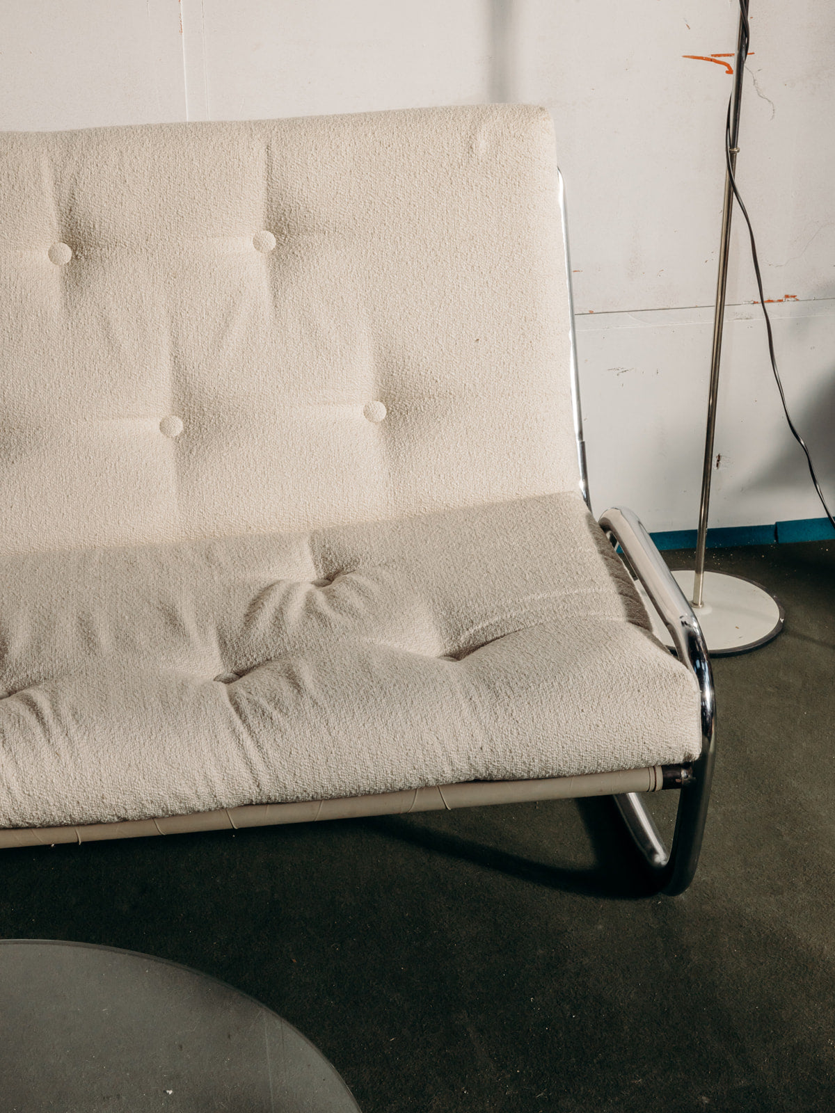 Découvrez notre élégante petite banquette au design moderne. Sa structure tubulaire en chromé associe robustesse et légèreté, tandis que son assise et son dossier en tissu crème offrent un confort optimal. Le dossier incurvé ajoute une touche contemporaine et esthétique, parfaite pour sublimer votre intérieur. Idéale pour un salon, un hall d’entrée ou un bureau, cette banquette allie praticité et style avec finesse. Légères traces du temps sur la toile d'origine.