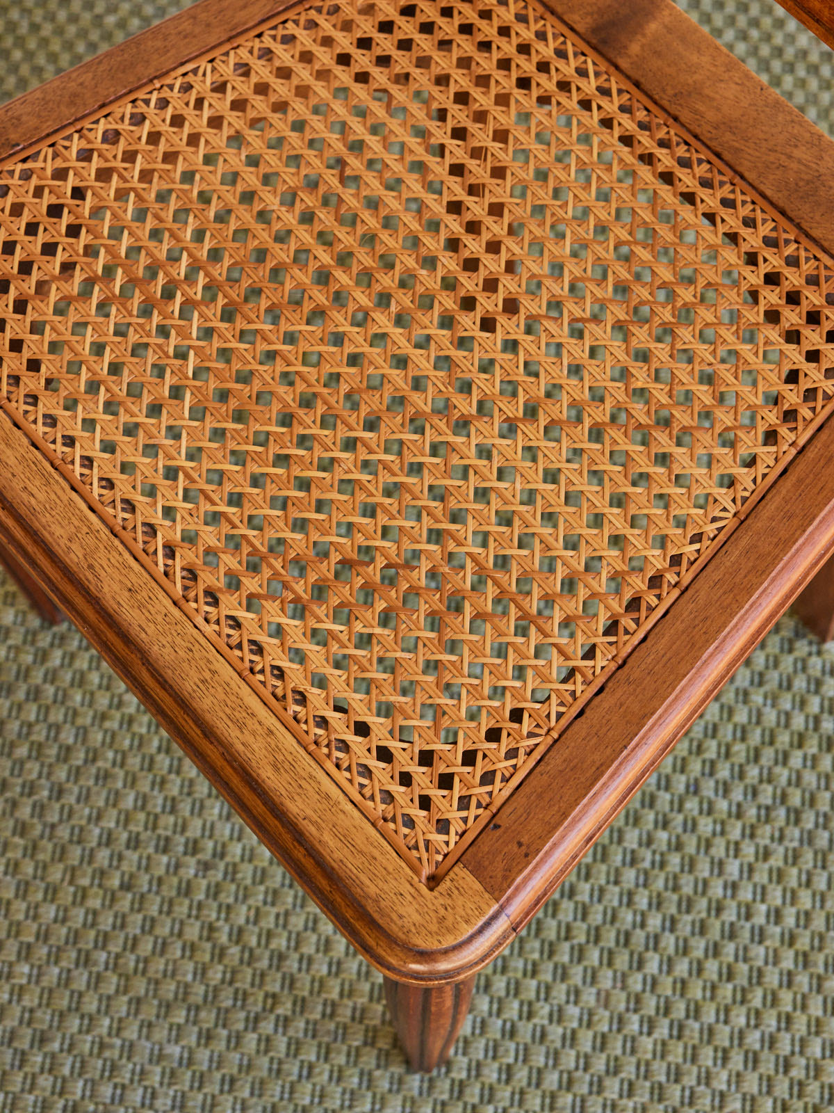Invitez l'élégance des années 1930 avec ce lot de six chaises Art déco en bois, aux pieds finement sculptés et assises en osier cannelé soigneusement rénovées. Leur proportion équilibrée et leur assise tressée offrent un confort naturel, idéal autour d'une table de repas ou pour aménager un coin bistrot chaleureux. La patine du bois et la texture de l'osier créent une atmosphère accueillante et raffinée, parfaite pour une salle à manger au caractère affirmé. La table assortie est disponible dans la catégorie Romy.
