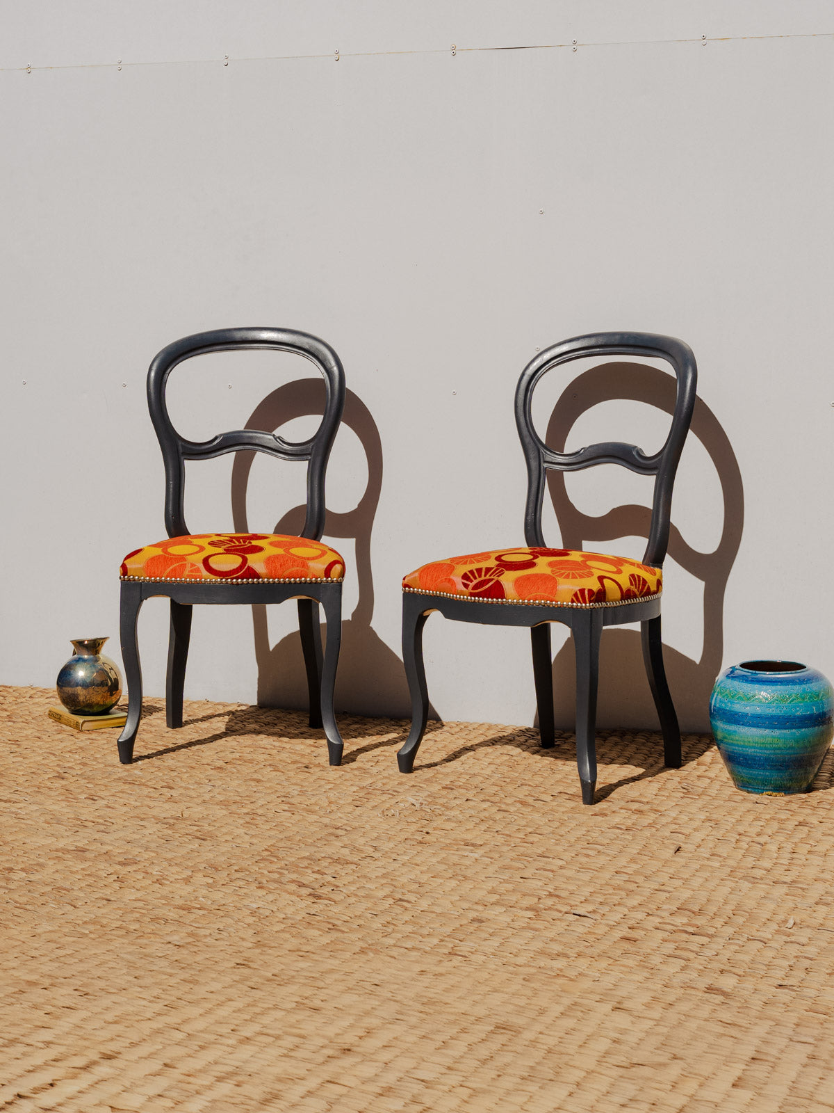 Adoptez cette paire de chaises à la structure en bois noir, où la simplicité de l'ossature met en valeur une assise cloutée recouverte d'un tissu à motif aux nuances jaune, orange et bordeaux. Leur silhouette s'intègre facilement autour d'une table à manger ou comme fauteuils d'appoint, offrant confort et présence sans encombrer l'espace. Le contraste des matériaux — bois sombre et textile coloré — apporte une touche chaleureuse et graphique à votre intérieur. Quelques traces du temps.