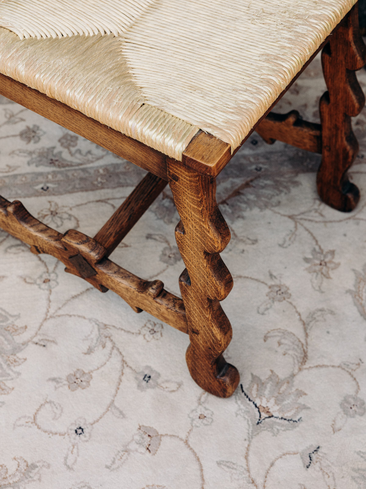 Adoptez cette chaise haute en chêne et paille au bois foncé, qui dégage une allure chaleureuse et authentique. Ses proportions élancées la rendent idéale pour un bar ou un plan de travail, apportant une note rustique et élégante à une cuisine ou un coin repas. L'assise en paille offre un confort naturel et convivial, tandis que la structure en chêne affirme une présence solide et noble. Assise abîmée par le temps.