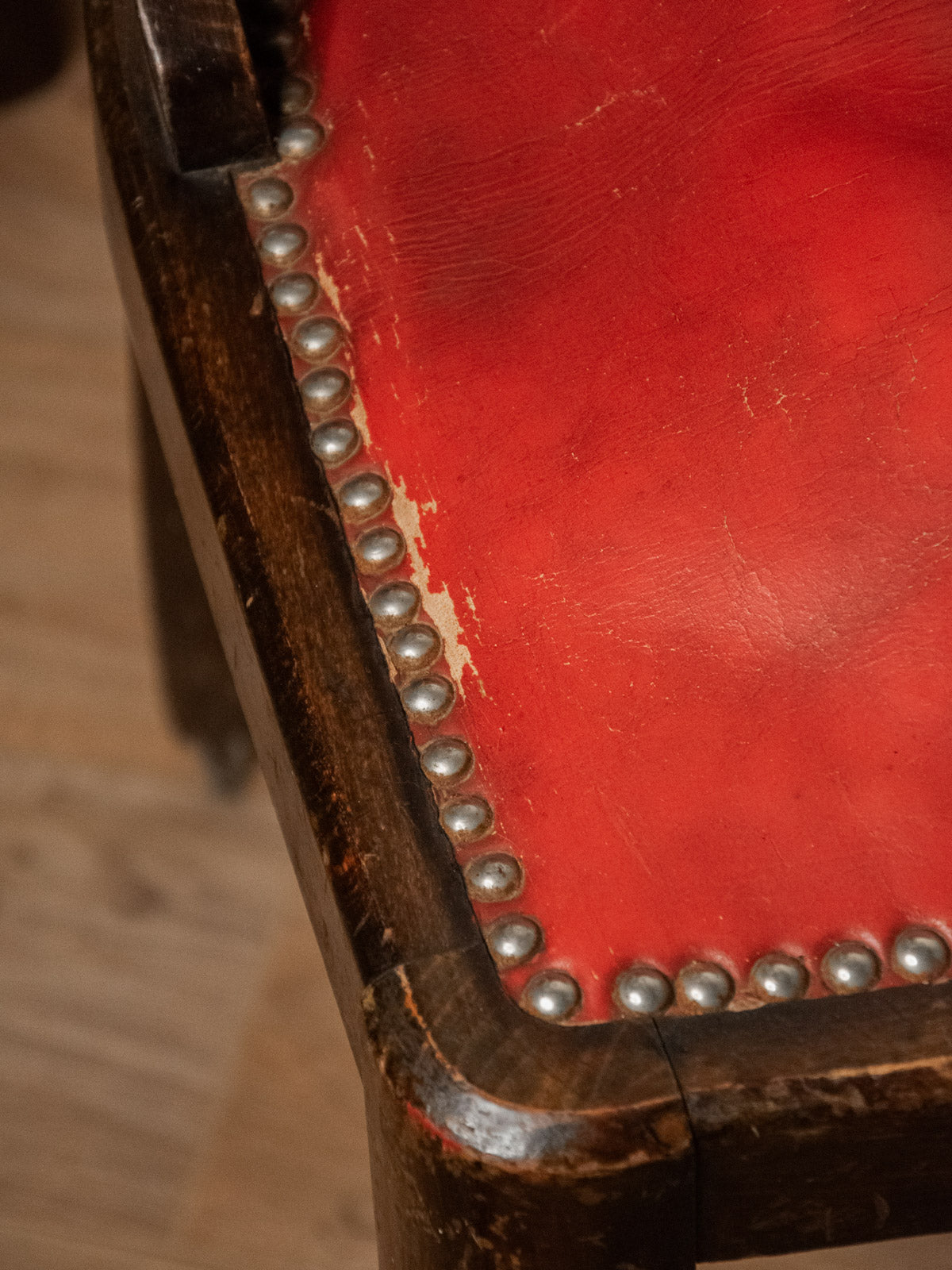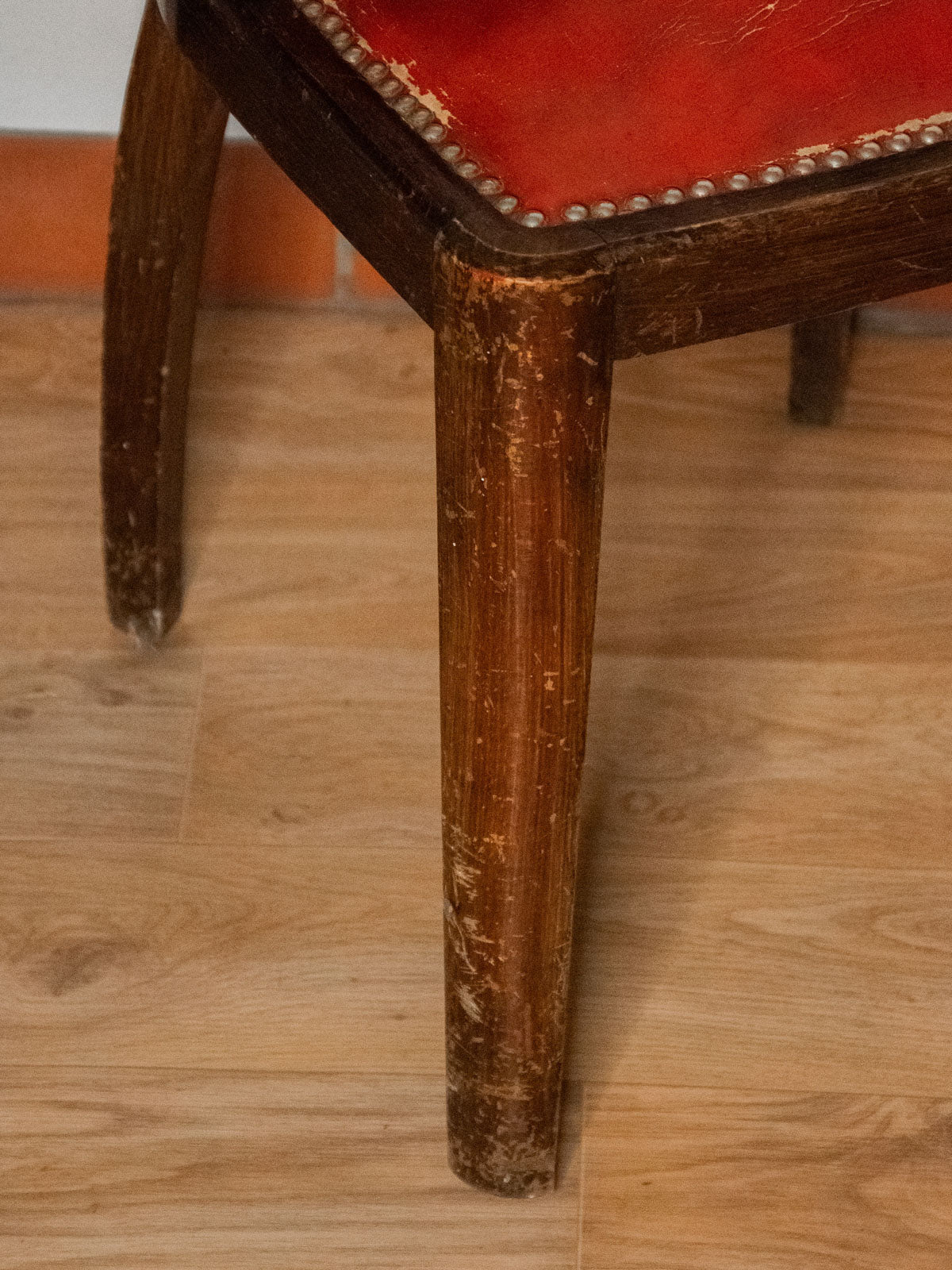 Adoptez ce fauteuil art-déco revêtu d'un cuir rouge clouté, dont le dossier aux rebords arrondis évoque une élégance rétro. L'assise, soutenue par des ressorts, promet un confort ferme et durable, tandis que la structure en bois révèle des lignes chaleureuses et sculpturales, idéale pour un salon ou une salle à manger en quête de caractère. Les proportions compactes le rendent facile à intégrer comme chaise d'appoint ou pièce maîtresse. Traces du temps sur le bois et le cuir.