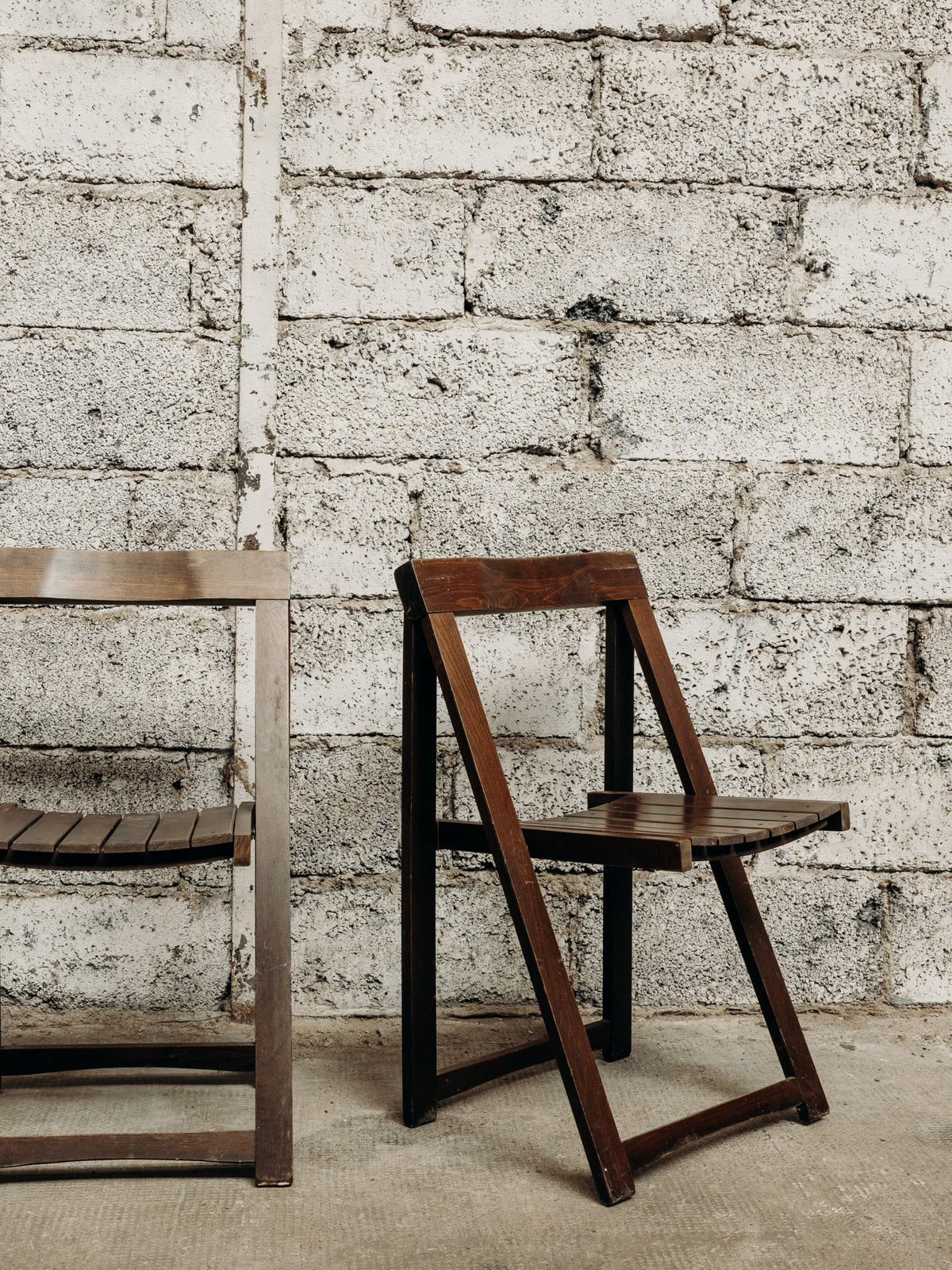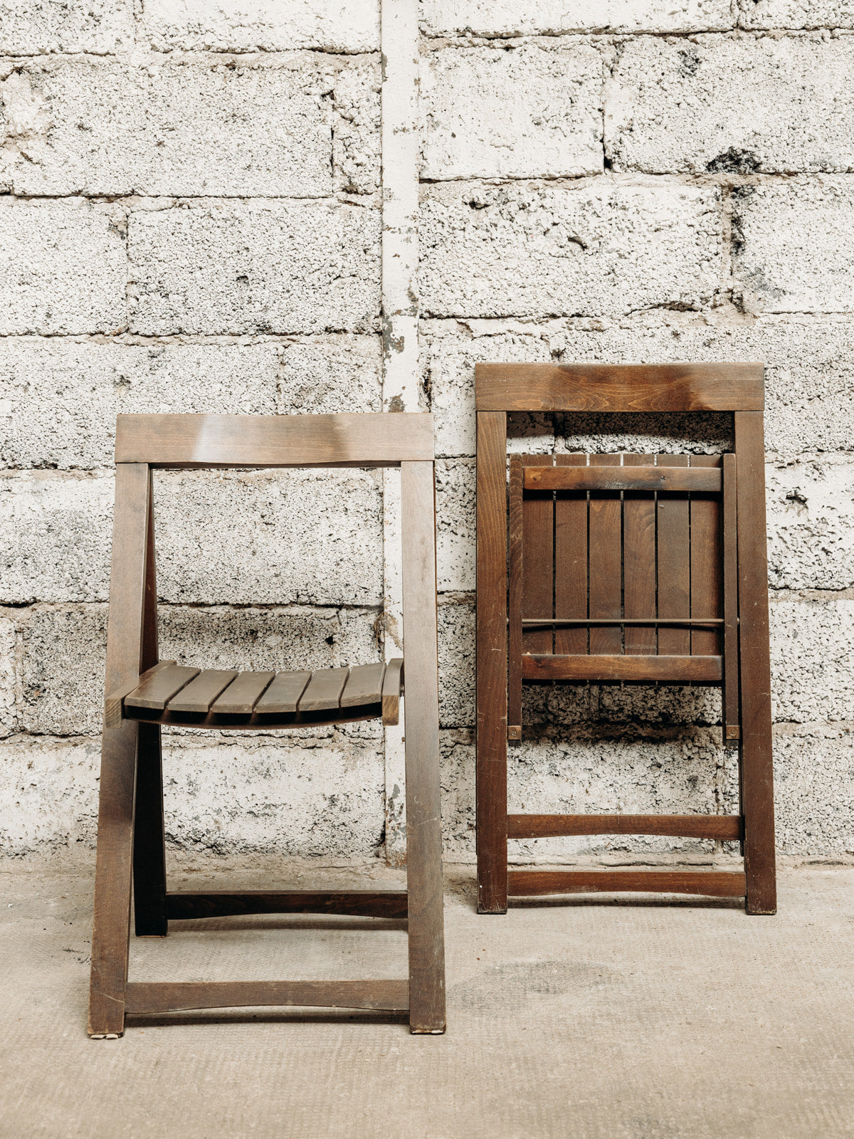 Adoptez ces chaises pliantes Trieste signées Aldo Jacober, un duo italien en bois teinté marron foncé au design épuré et élégant. Leur structure pliable et compacte facilite le rangement, tandis que l'assise confortable et la construction robuste assurent une utilisation quotidienne, idéale pour un coin repas, une terrasse abritée ou un salon intimiste. La patine chaleureuse du bois crée une ambiance conviviale et authentique dans tout intérieur. Légères décolorations sur le haut du dossier.