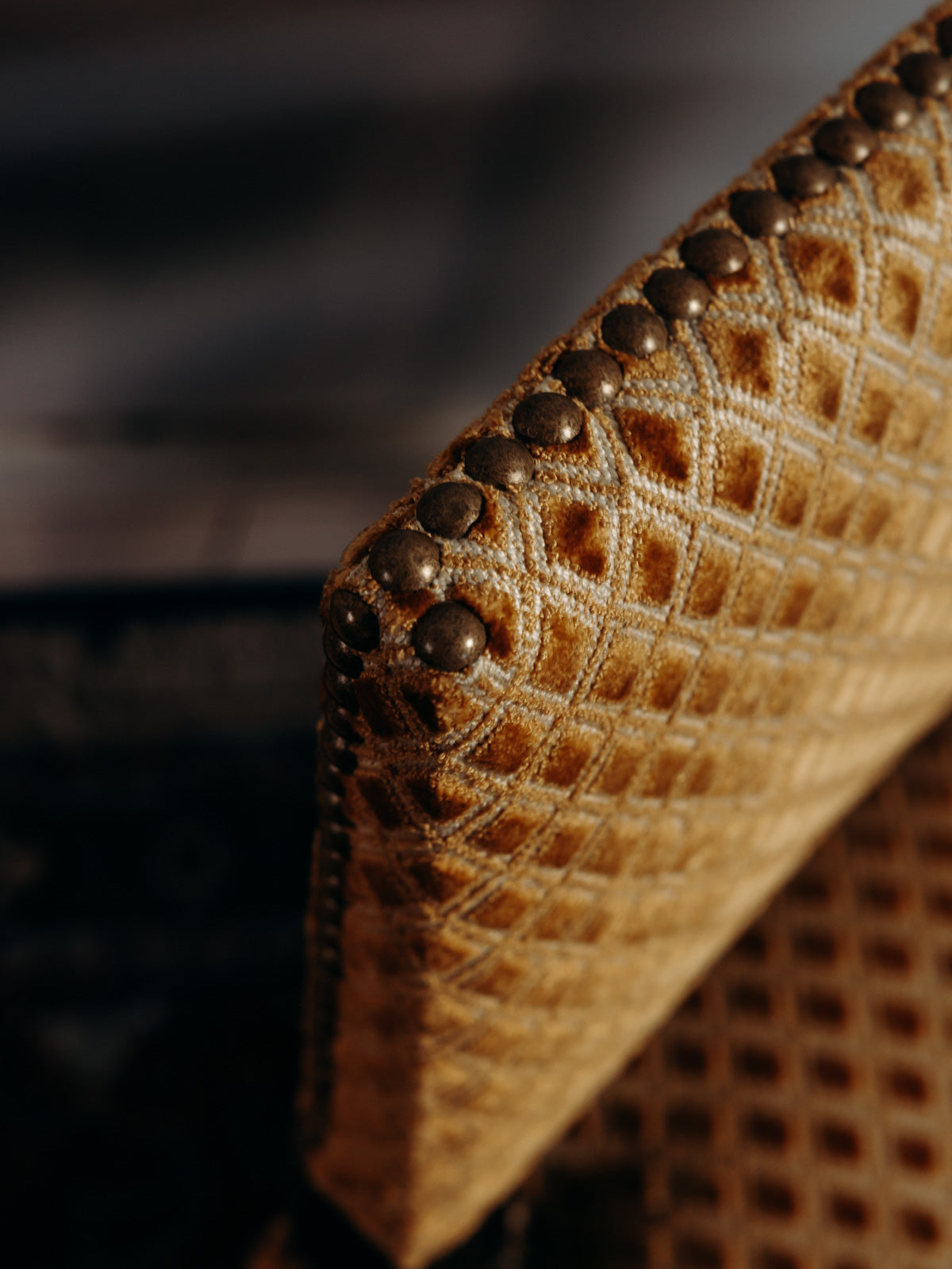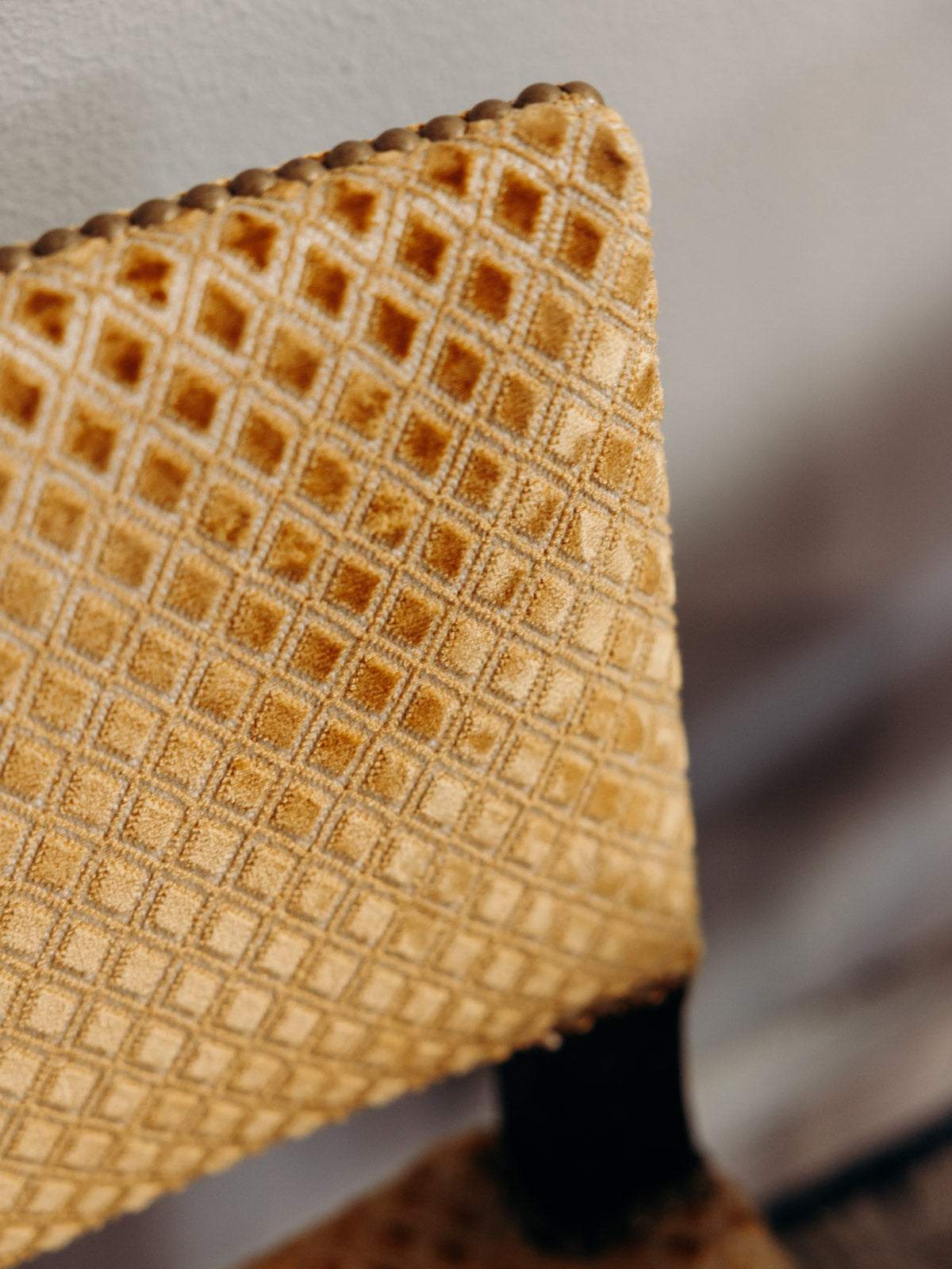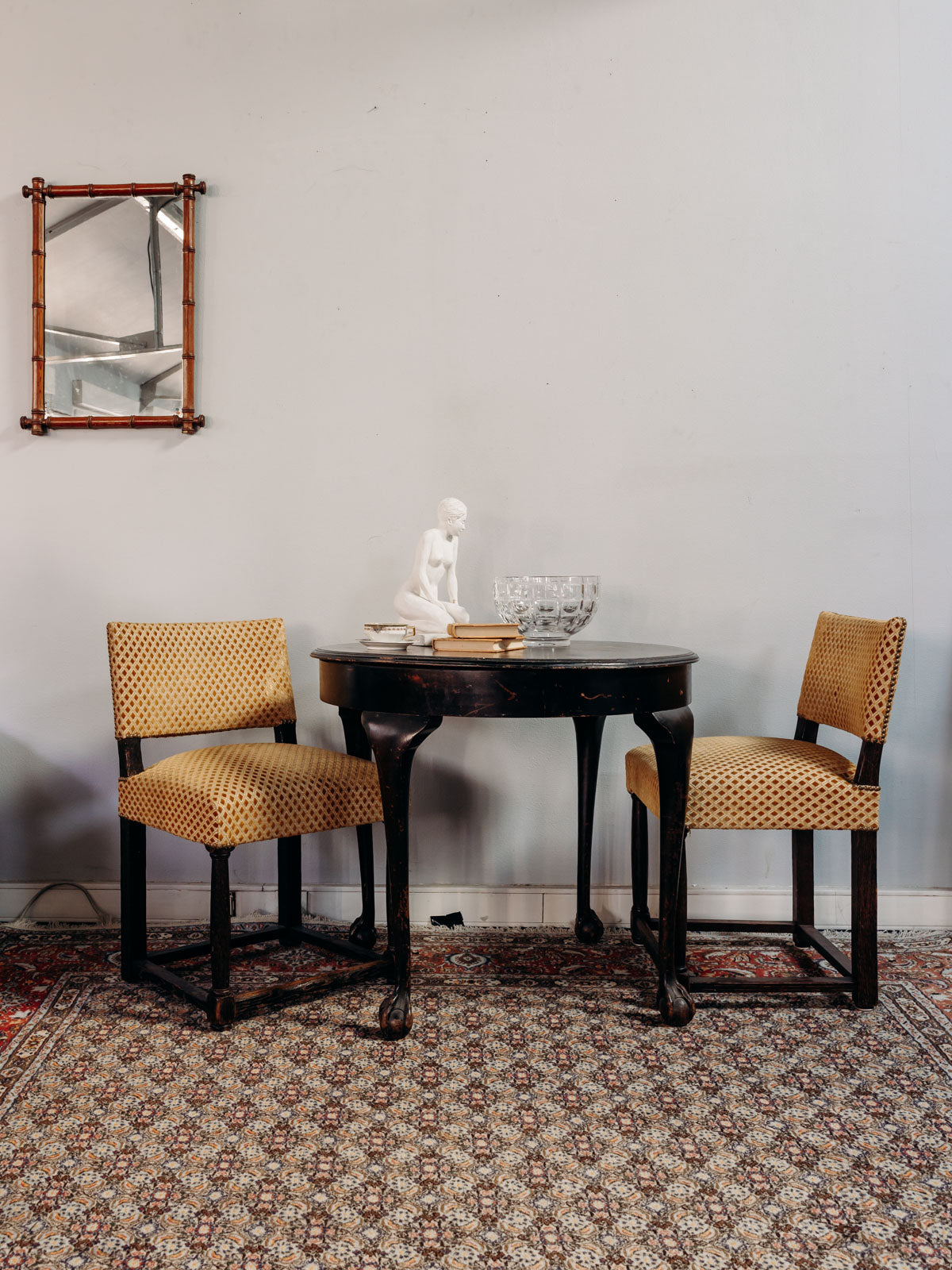 Adoptez une paire de chaises en bois foncé aux lignes généreuses, qui apportent une présence chaleureuse et sobre à votre salle à manger ou coin lecture. Le tissu jaune quadrillé, refait à neuf, illumine l'ensemble et souligne l'alliance du classicisme du bois et d'une note contemporaine. L'assise moelleuse et le dossier confortable invitent à la détente, tandis que les barres de liaison basses assurent une structure stable et élégante, idéale pour un usage quotidien. Vendues en paire, deux quantités sont disponibles.