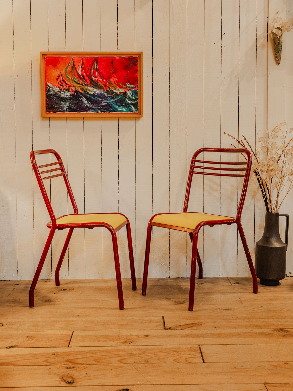 Apportez une touche bistro chic avec cette paire de chaises en métal ,esprit Tolix, associant dossier et pieds bordeaux à une assise en skaï jaune pour un contraste chaleureux et graphique. Leur profil élancé et leur format s'intègrent facilement autour d'une table de cuisine ou dans un coin repas. Solides et au style industriel revisité, elles animent aussi bien un intérieur urbain qu'une terrasse abritée.